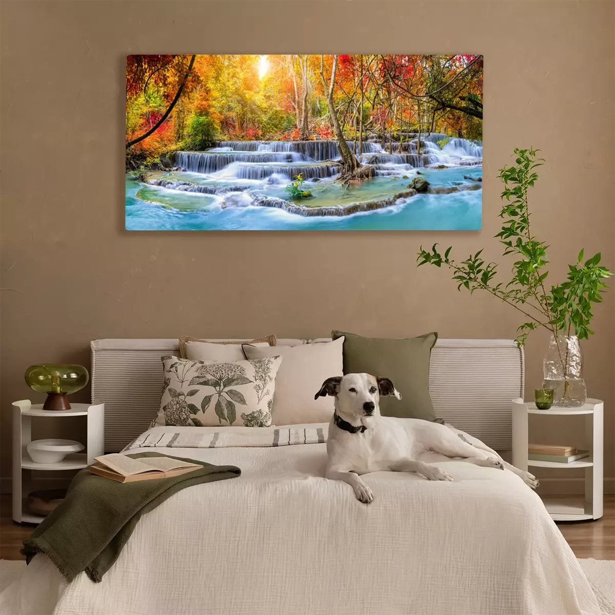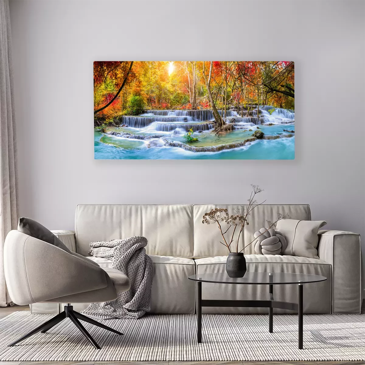 Tableau : Une cascade majestueuse dans un paysage automnal