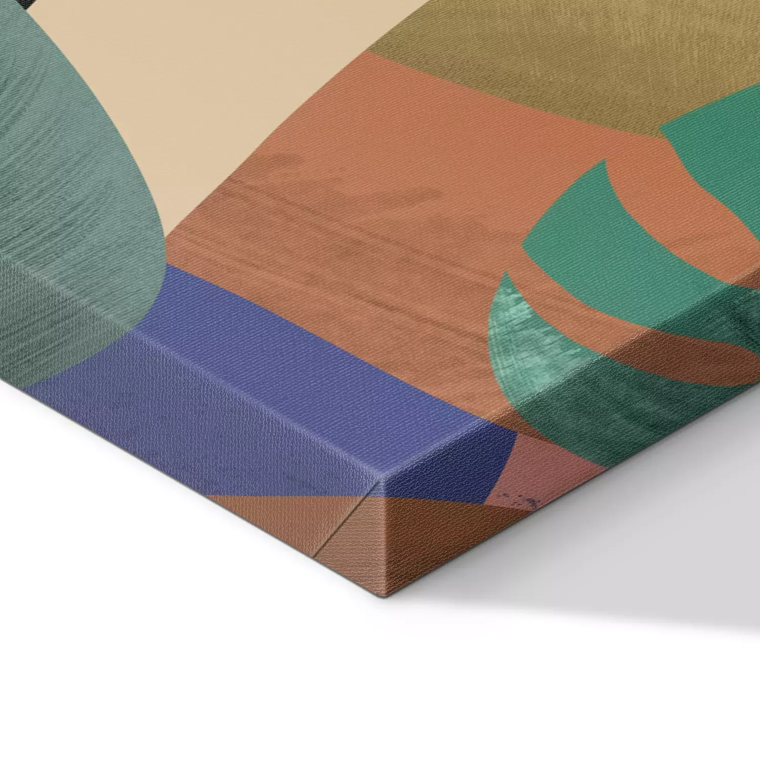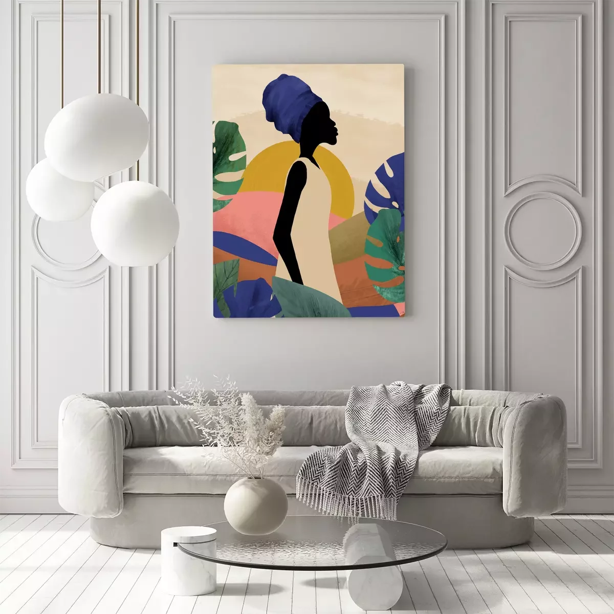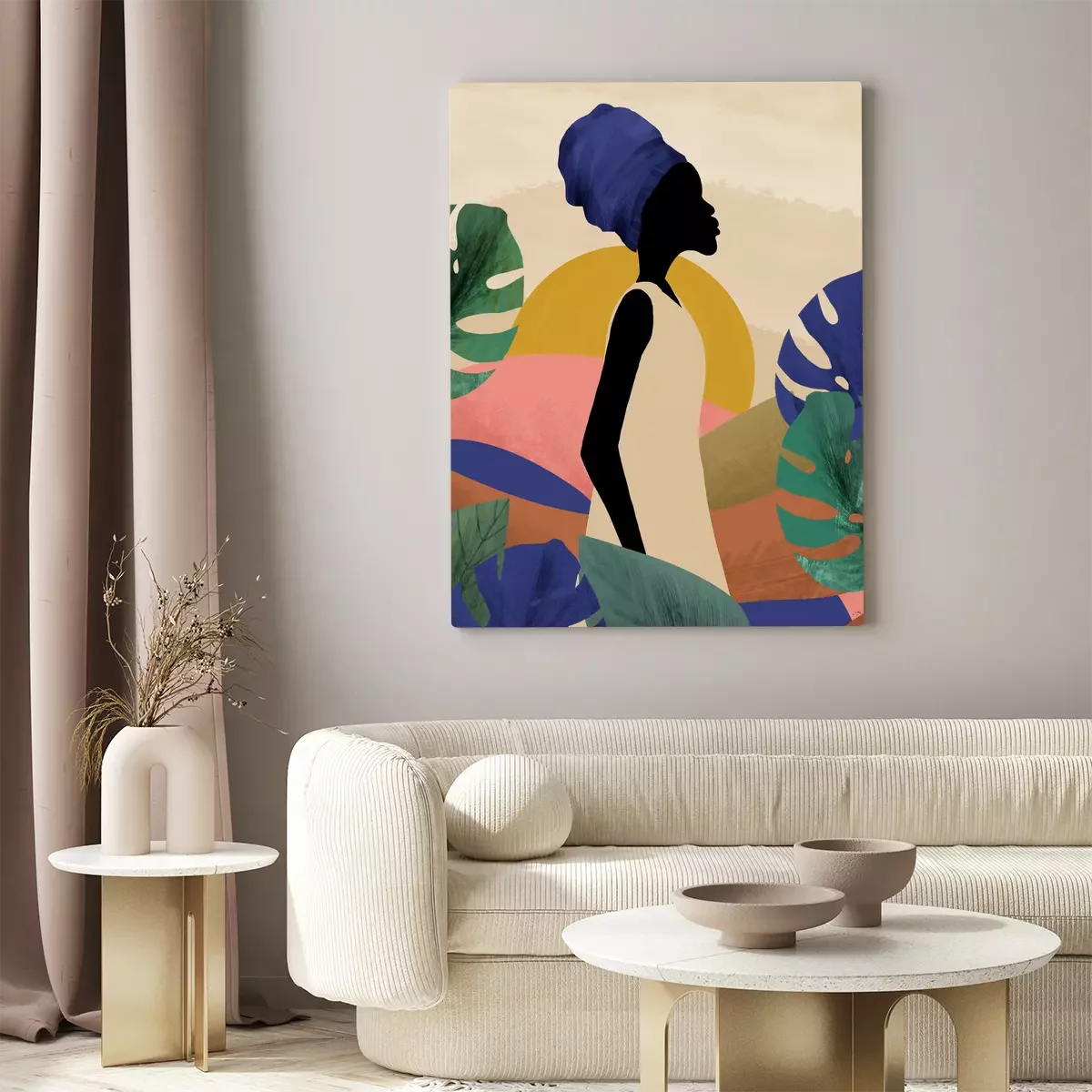 Une femme noire portant un turban se détachant sur un fond de feuilles.