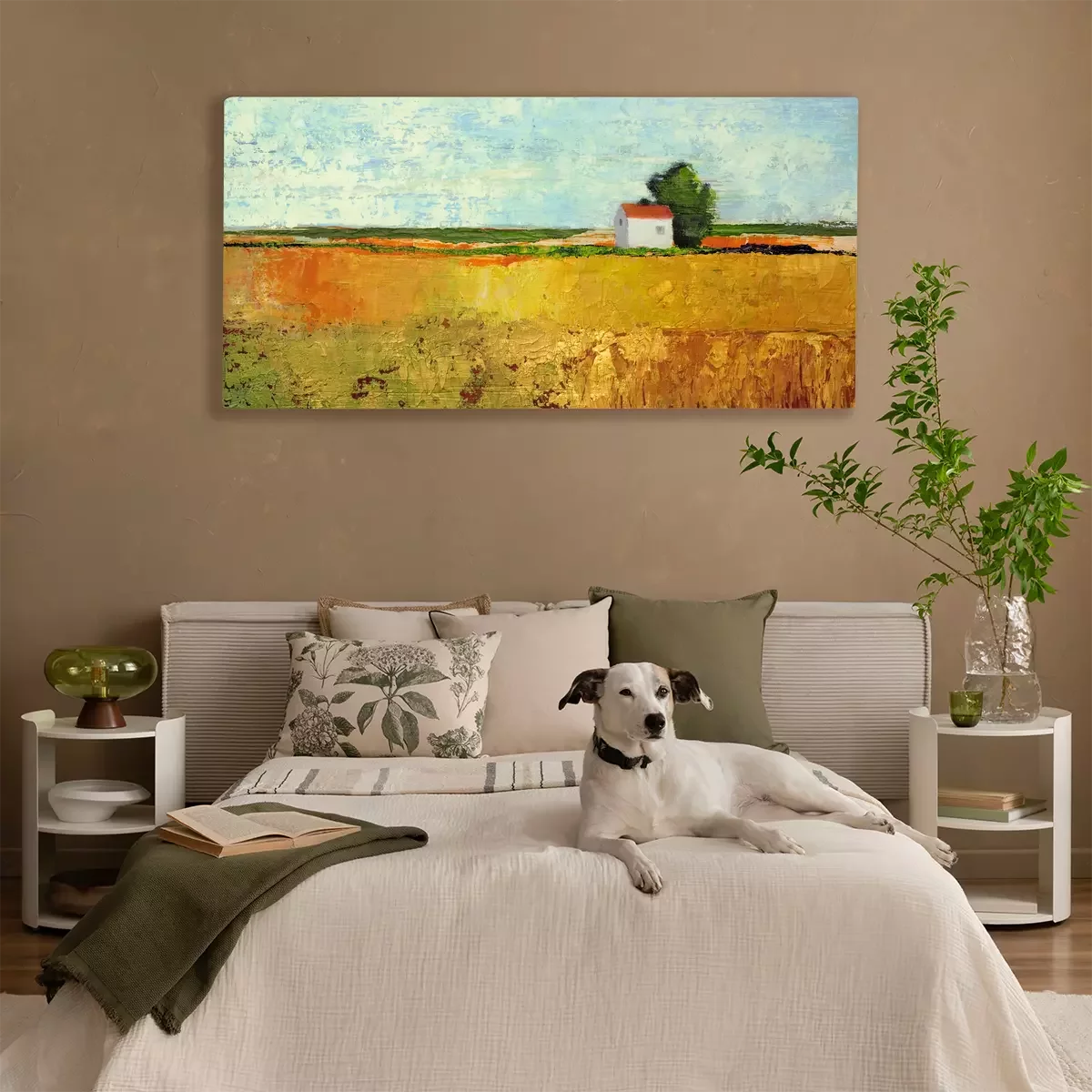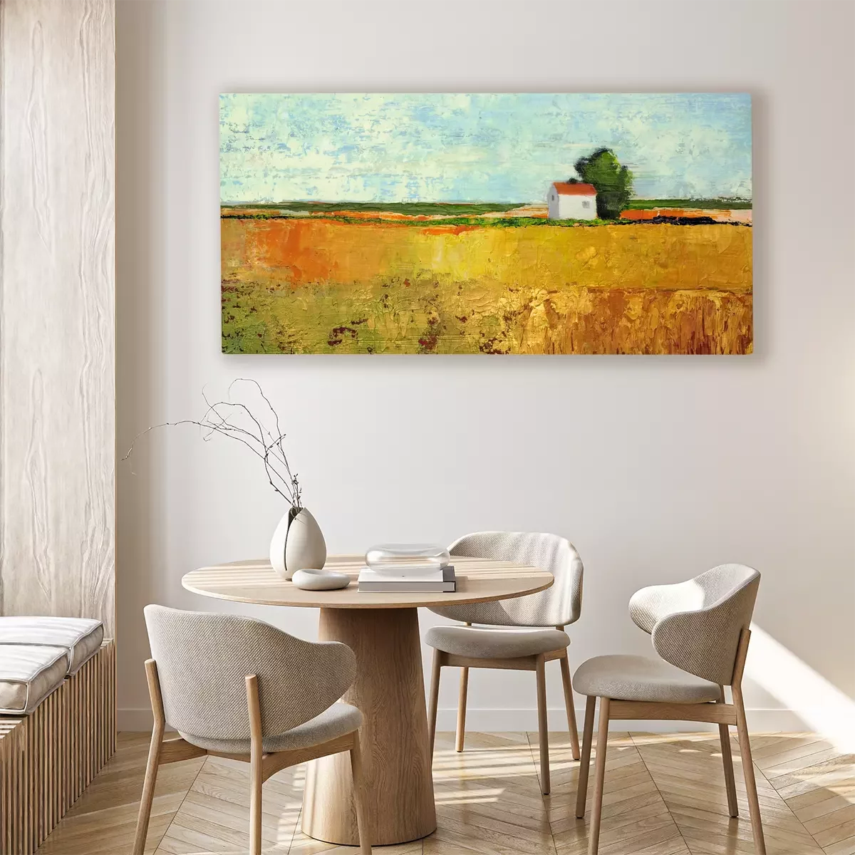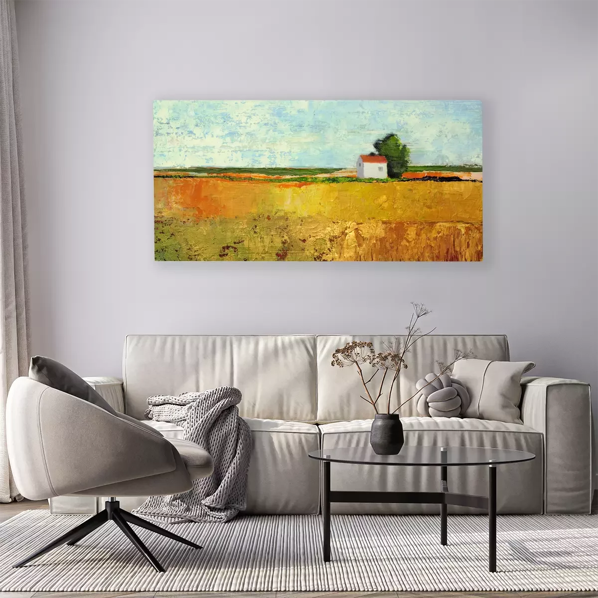 Une maison blanche jouxte un champ de céréales mûres.