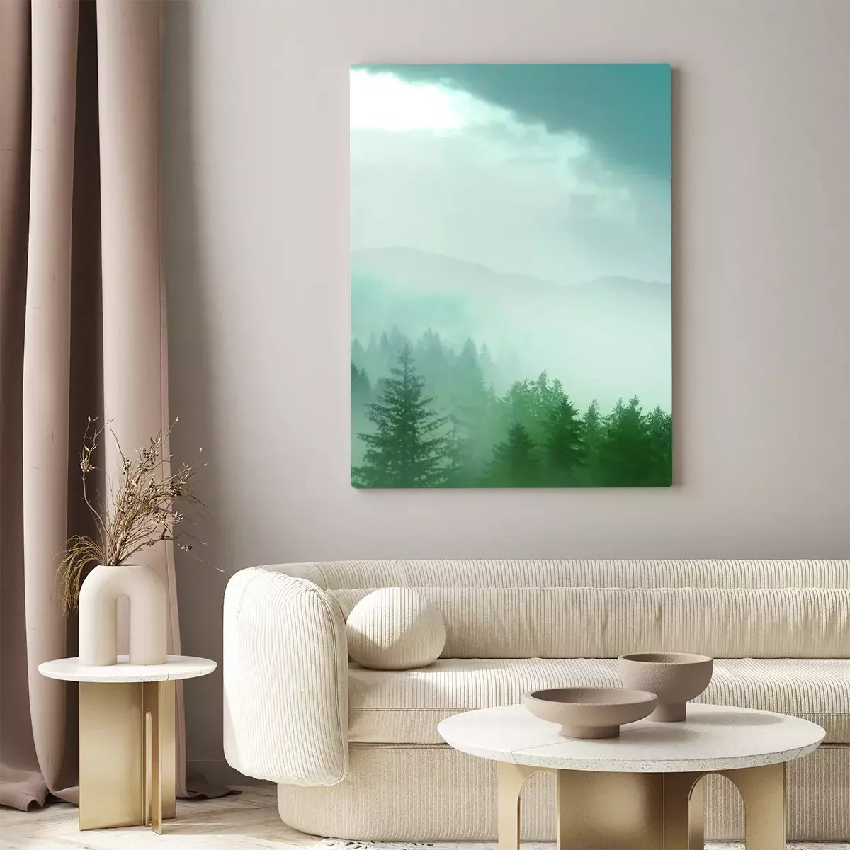 Une mystérieuse forêt d'épicéas enveloppée d'un épais brouillard