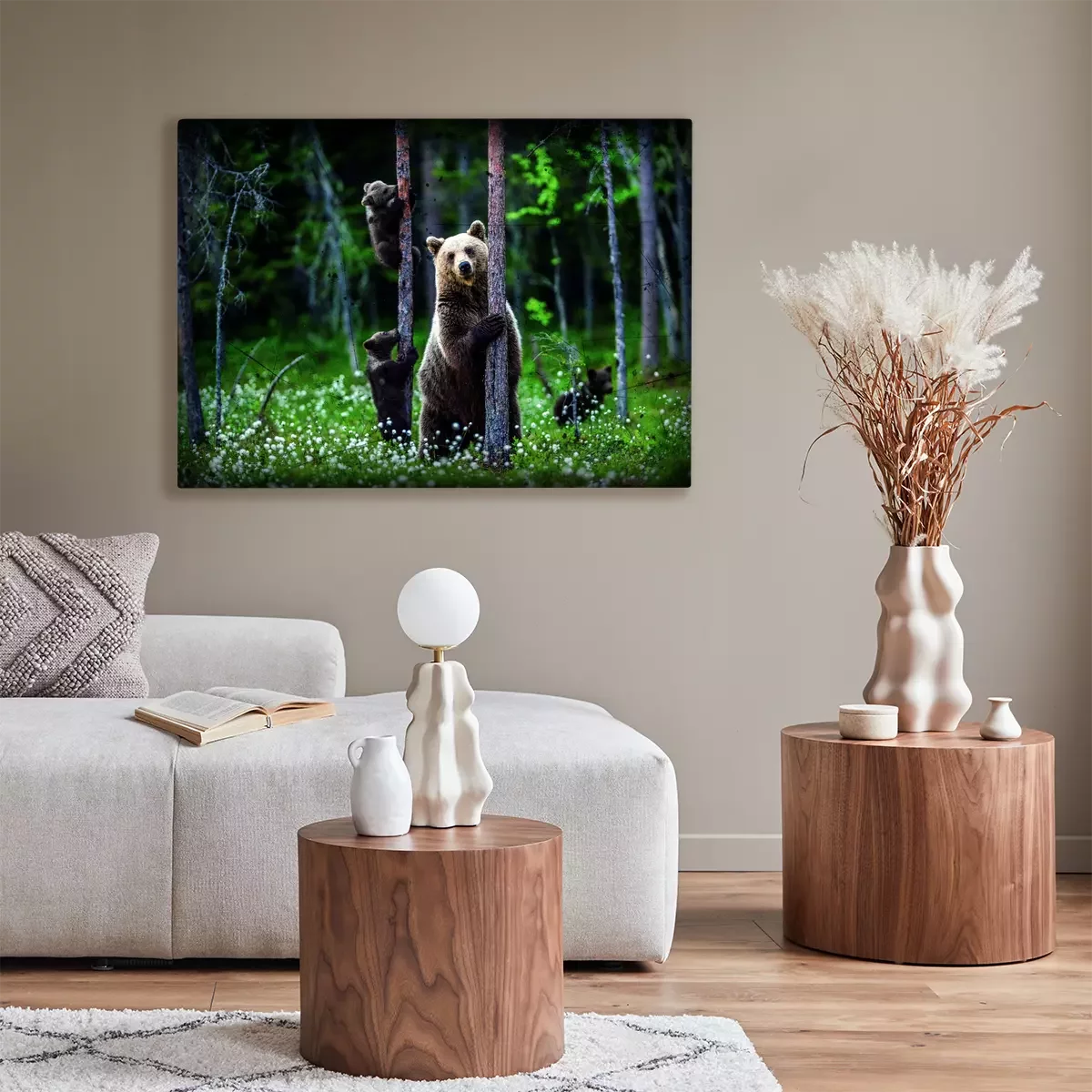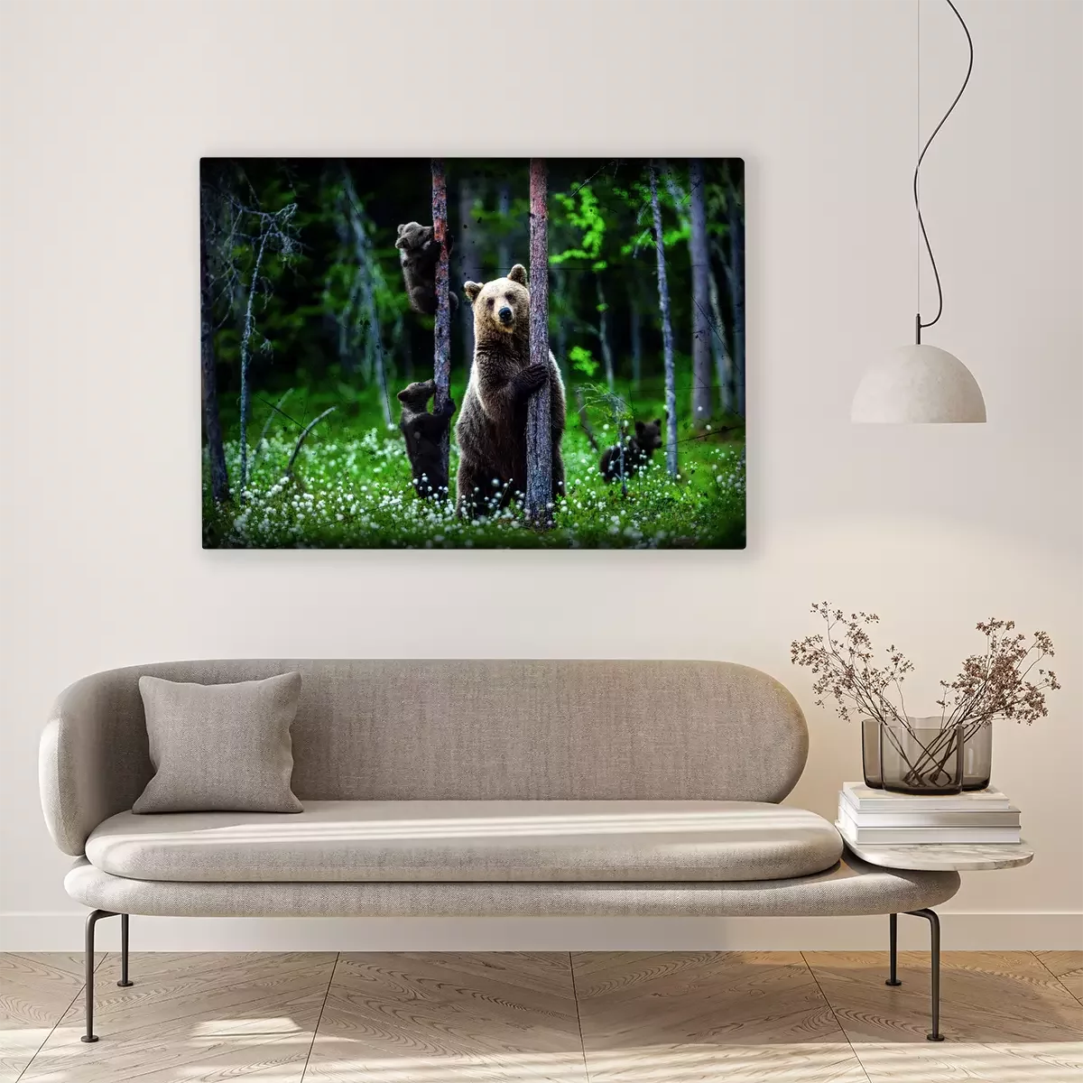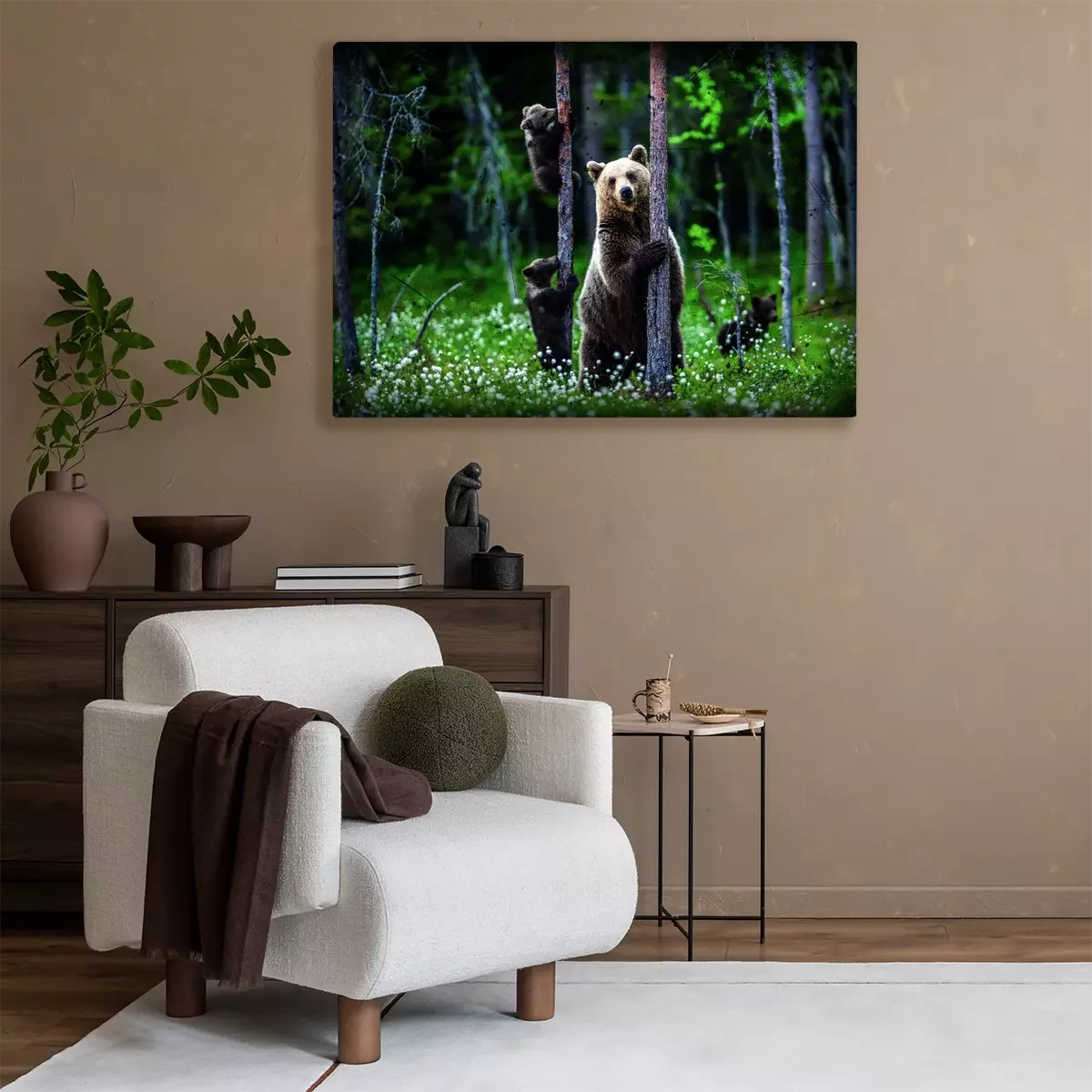Une ourse adulte se promène avec ses petits parmi les arbres.