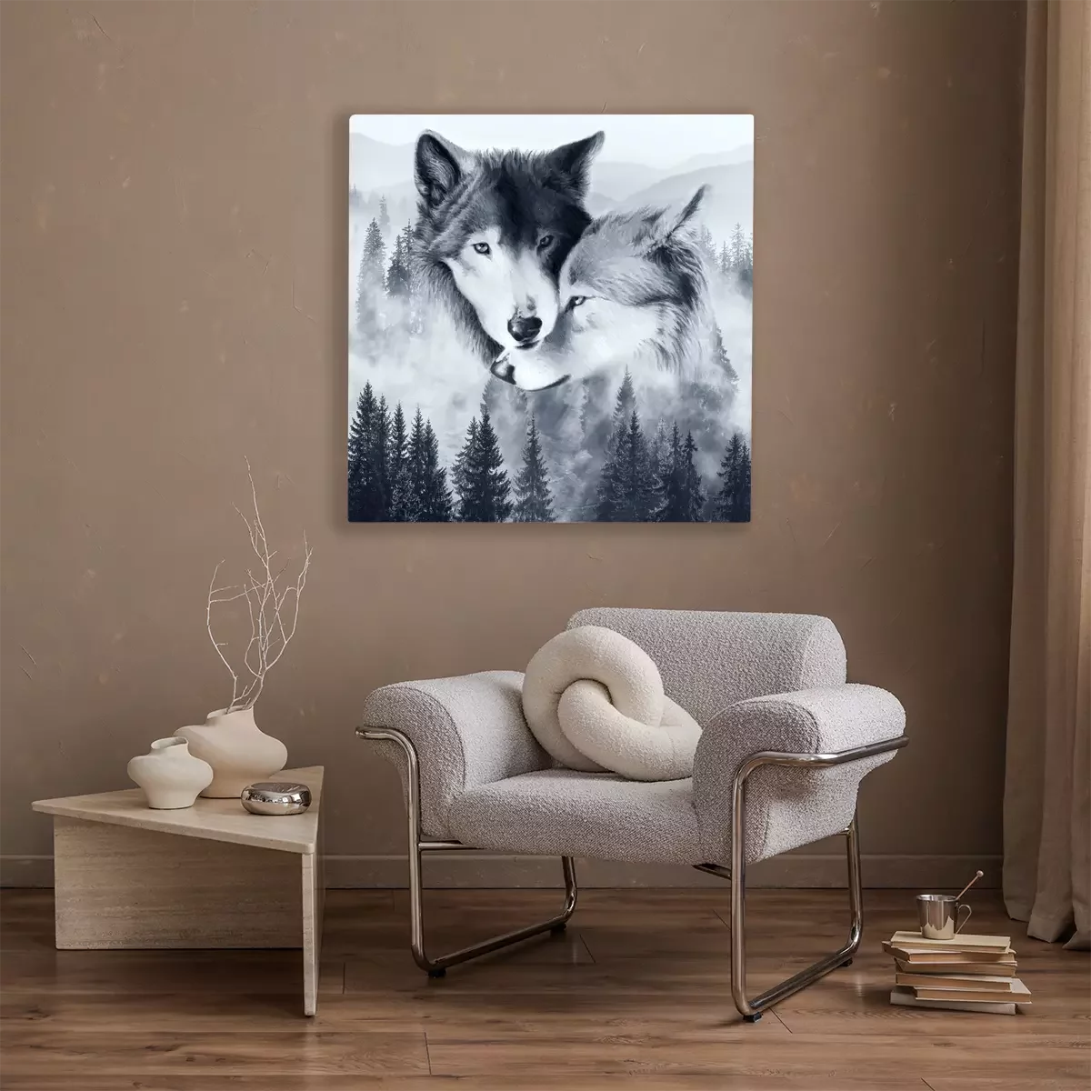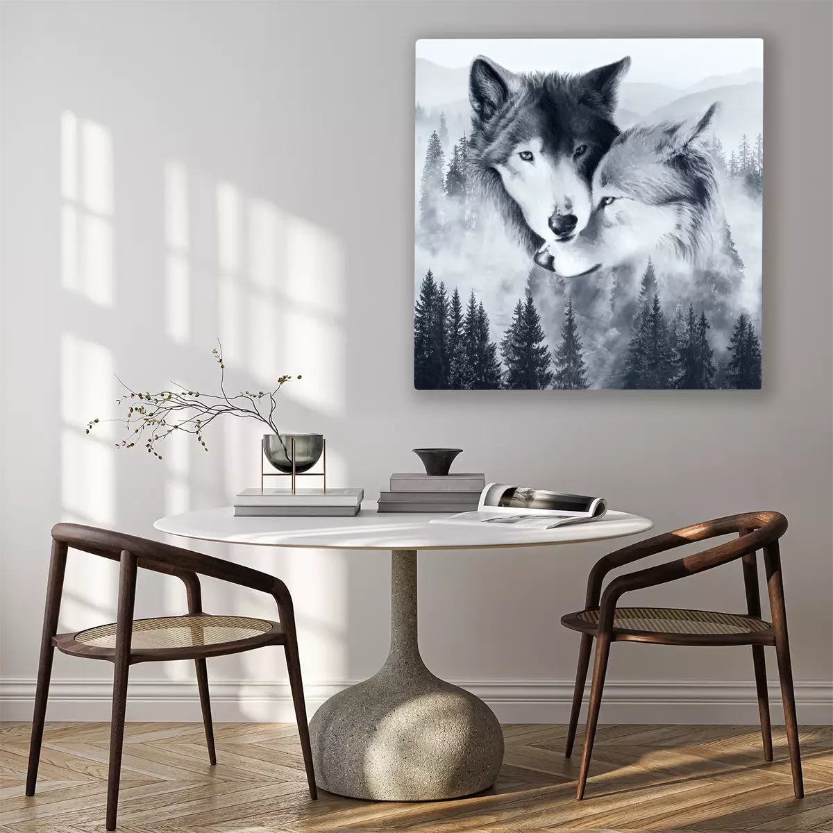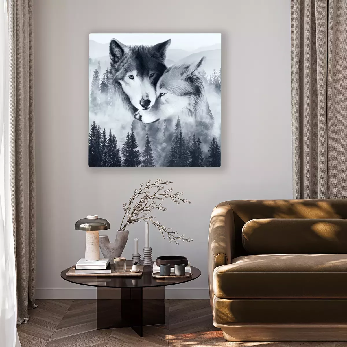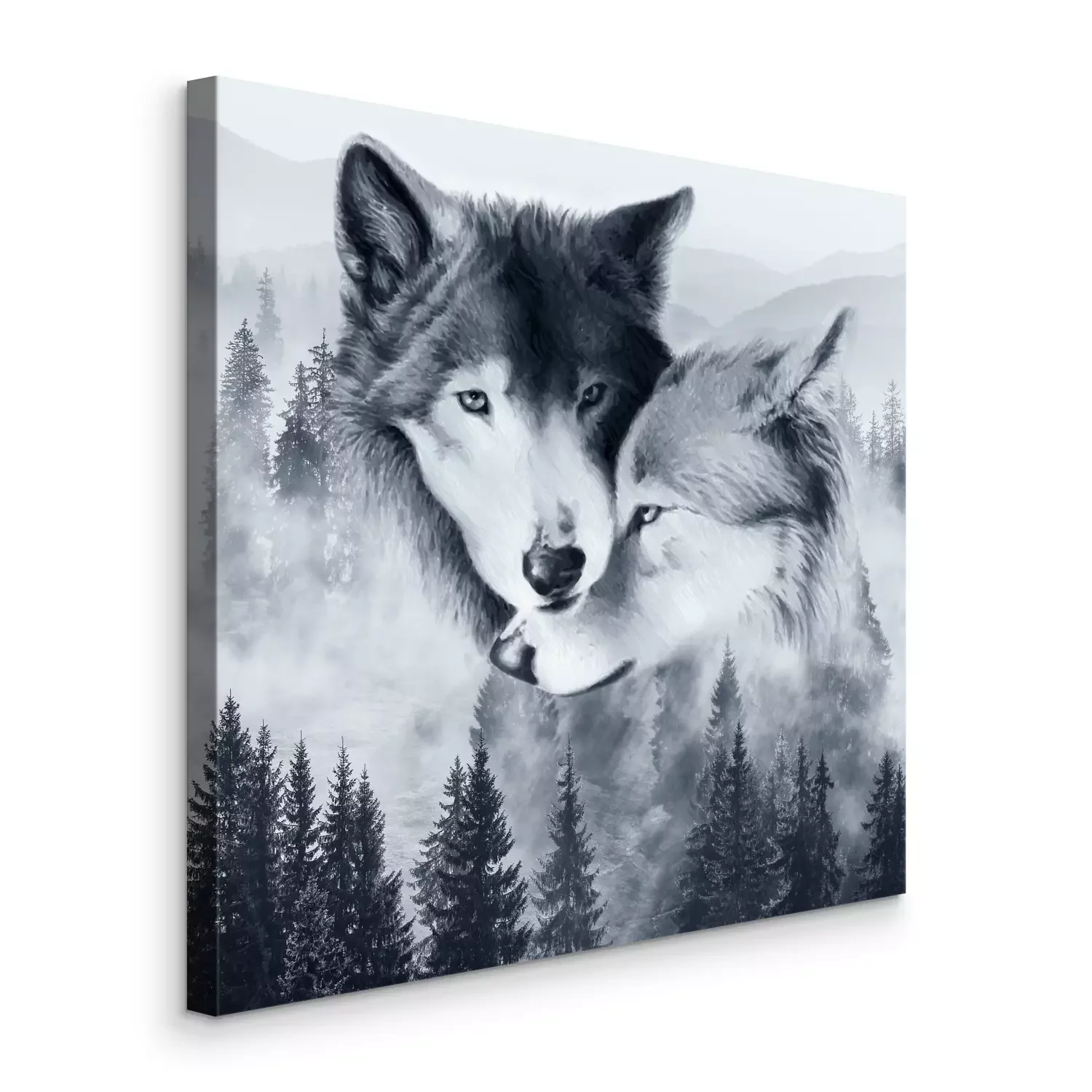 Tableau : Une paire de loups sur fond de paysage forestier brumeux