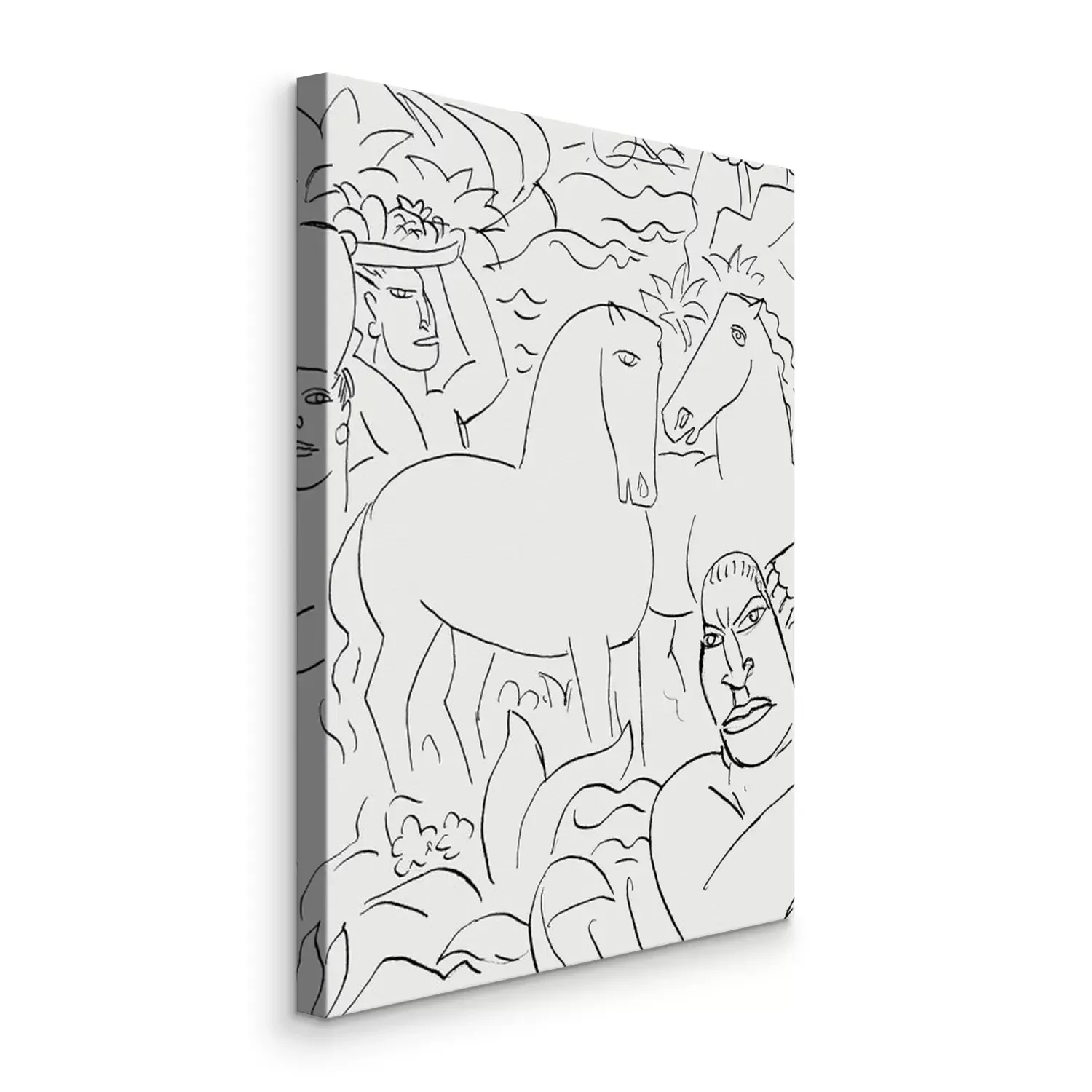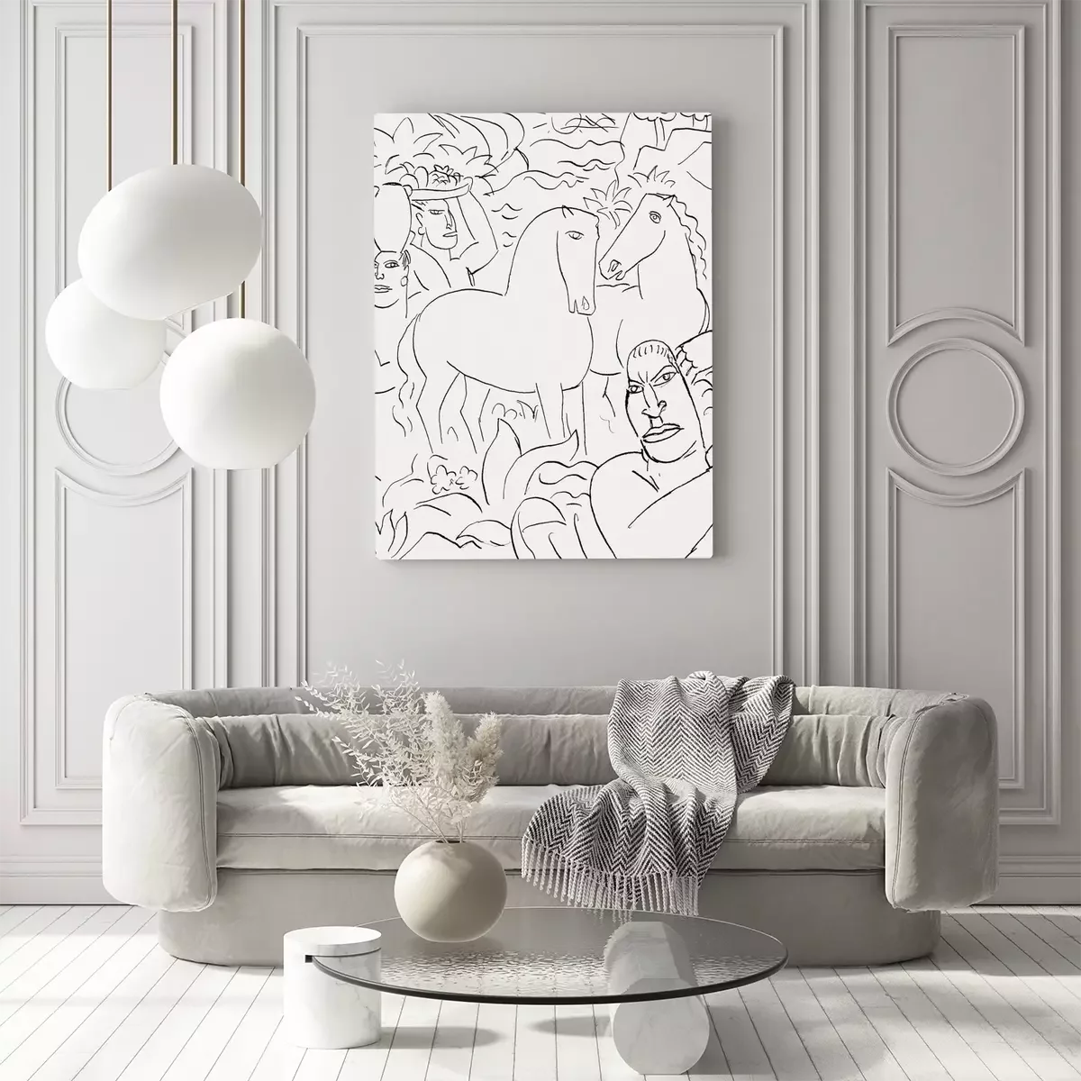 Une silhouette tenant une cruche et des fruits parmi des chevaux