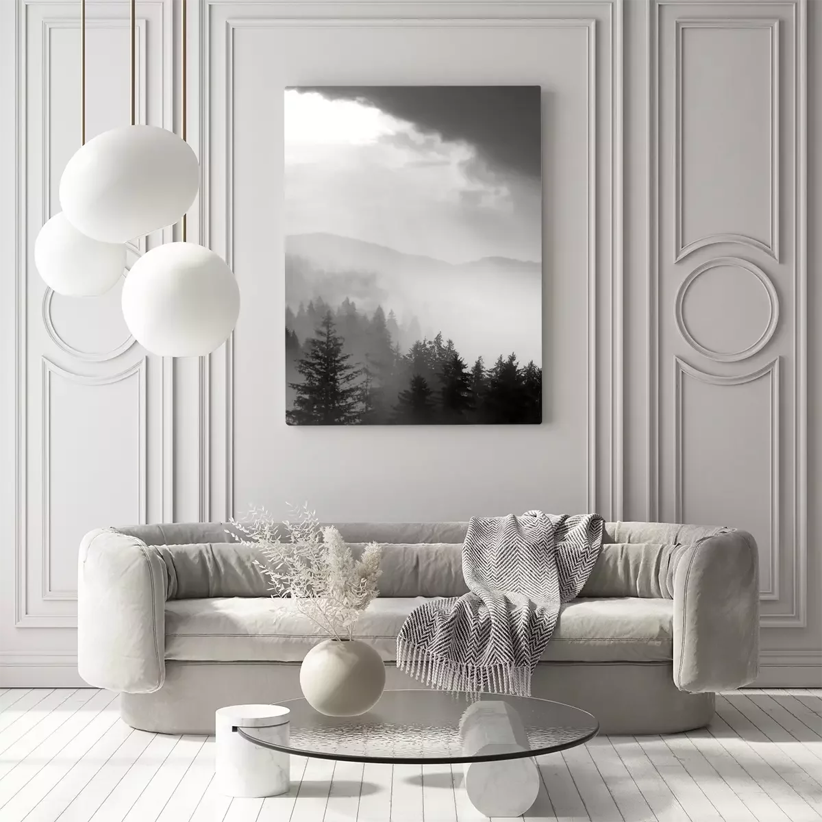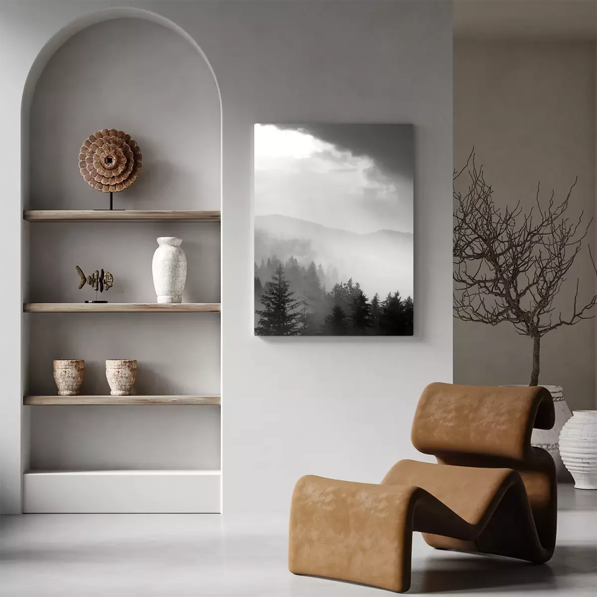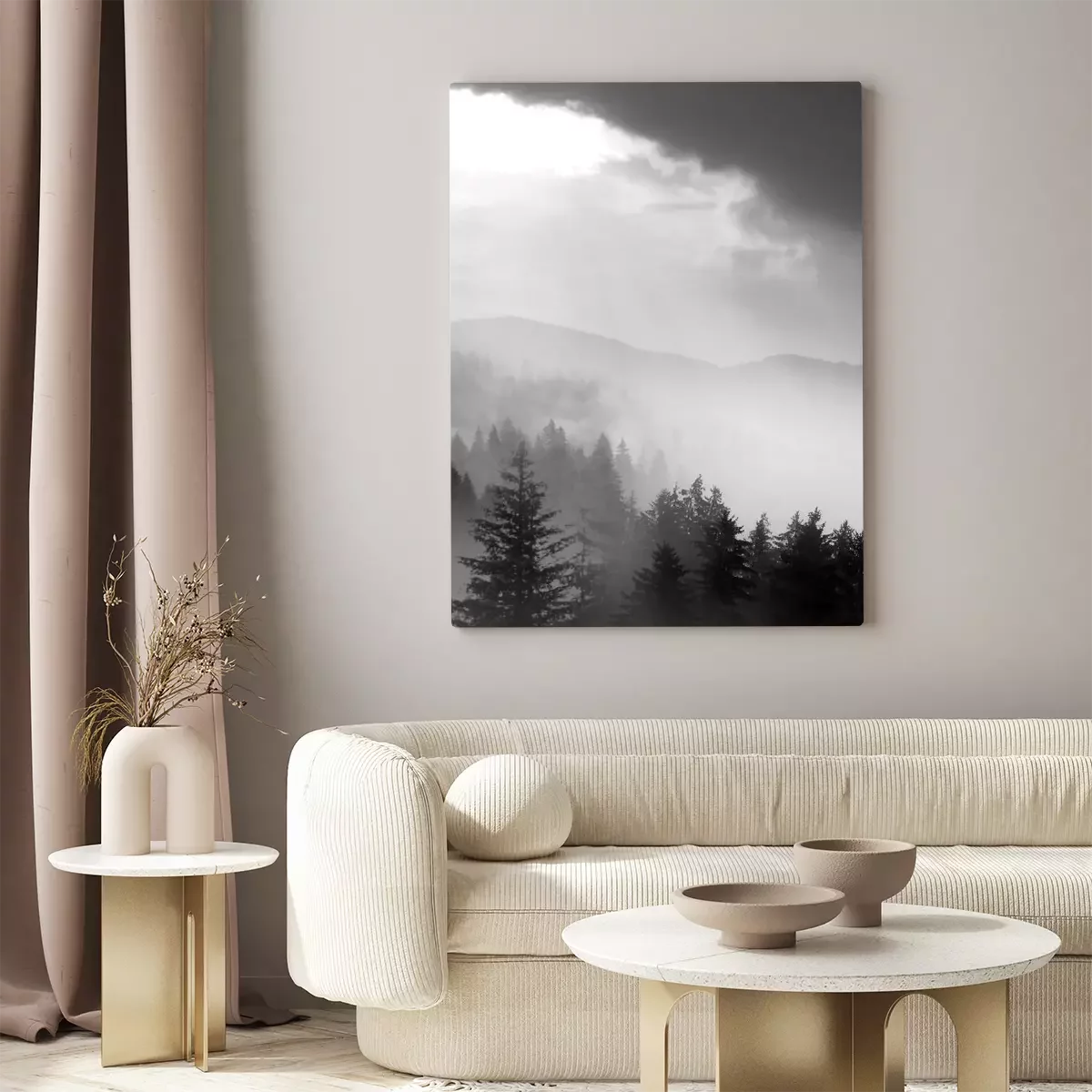 Une sombre forêt de conifères enveloppée d'un épais brouillard