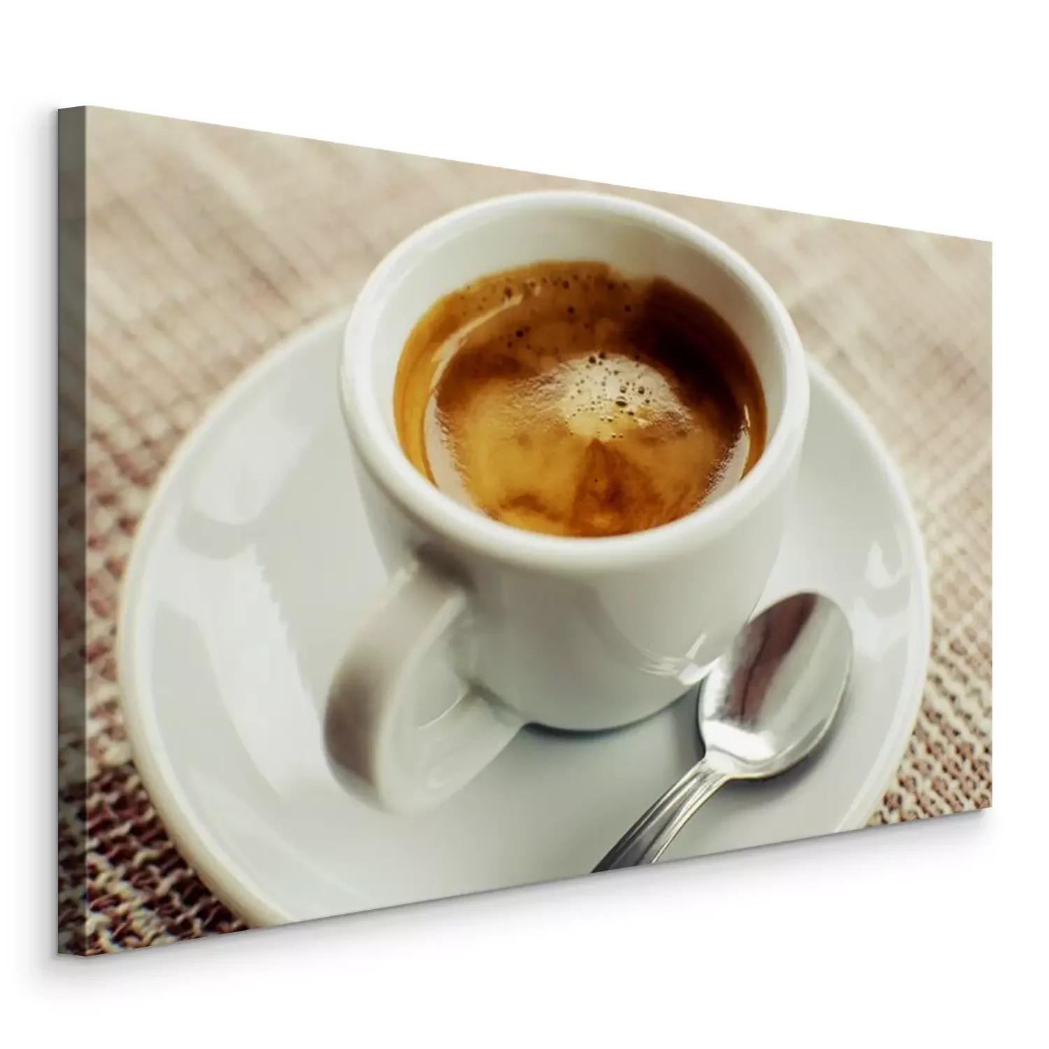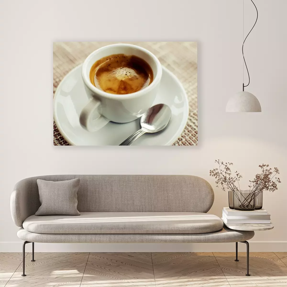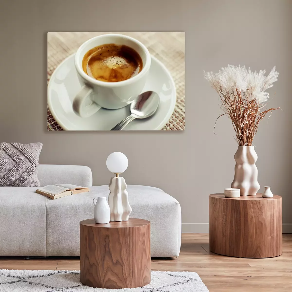 Tableau  Une tasse de café expresso fraîchement préparé avec de la mousse sur le tissu, une image horizontale