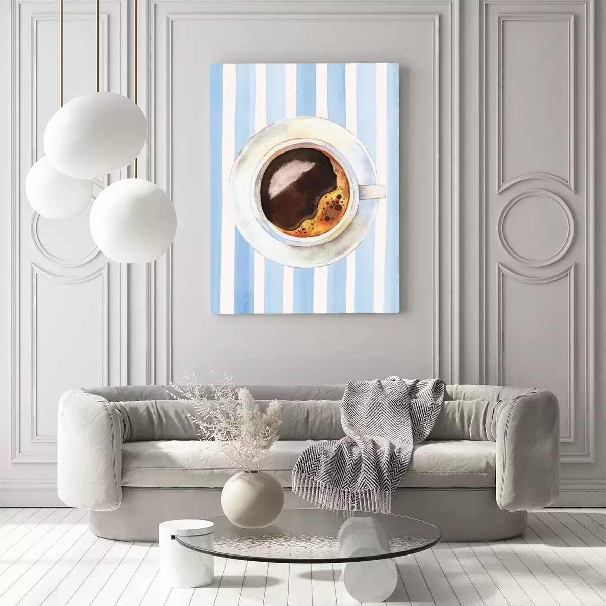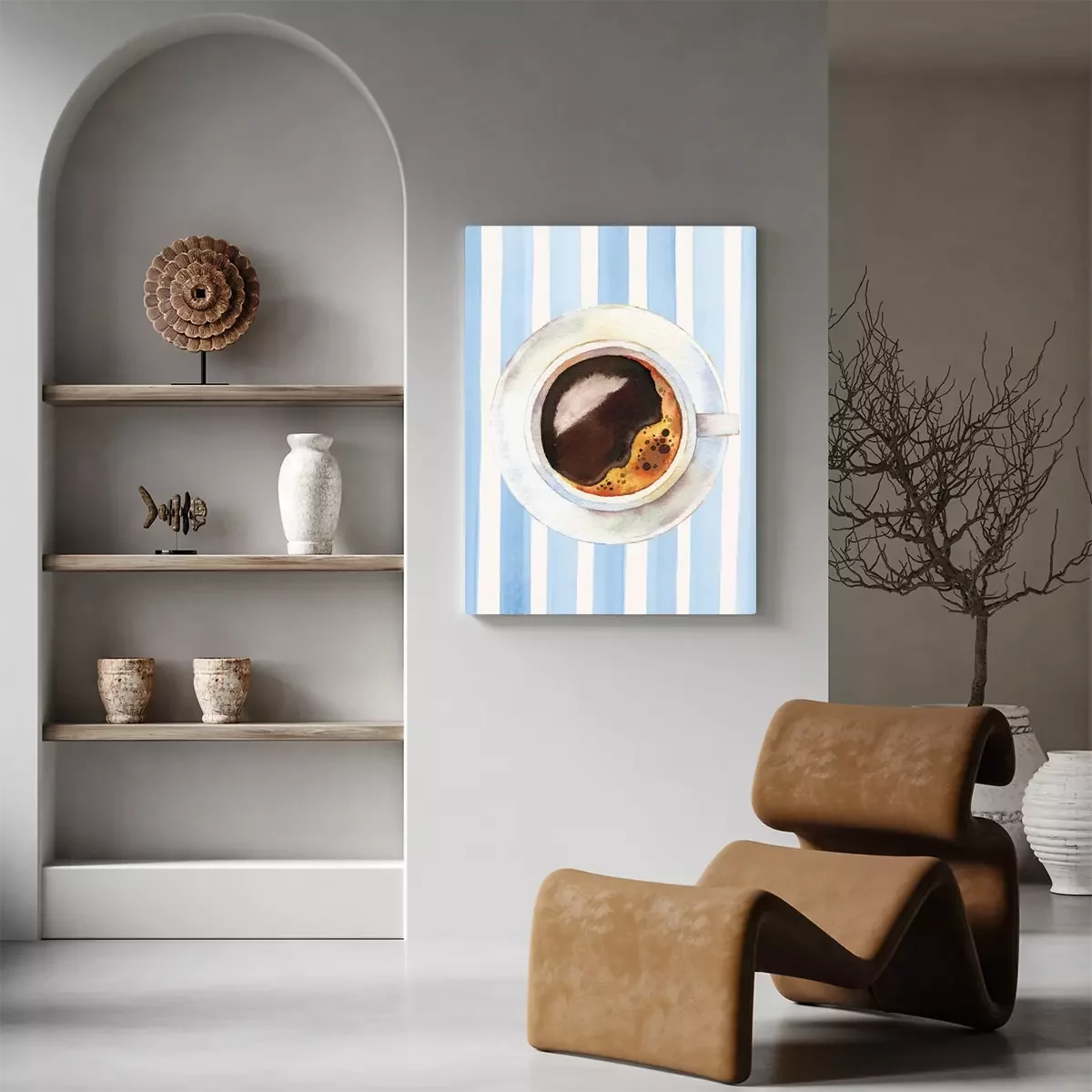 Tableau : Une tasse de café noir minimaliste sur un fond rayé.