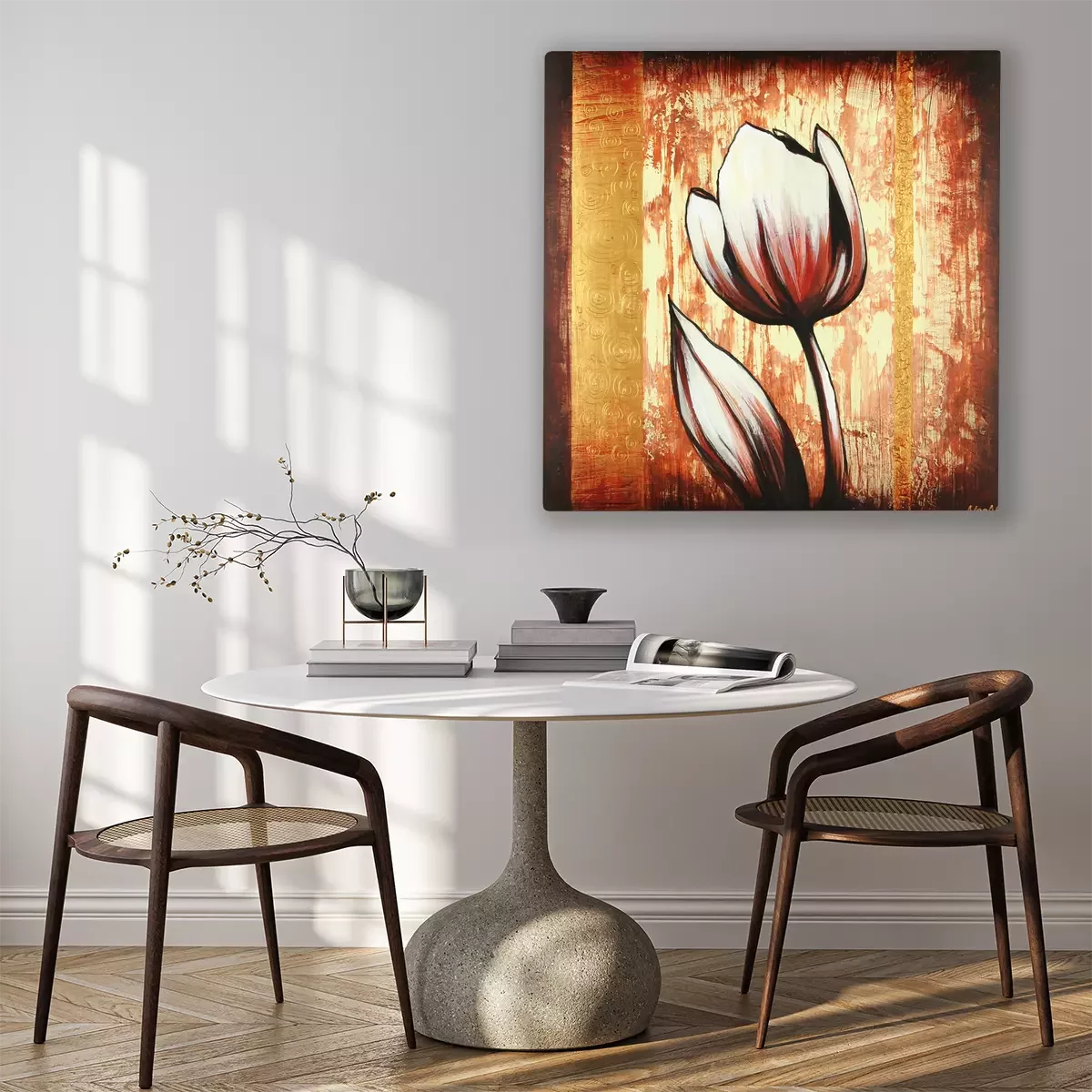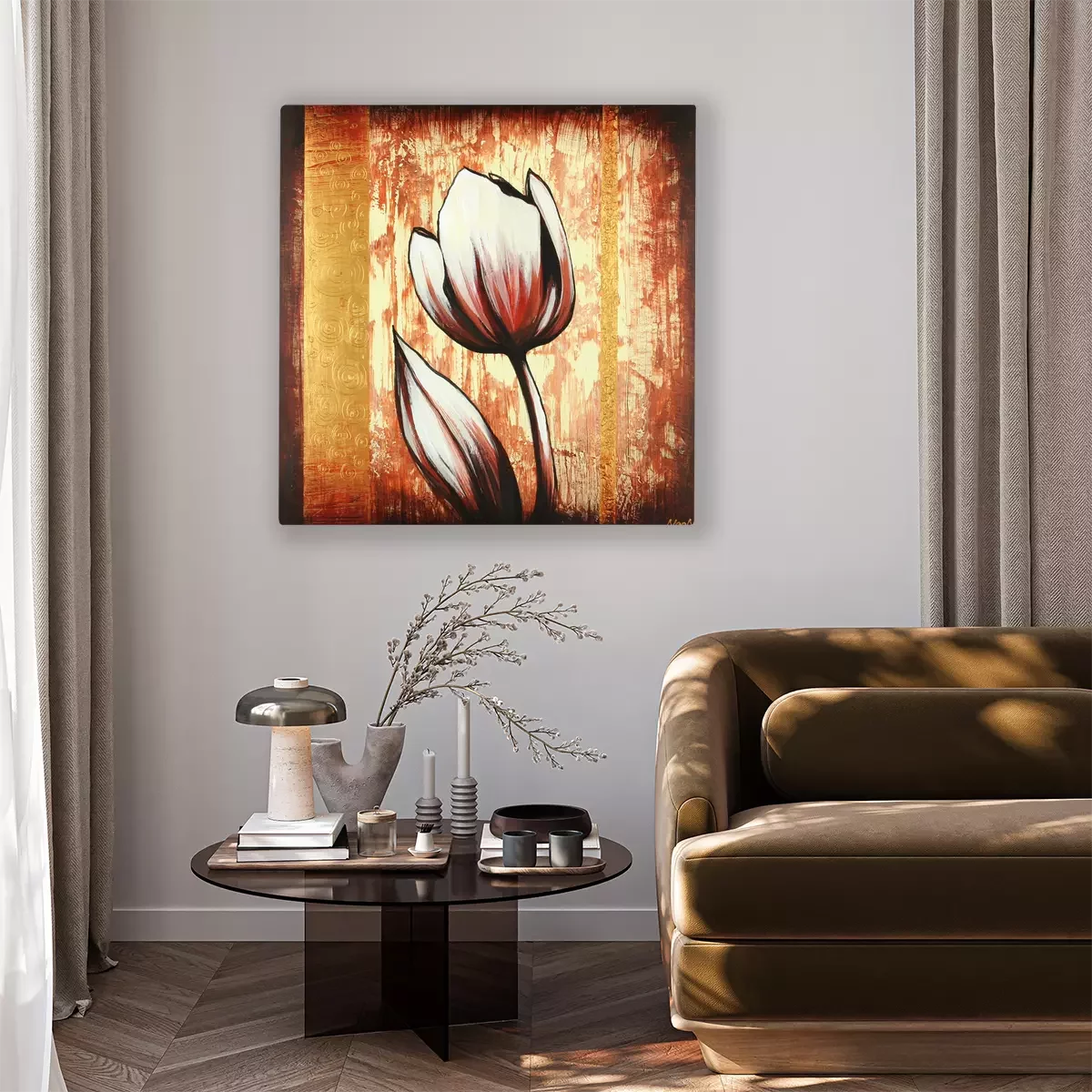 Une tulipe unique sur un fond à motif doré décoratif