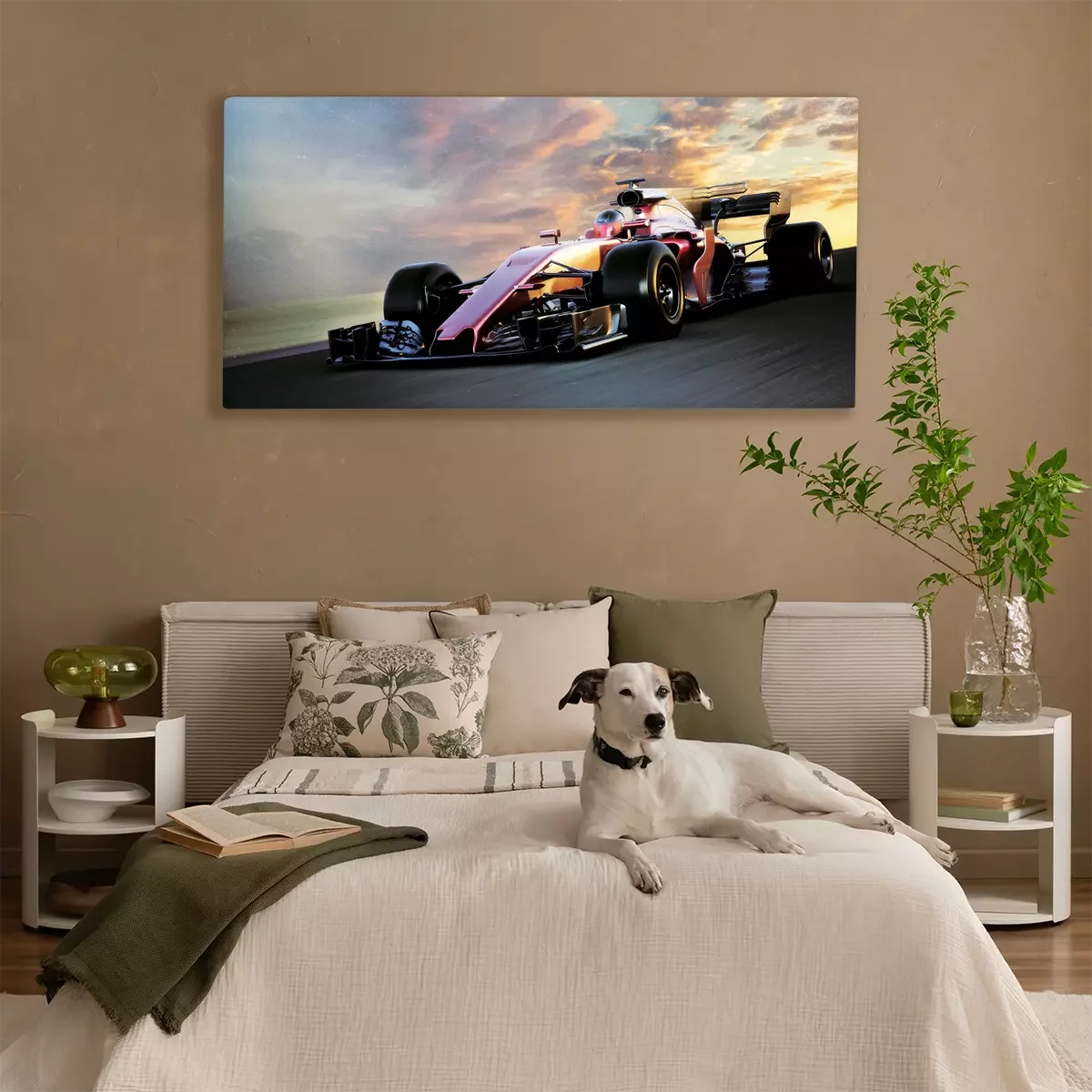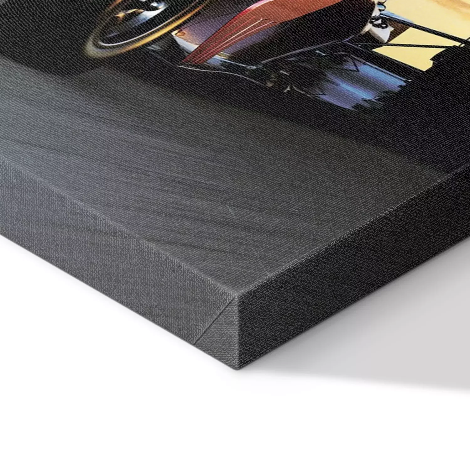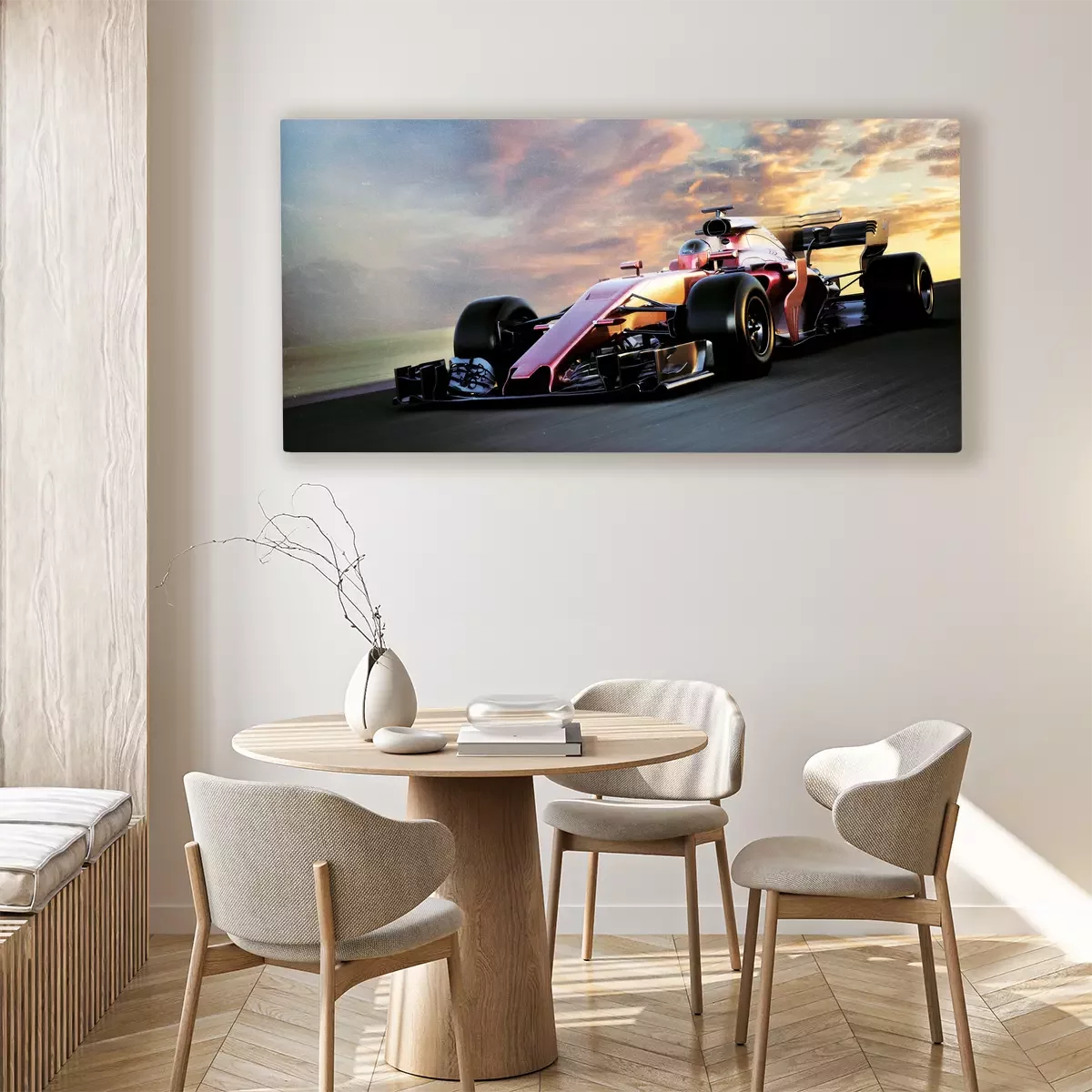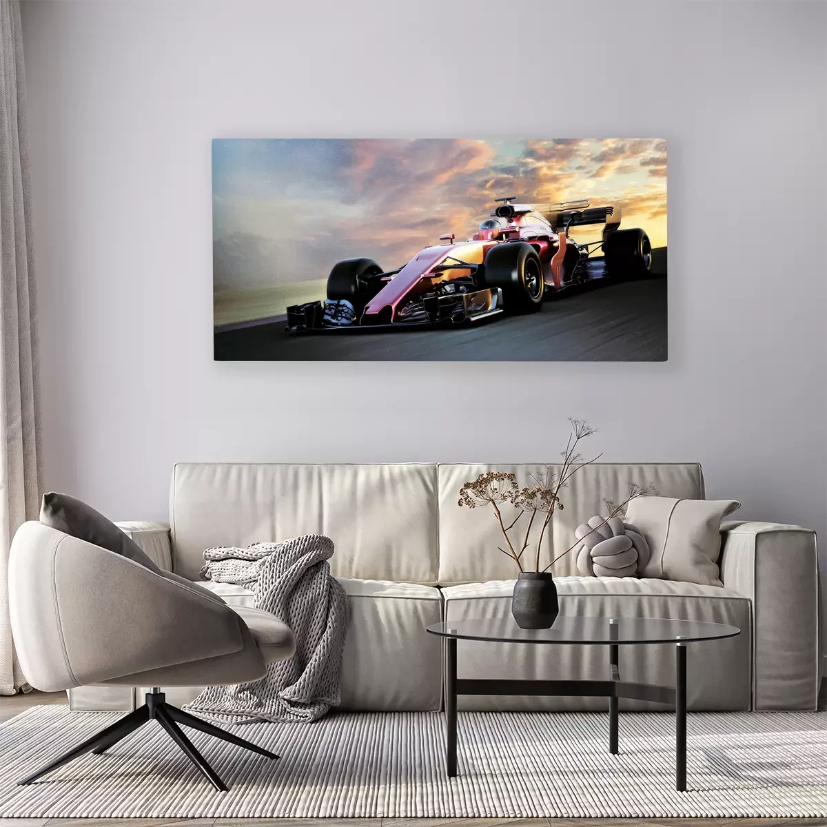 Une voiture de course au coucher du soleil