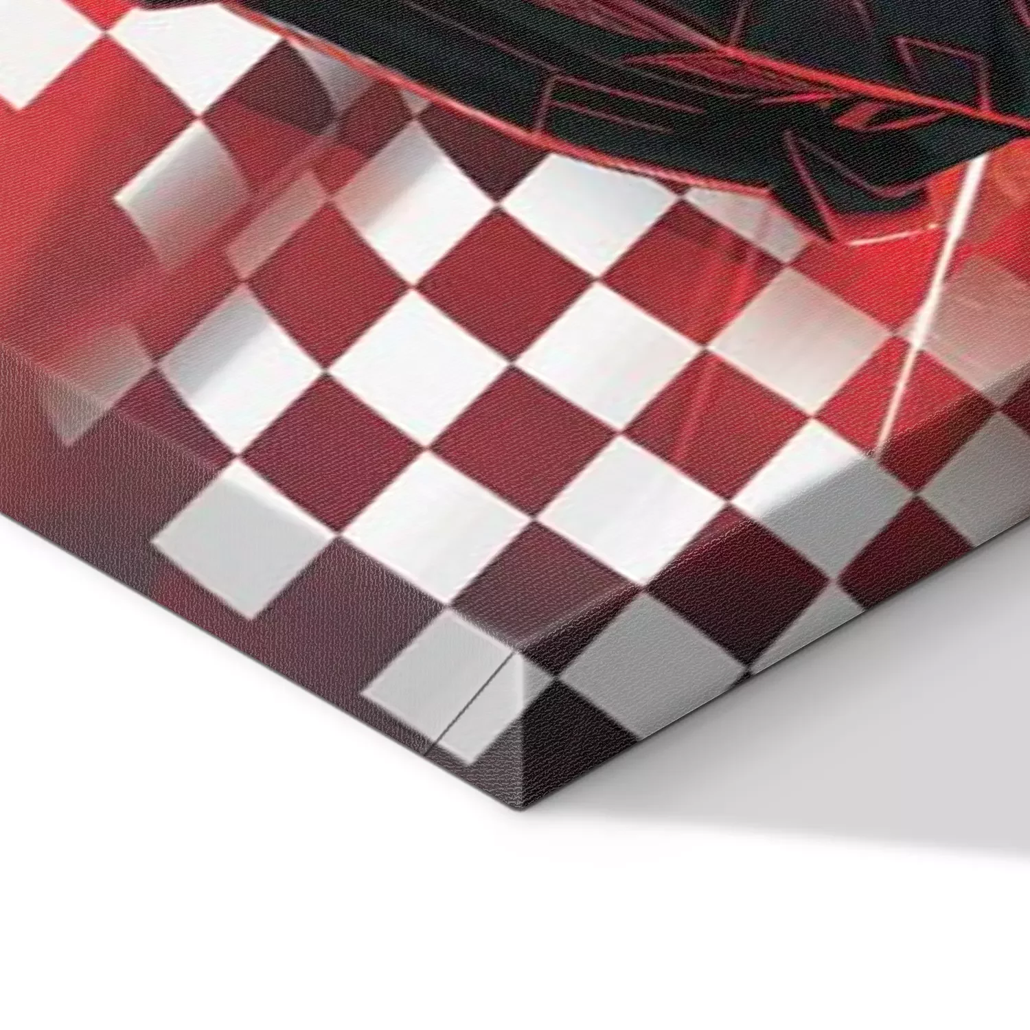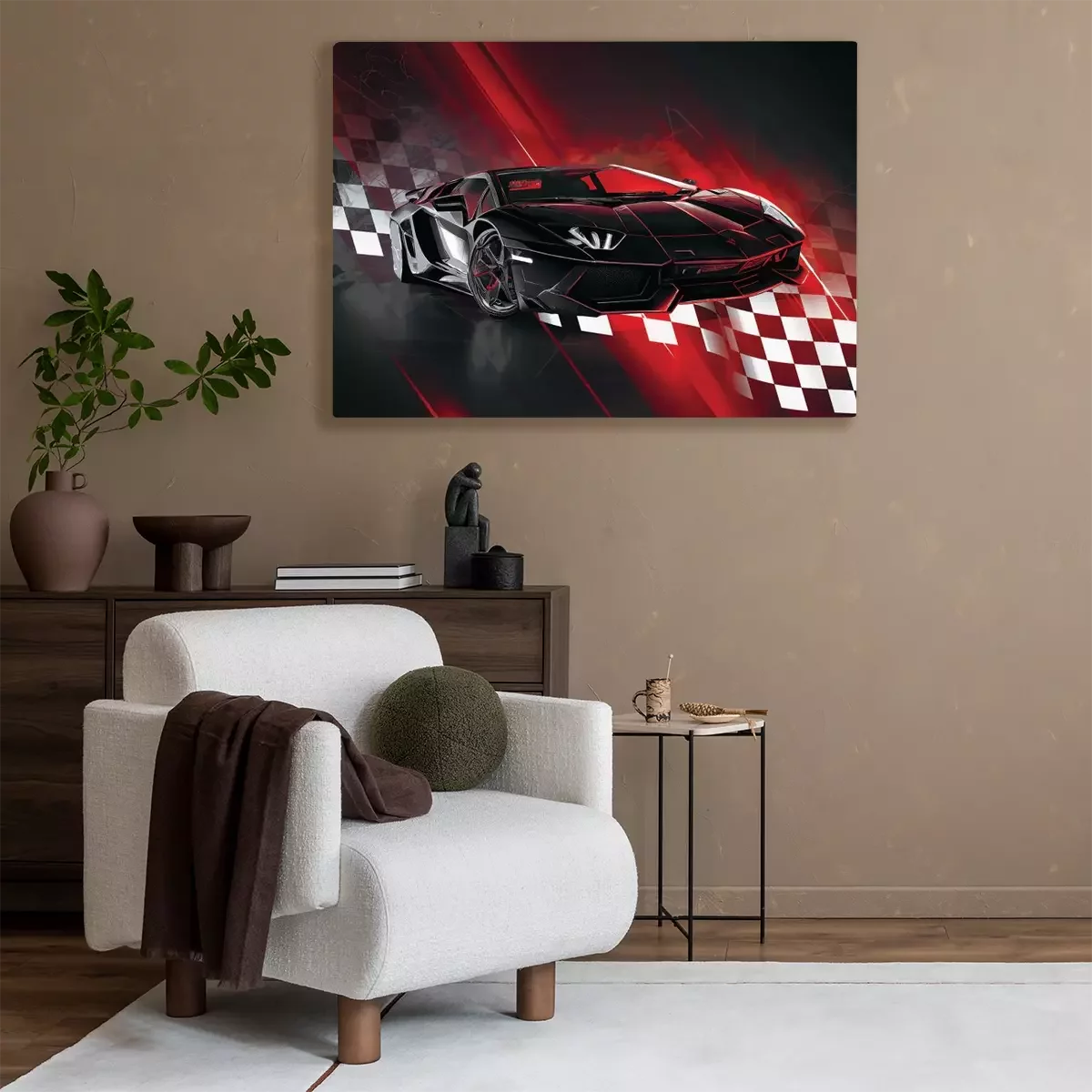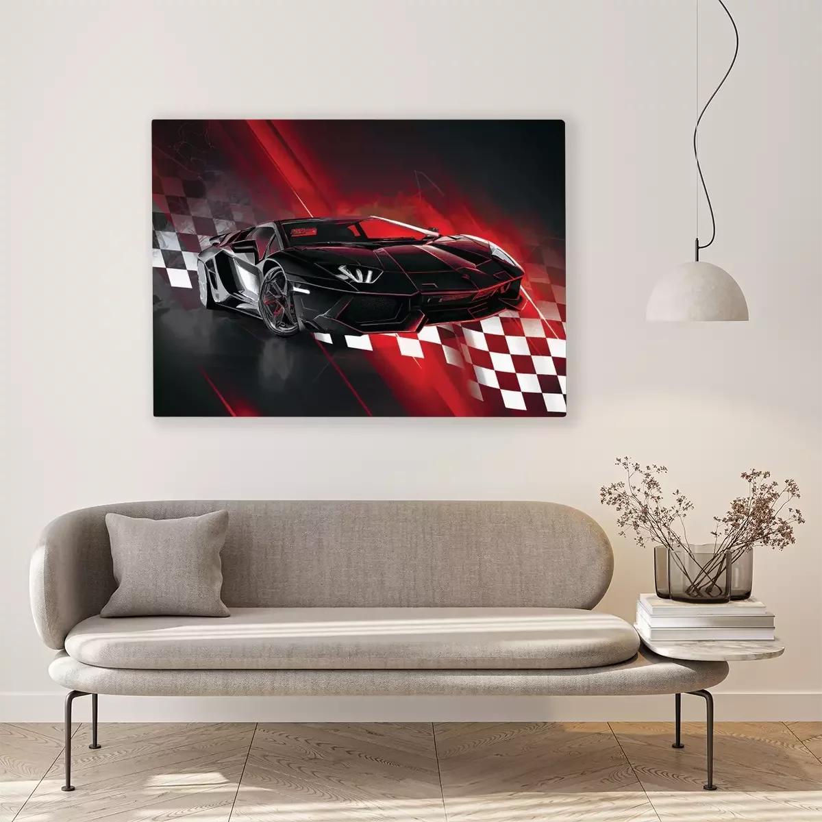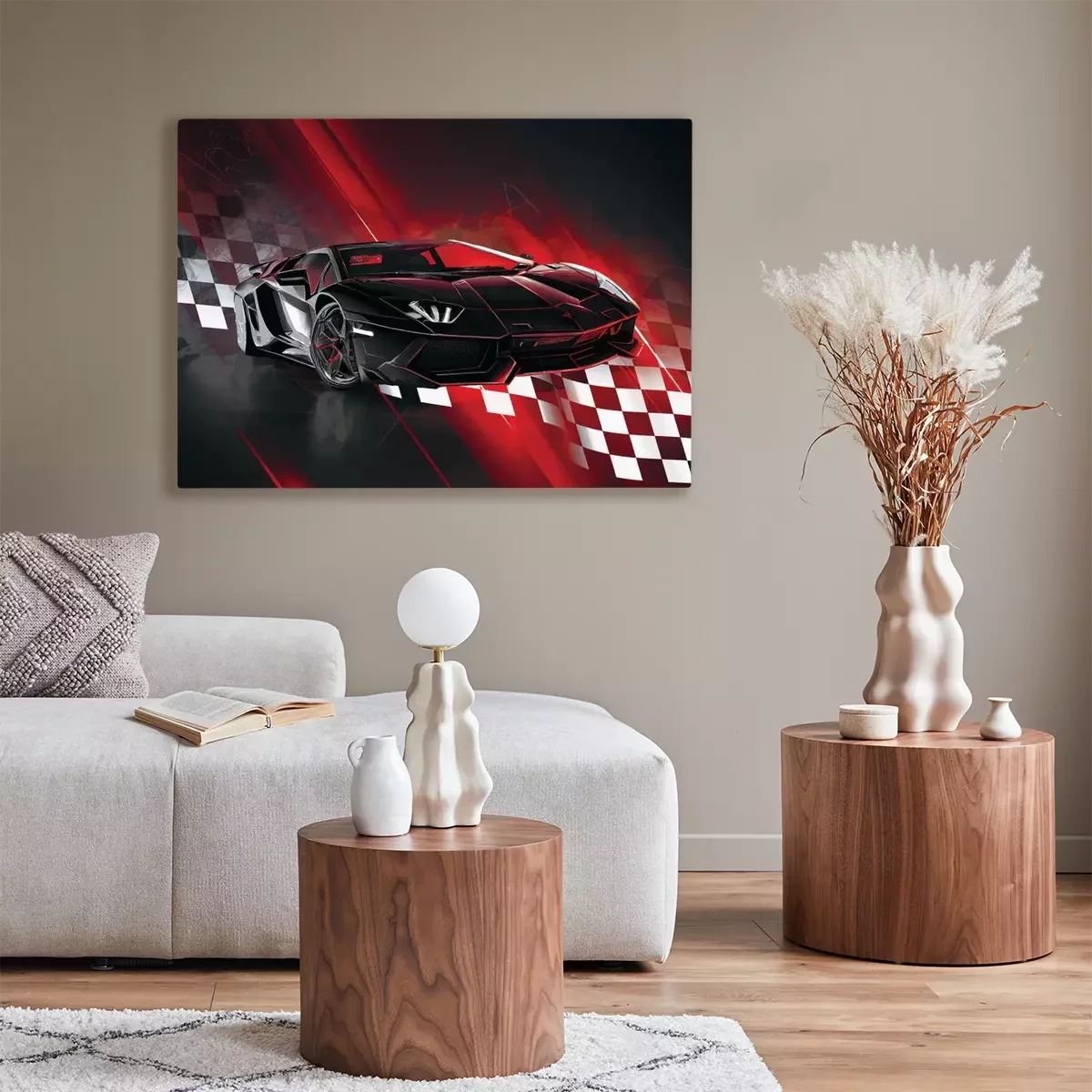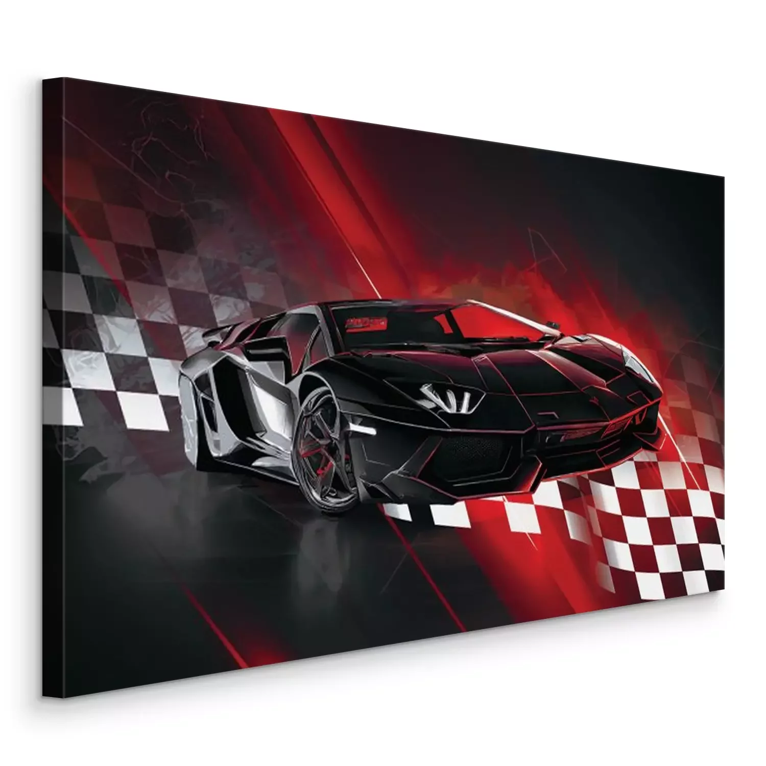 Une voiture de sport dynamique avec un drapeau en arrière-plan