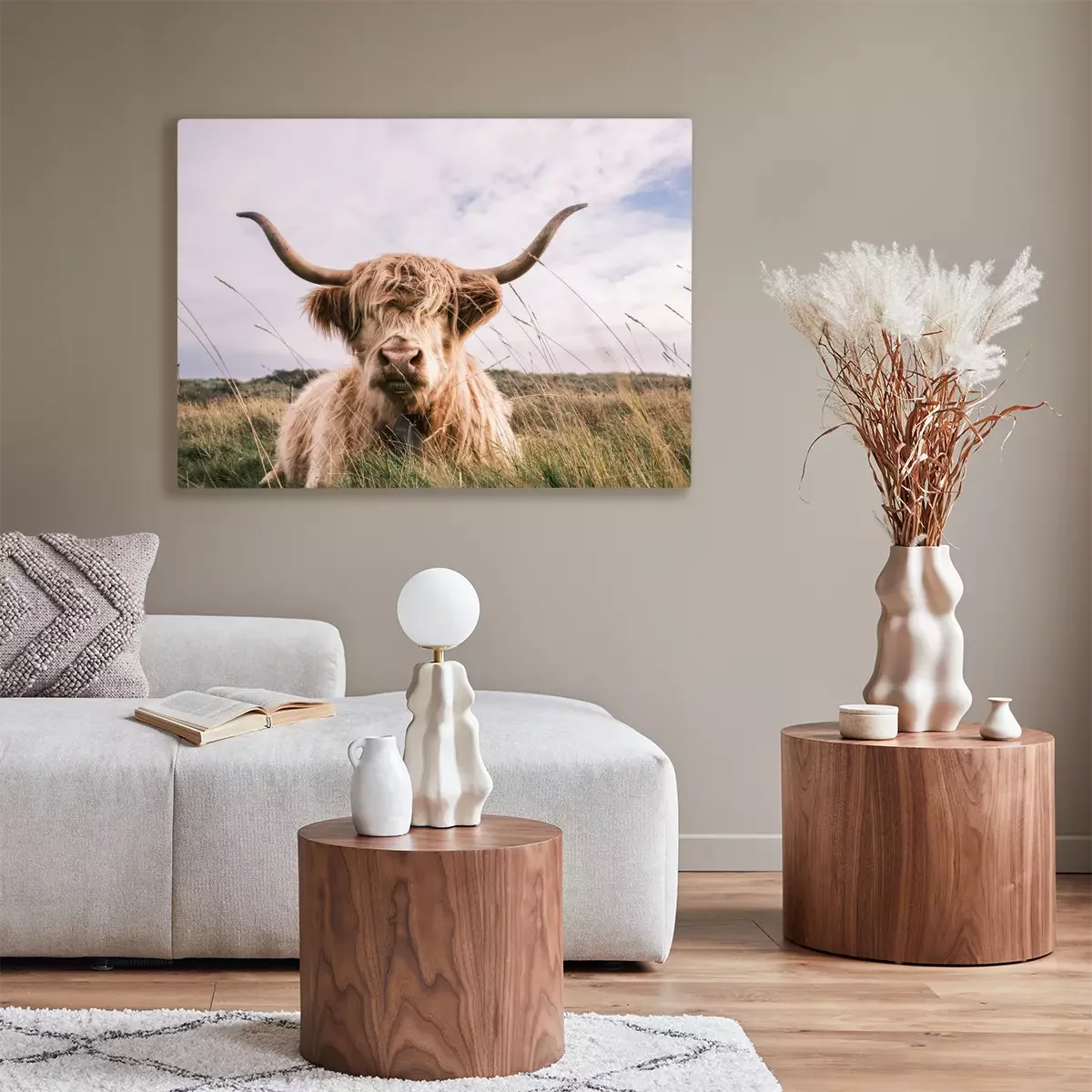 Tableau : Vache écossaise des hautes terres couchée dans l'herbe