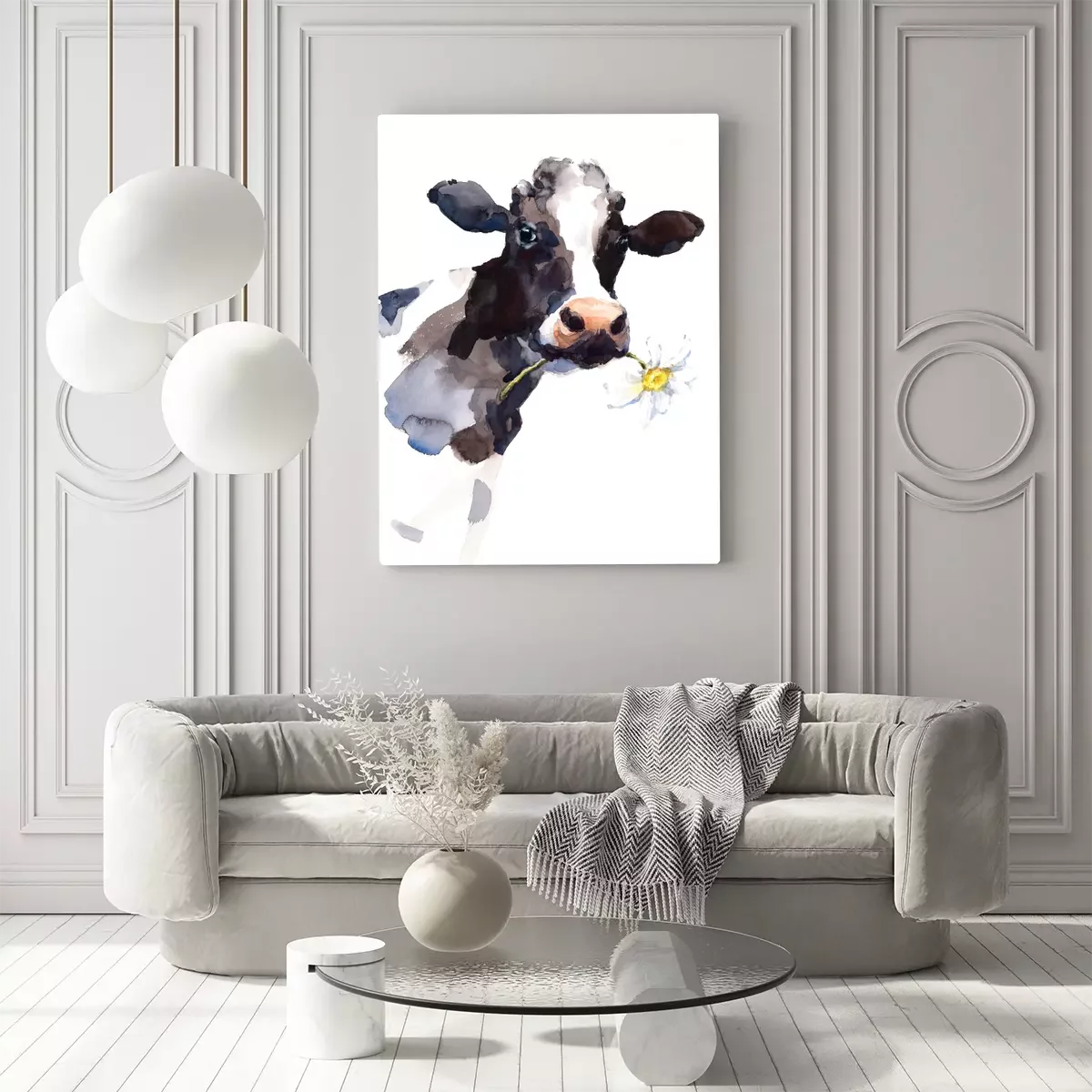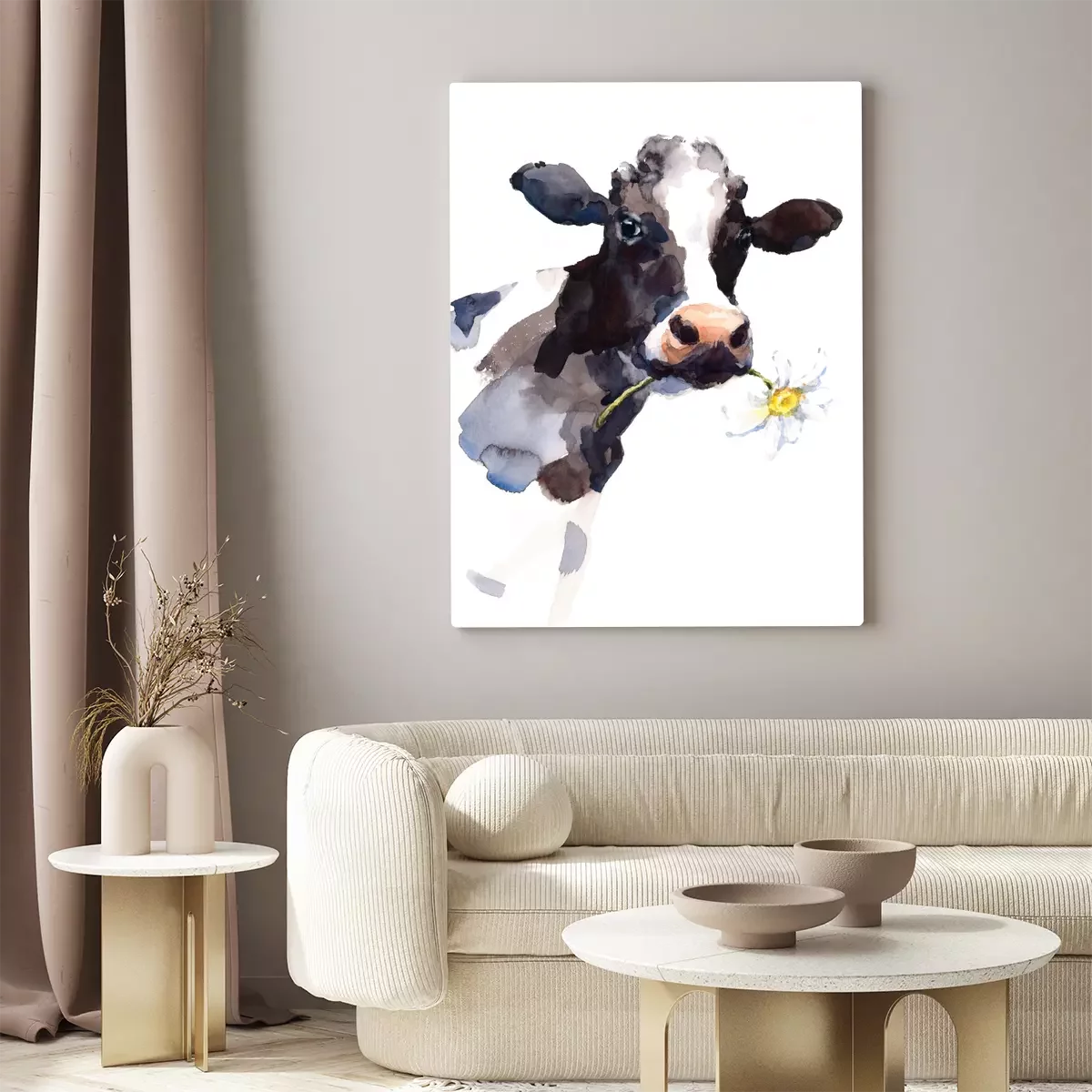 Tableau  Vache noire et blanche avec une fleur dans sa bouche aquarelle