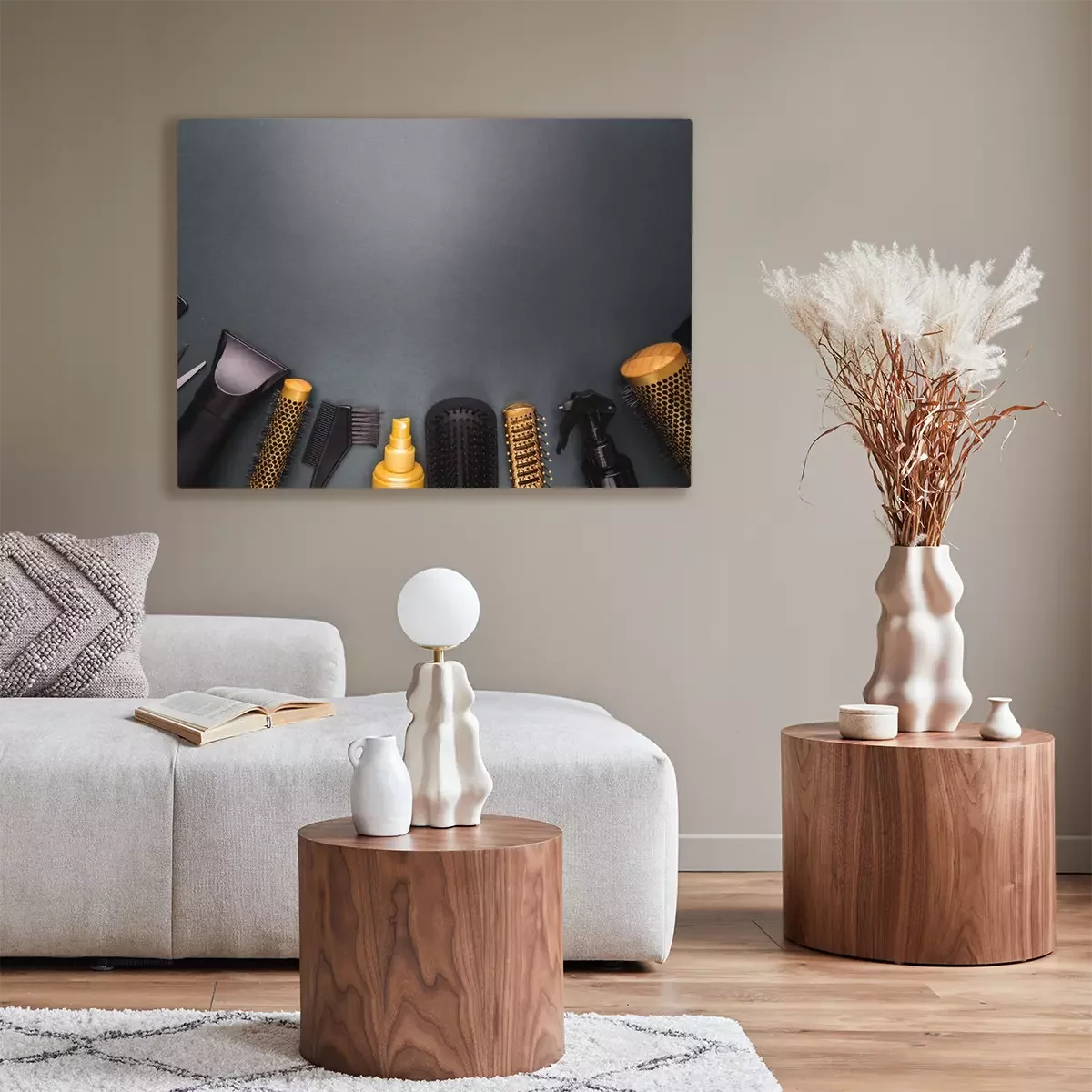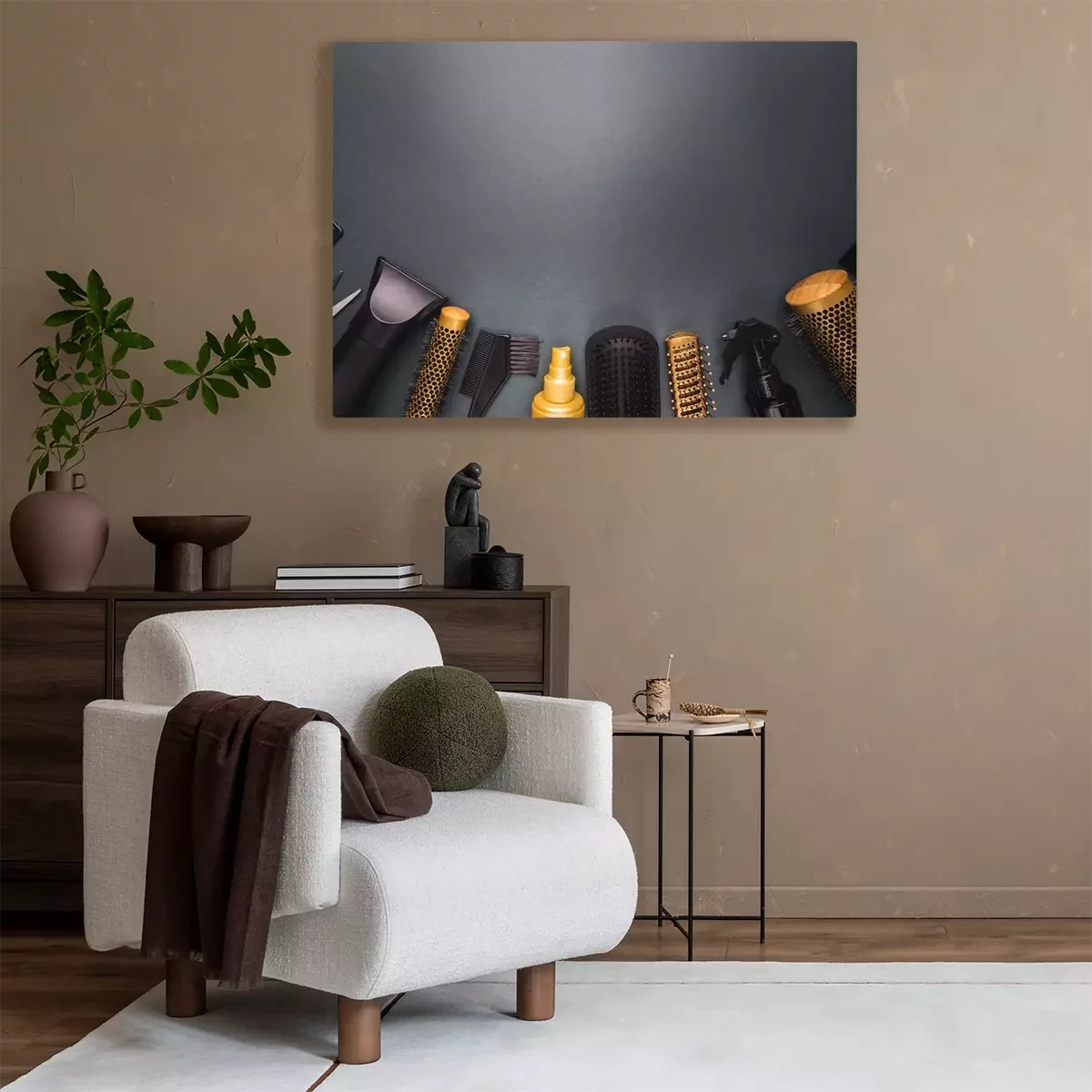 Tableau : Various hair dresser and cut tools on black background with copy space