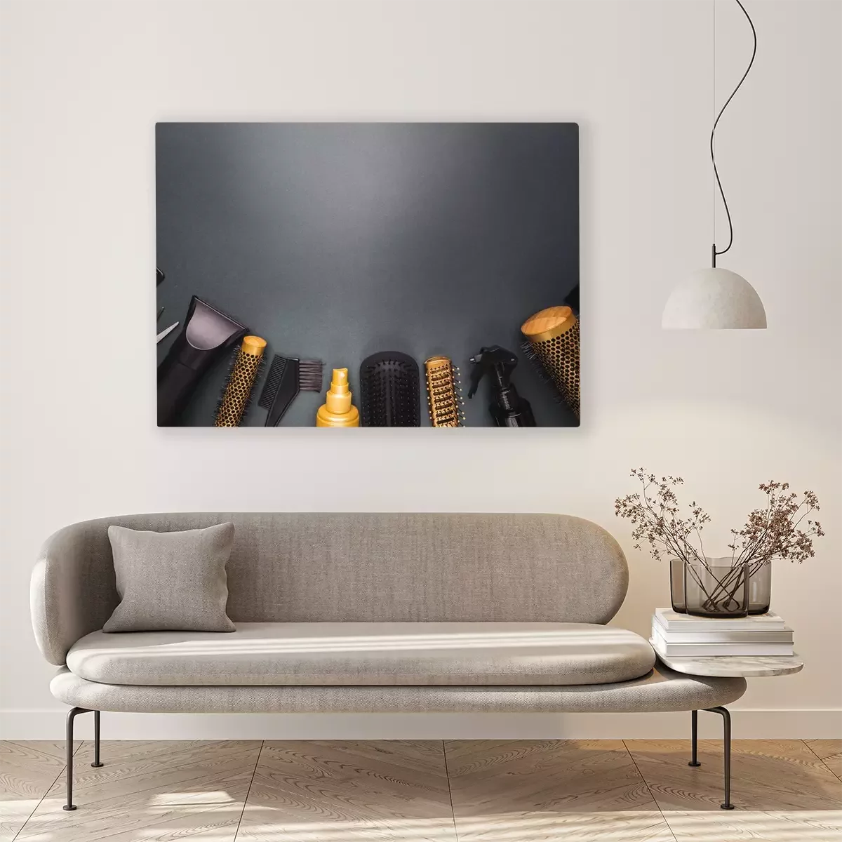 Tableau  Various hair dresser and cut tools on black background with copy space
