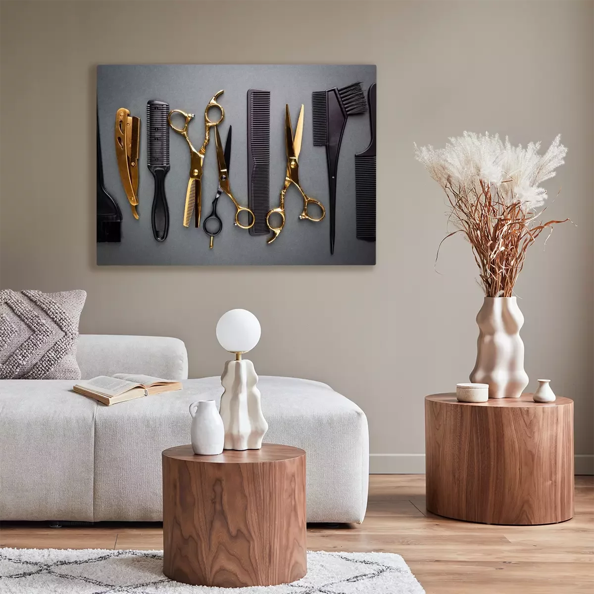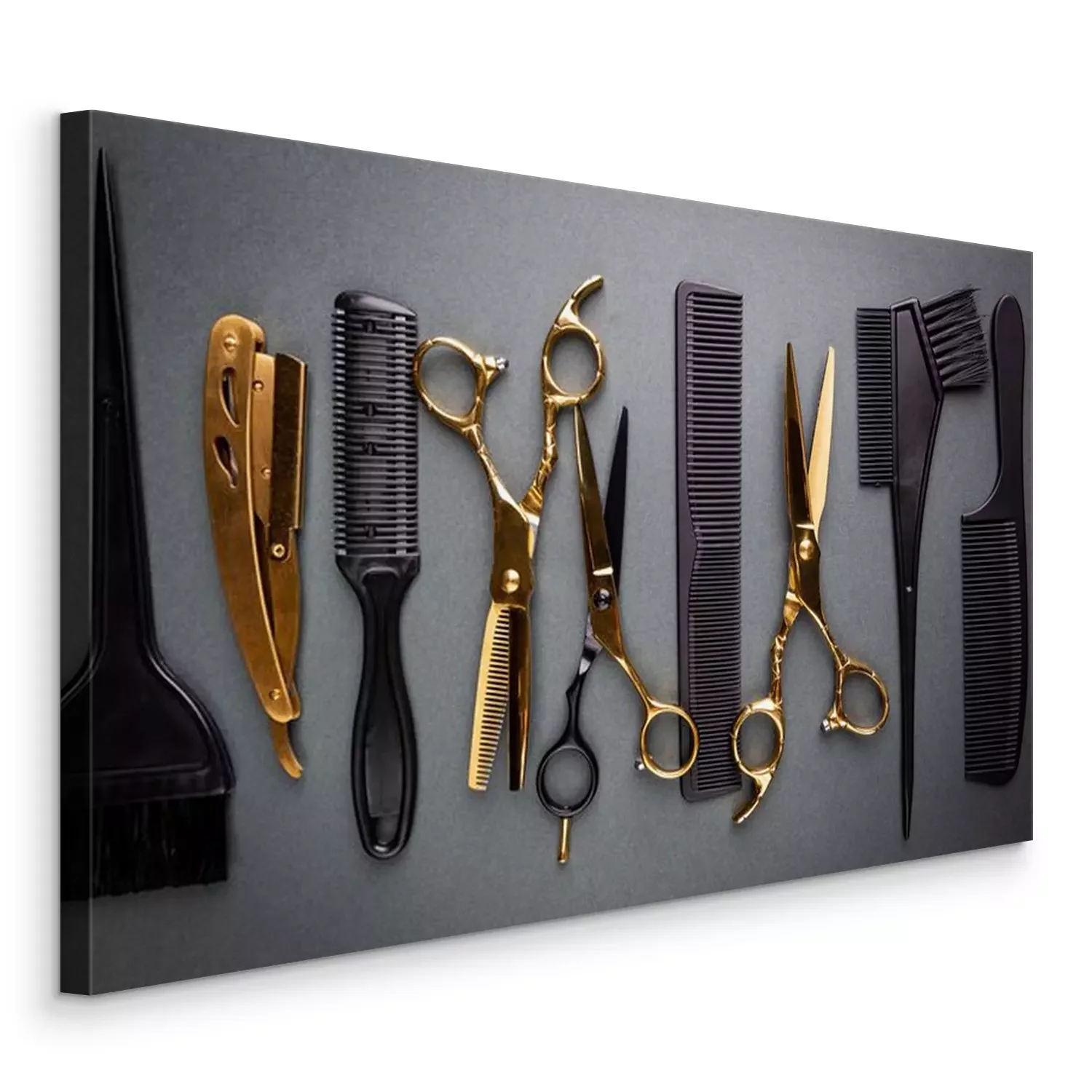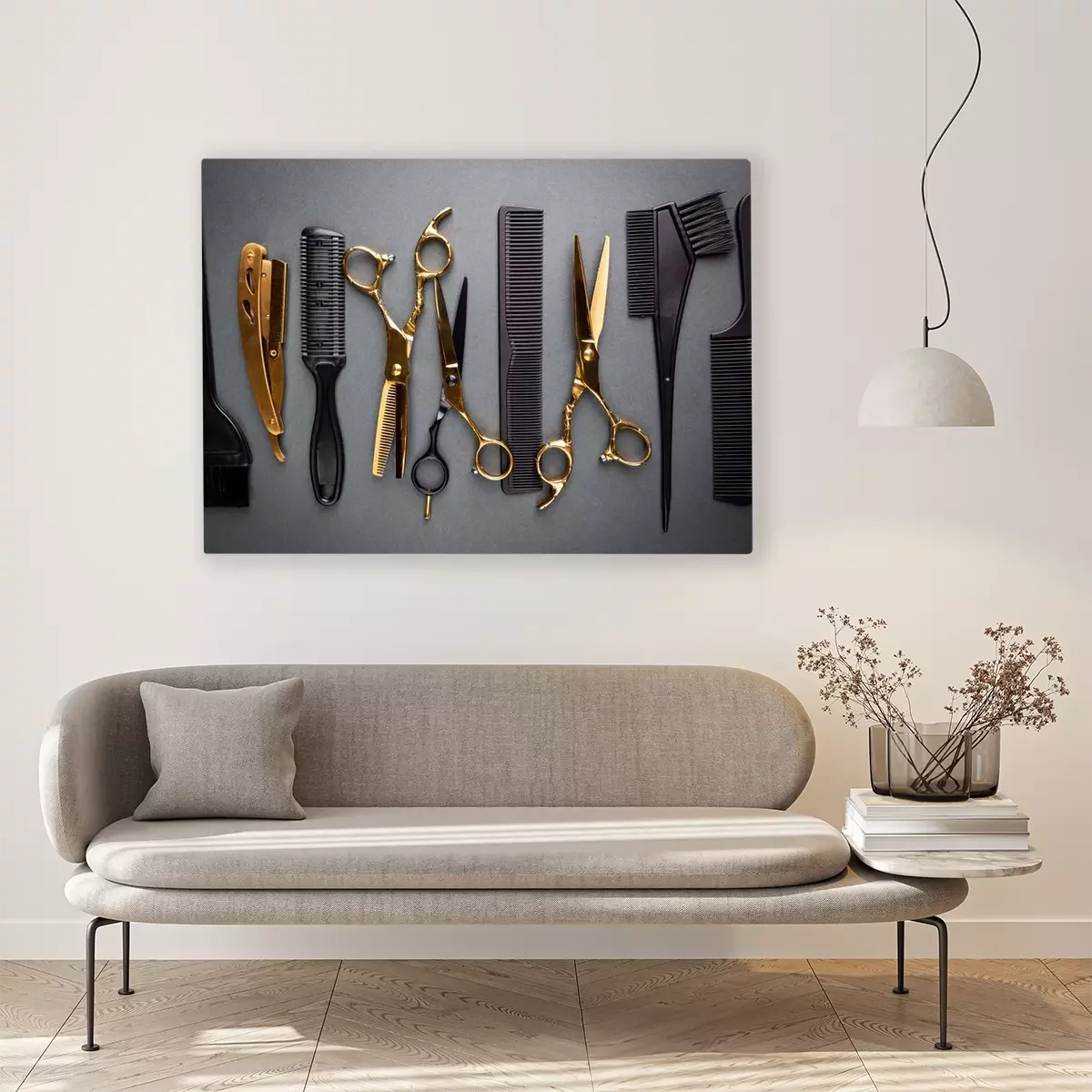 Tableau  Various hair dresser and cut tools on black background with copy space