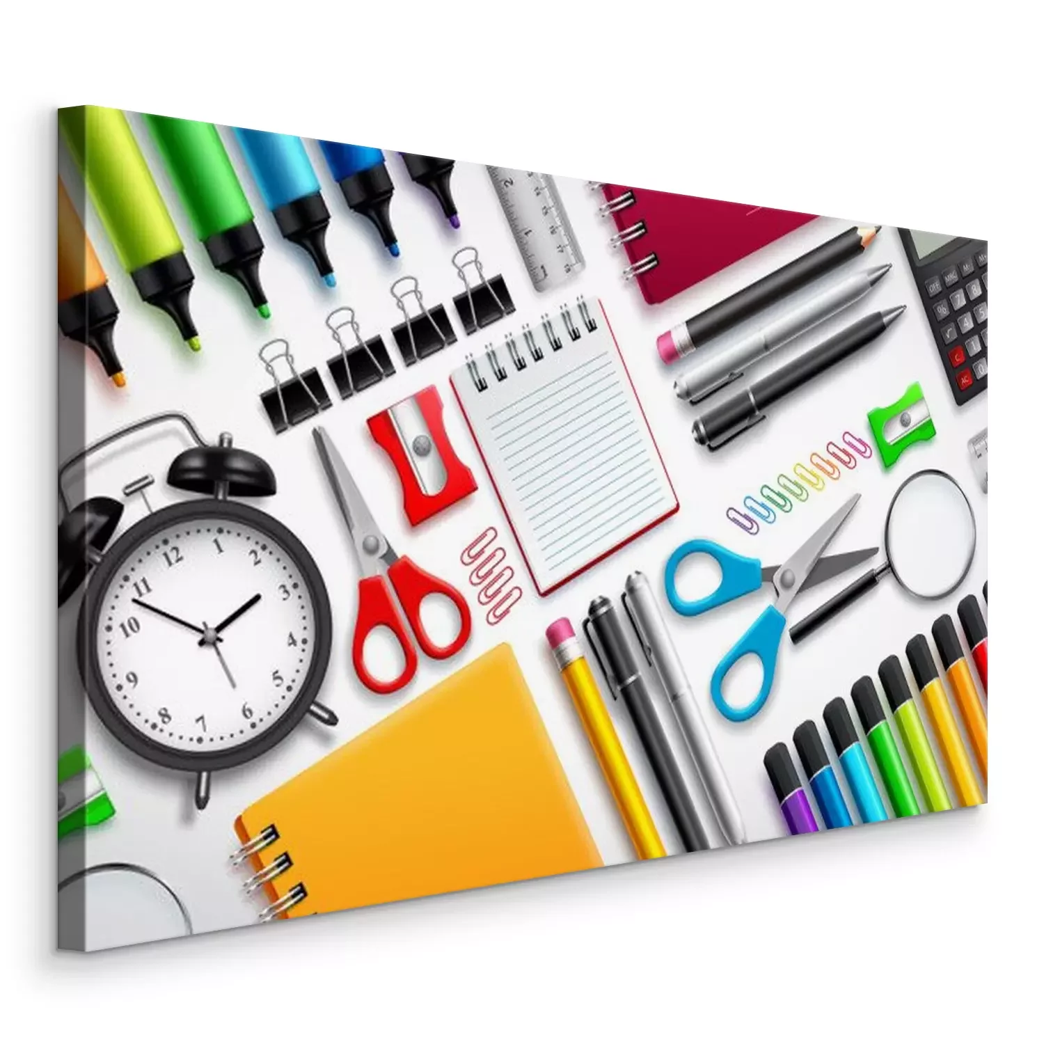 Tableau  Vecteur de fournitures scolaires et de bureau définir fond avec des objets scolaires colorés et collection de papeterie en fond blanc. Illustration vectorielle
