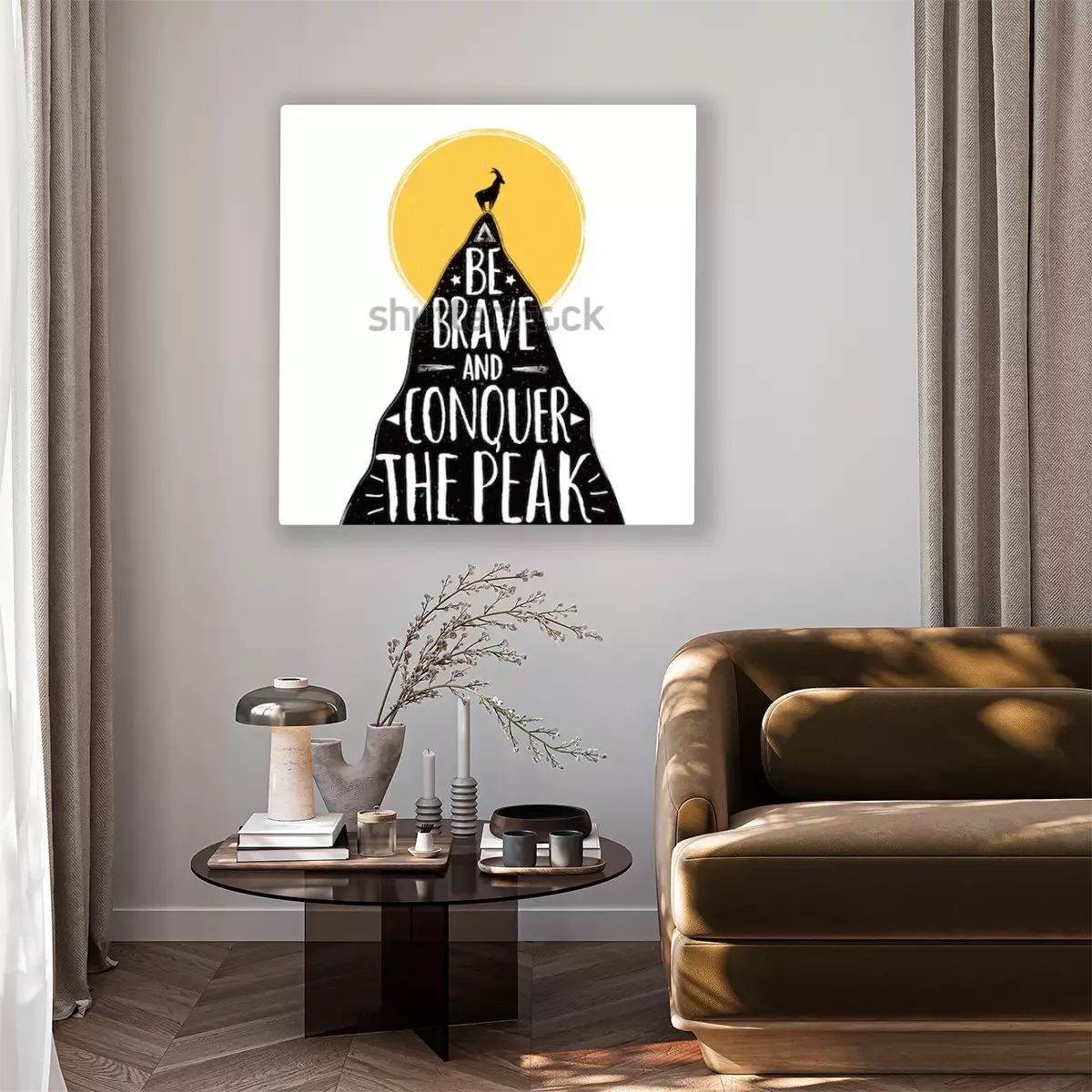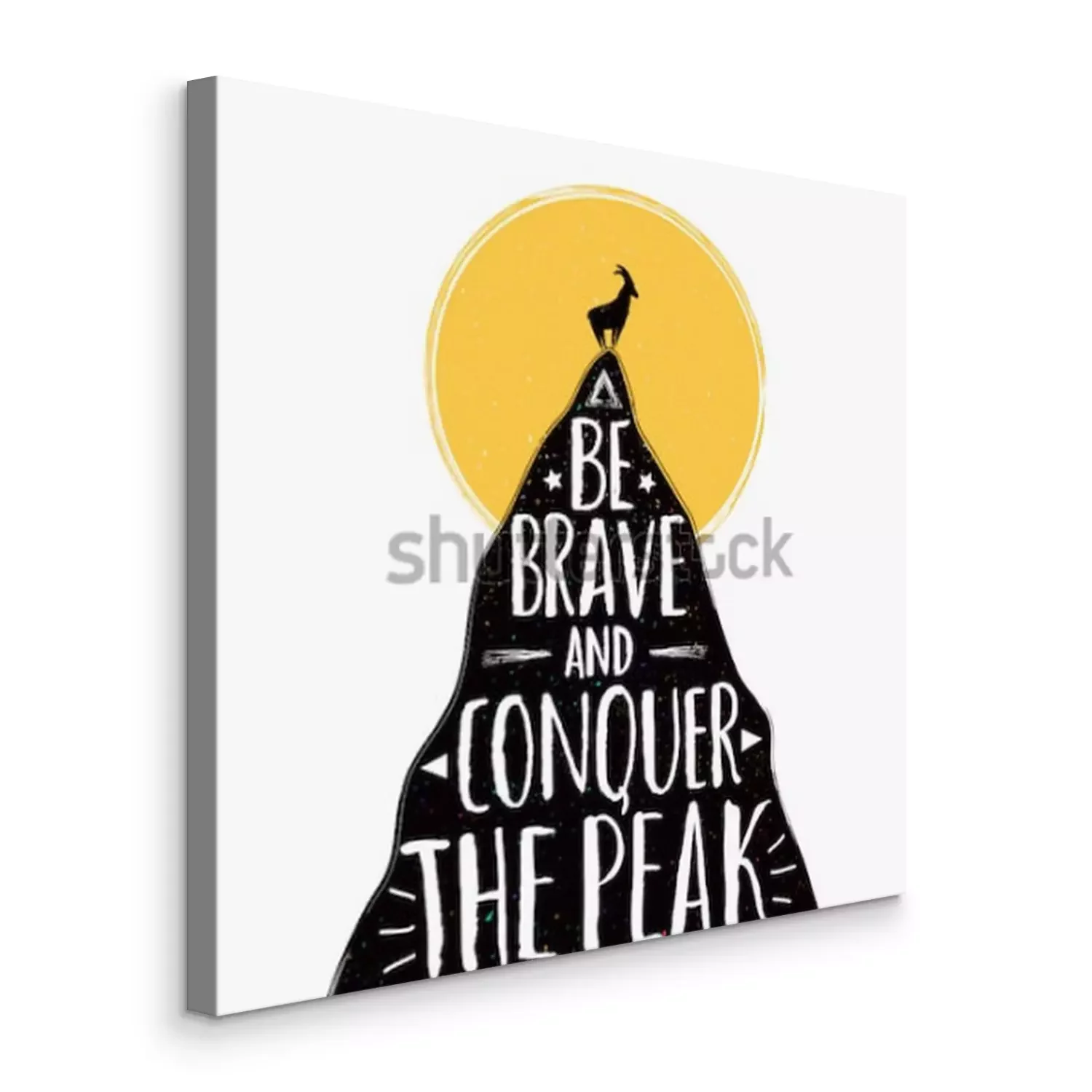 Tableau  Vector illustration with a goat on the top of mountain. Be brave and conquer the peak lettering quote. Inspirational and motivational typography poster with animal