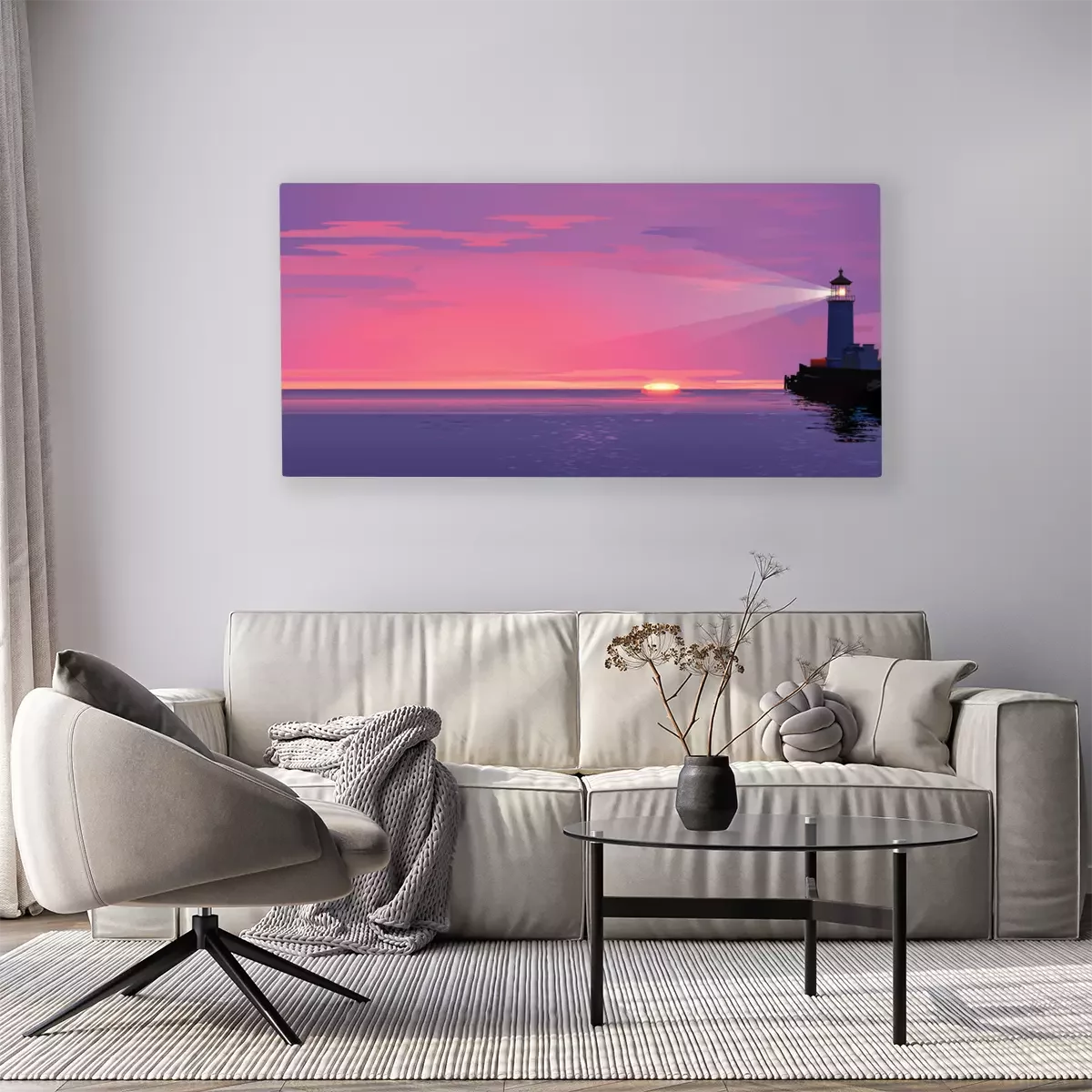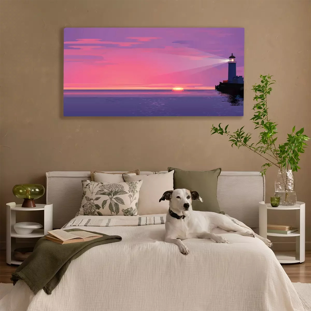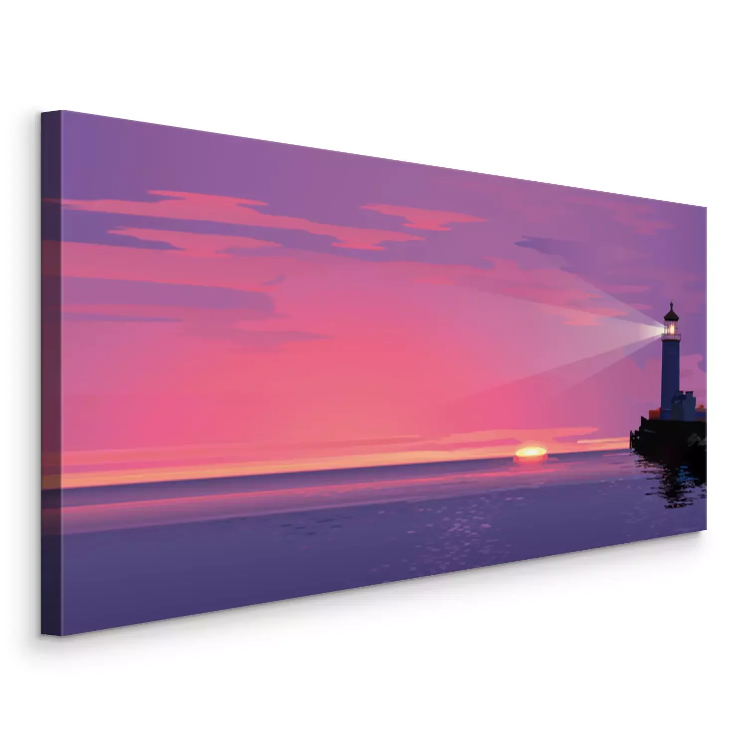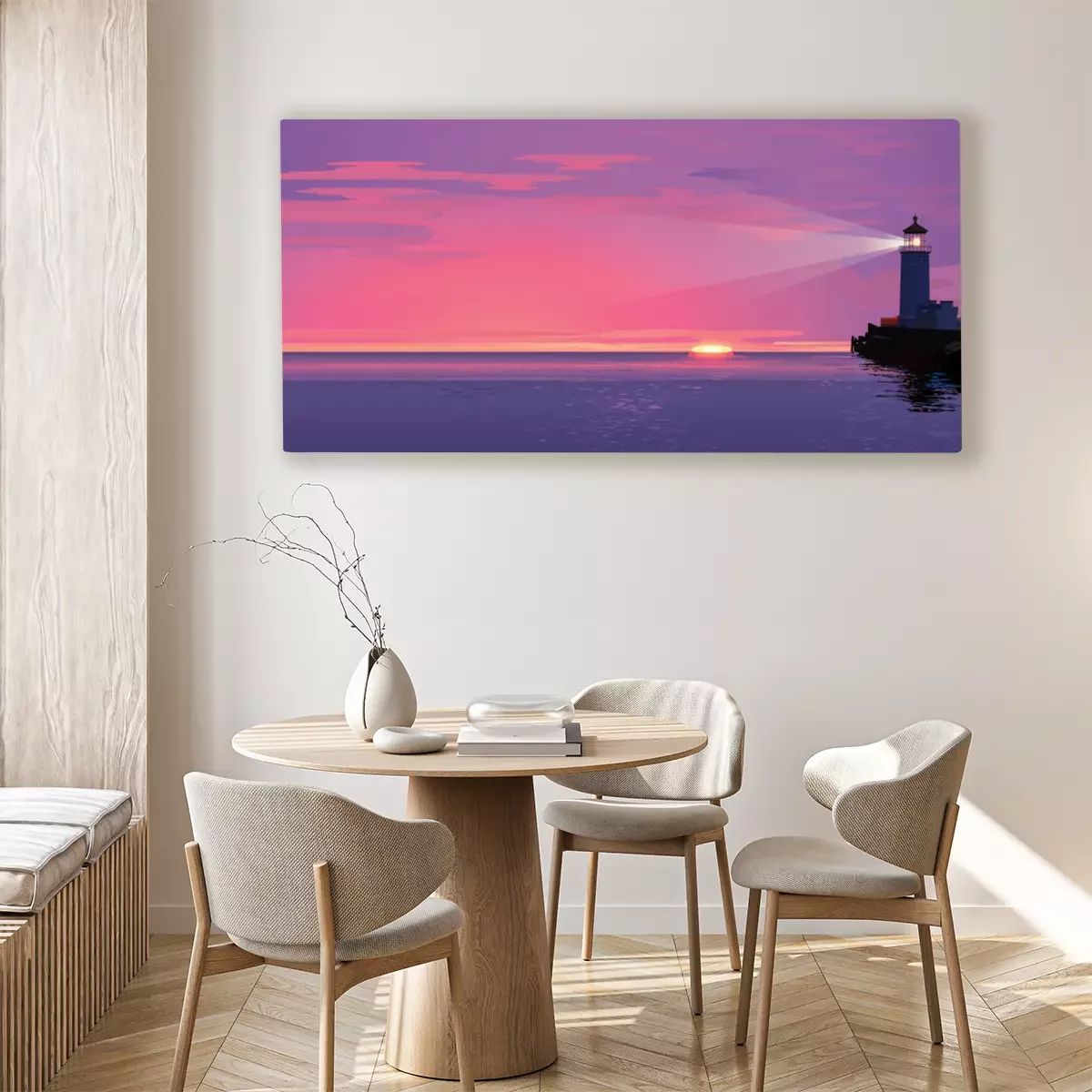 Tableau  Vector sea landscape with lighting lighthouse at sunset or sun rise. Design template in trendy style navigational and travel concept. Biblical Beacon.