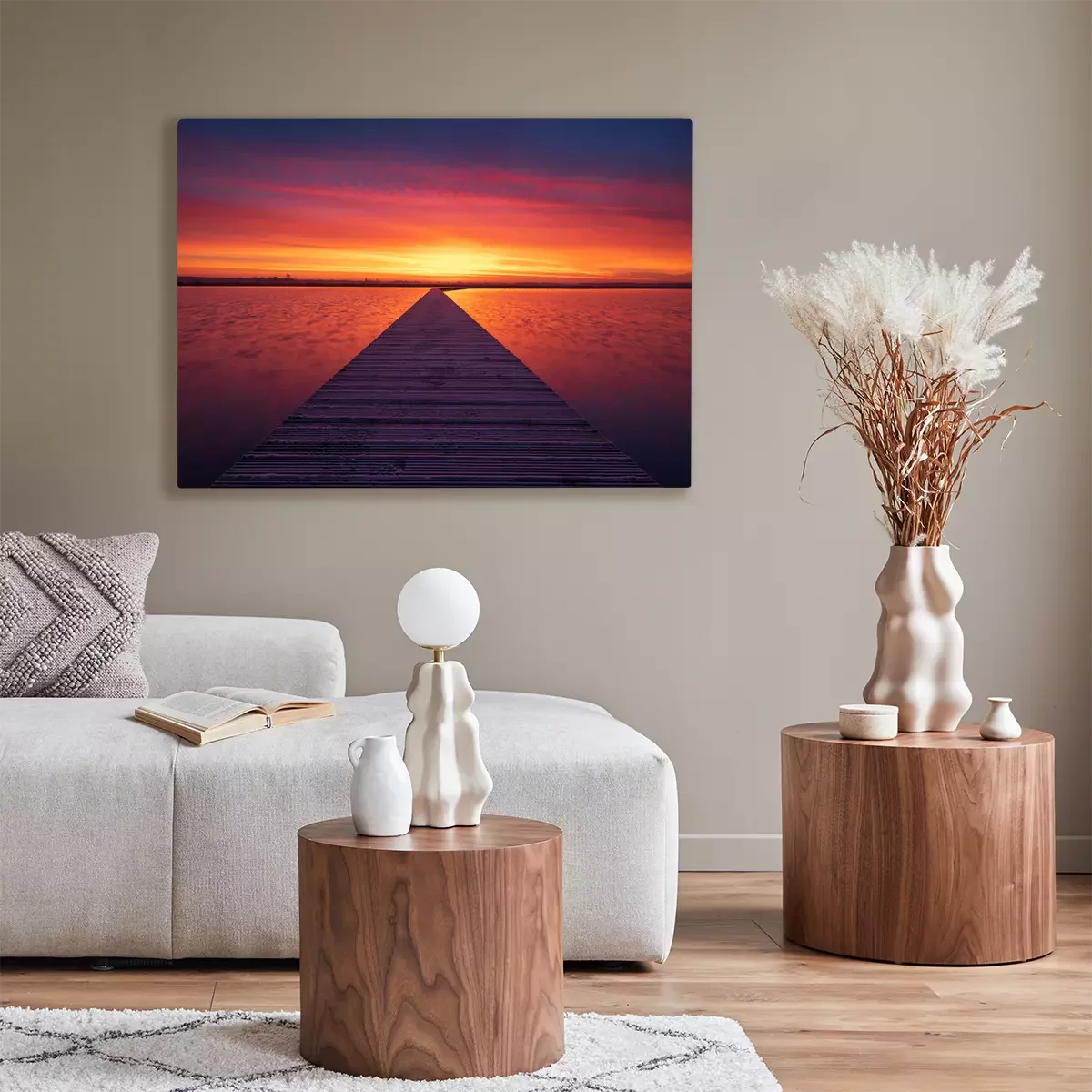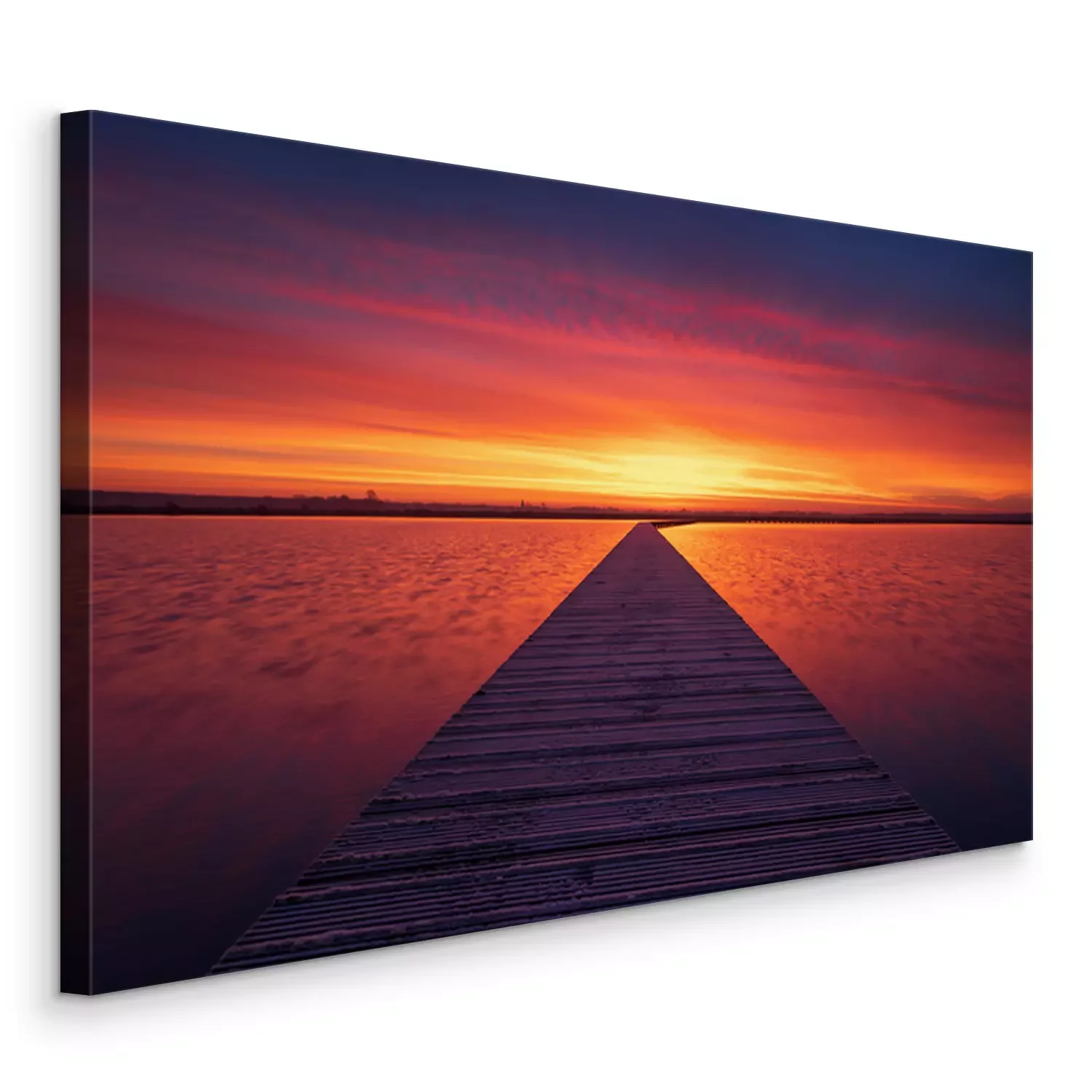 Tableau : Very colorful and tranquil dawn at a jetty in a lake. Groningen, Holland.