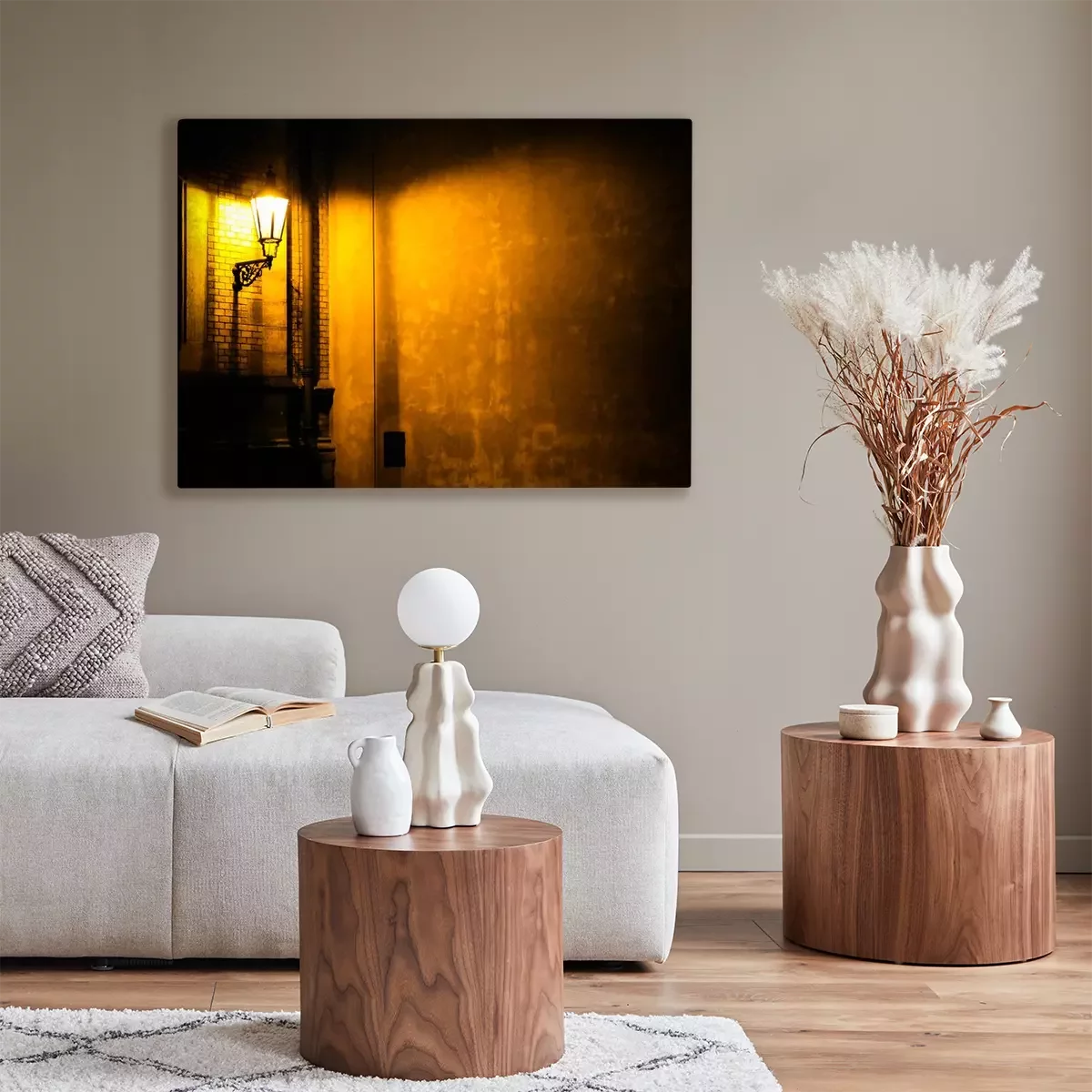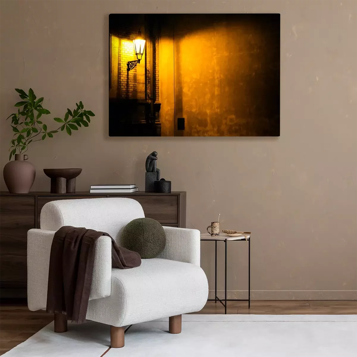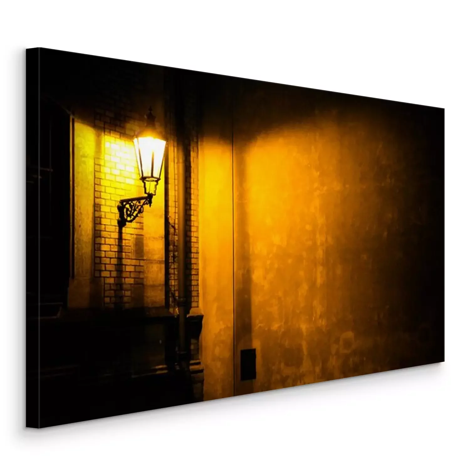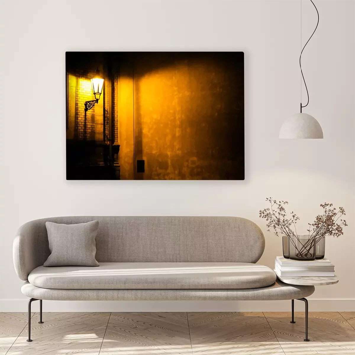 Tableau  Vieille lanterne illuminant un mur d'angle de ruelle sombre la nuit à Prague, en République tchèque. Photo presque monochromatique avec des tons jaune-brun de la lanterne comme source de lumière contr