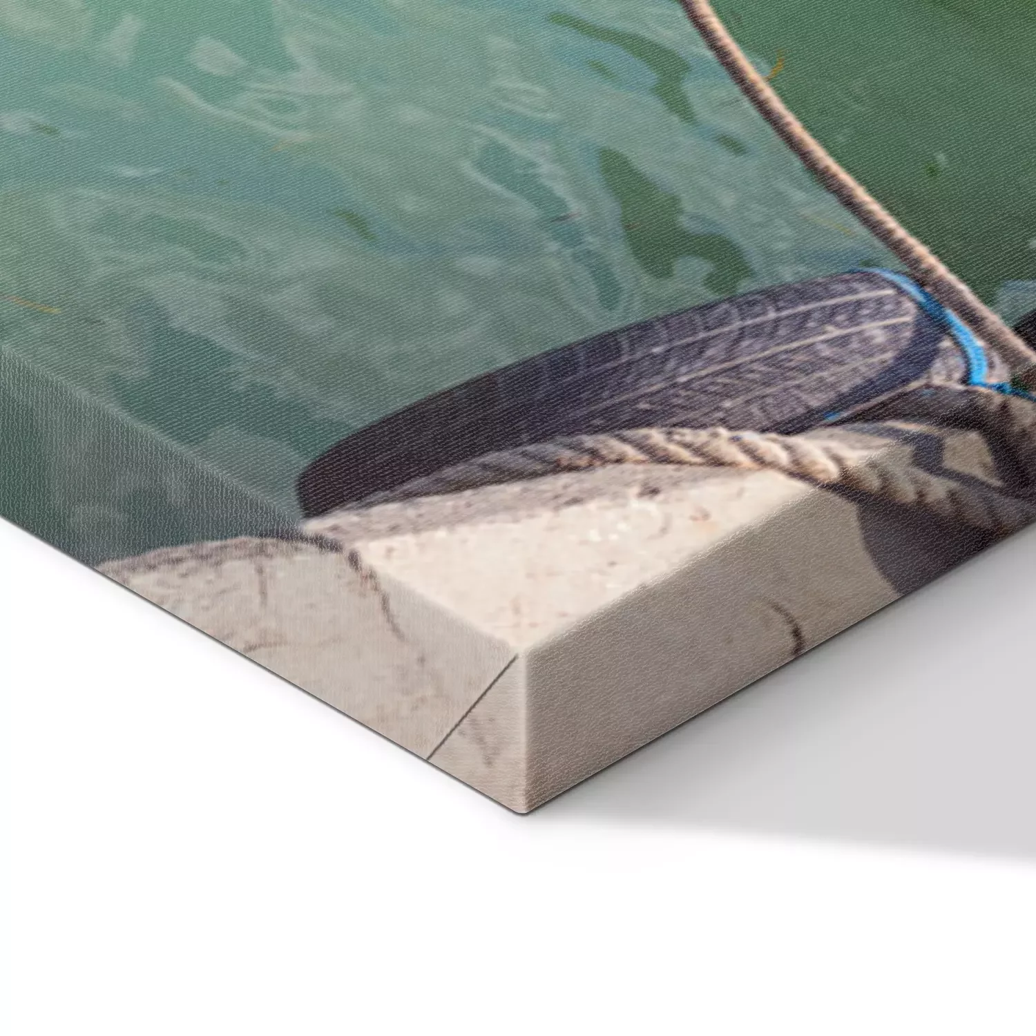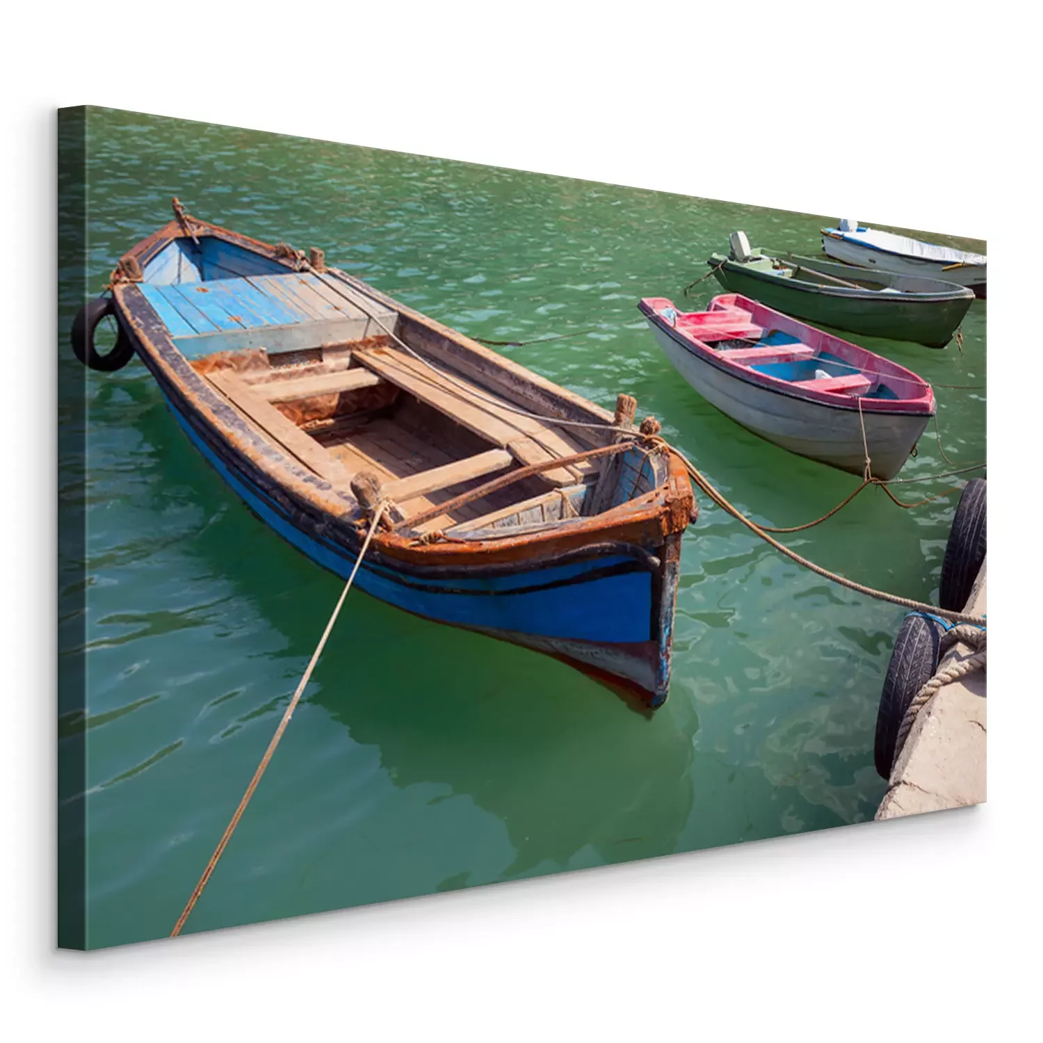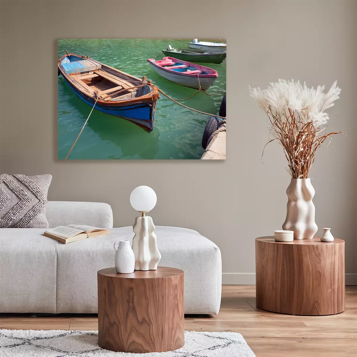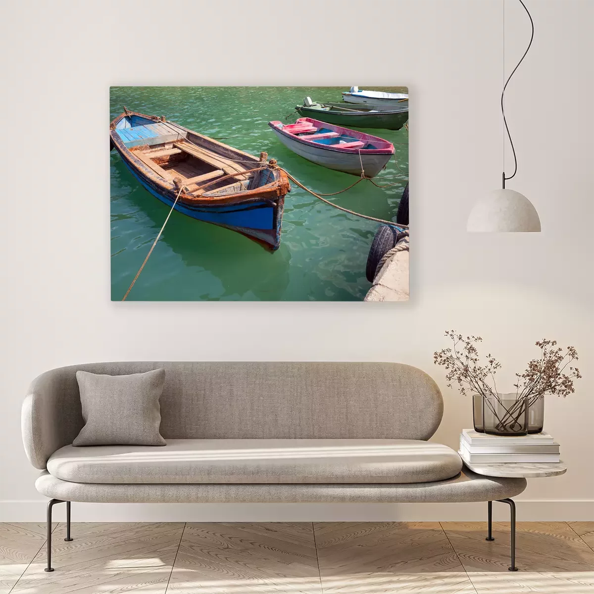 Tableau  Vieux petits bateaux de pêche en bois amarrés dans la petite ville bulgare