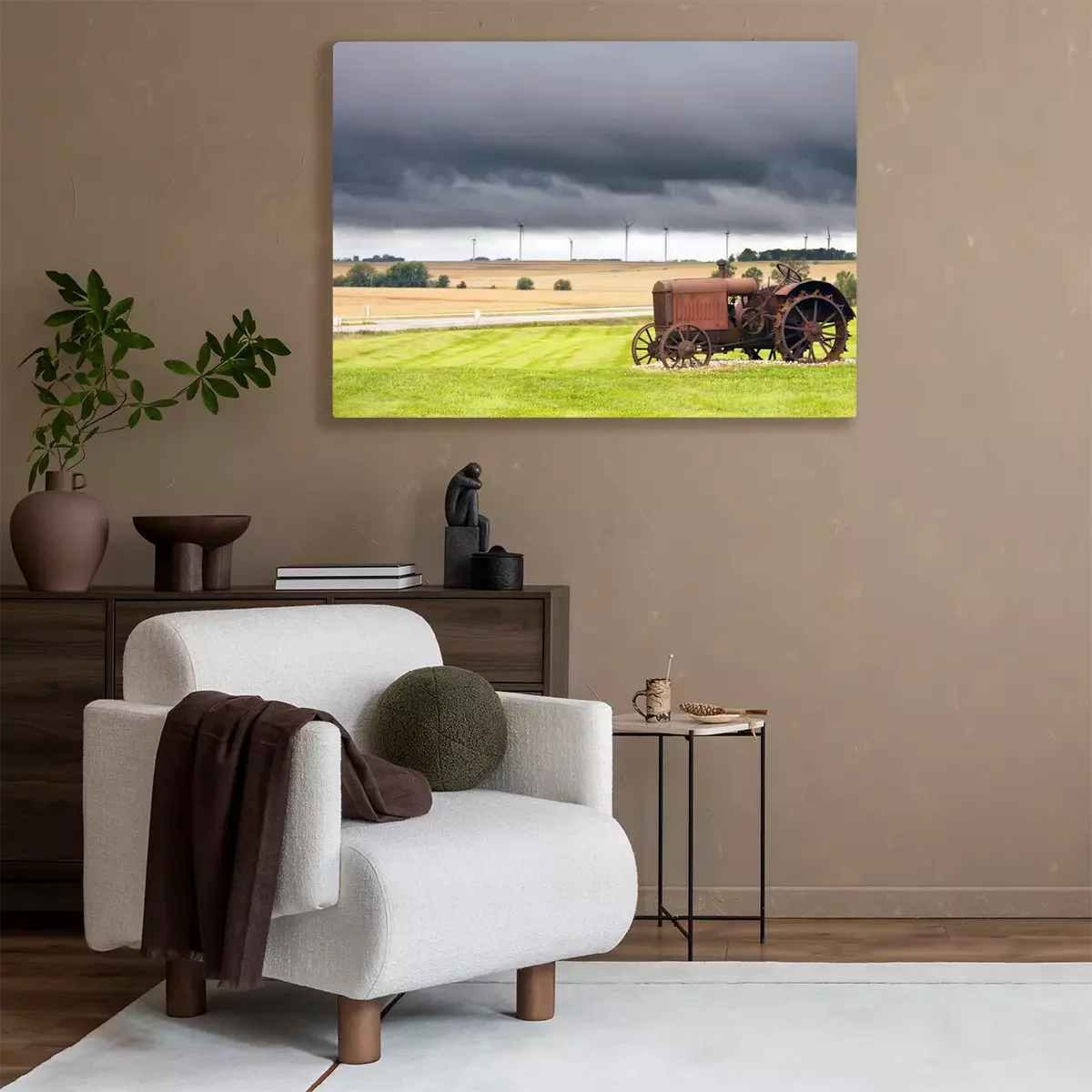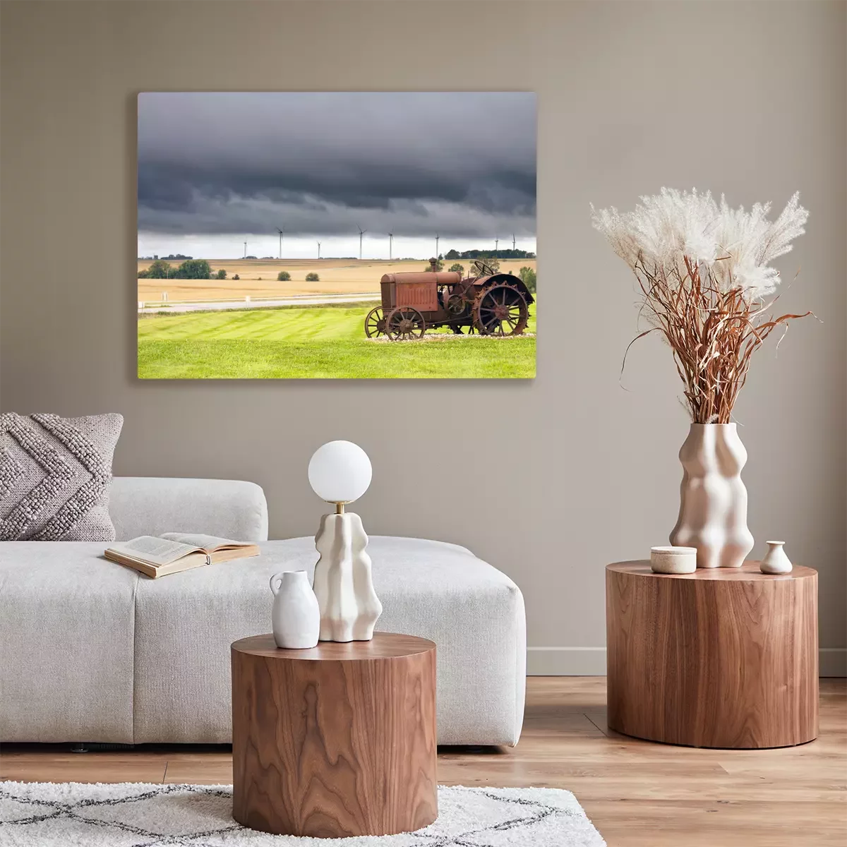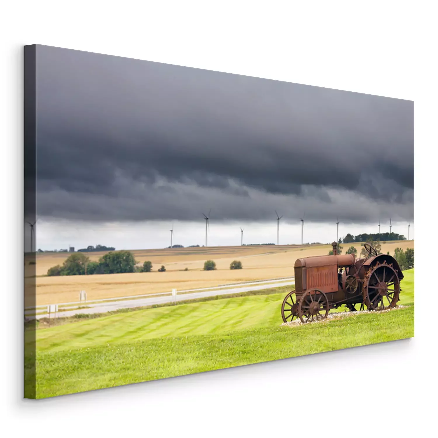 Tableau  Vieux tracteur rouillé avec un temps d'orage en arrière-plan