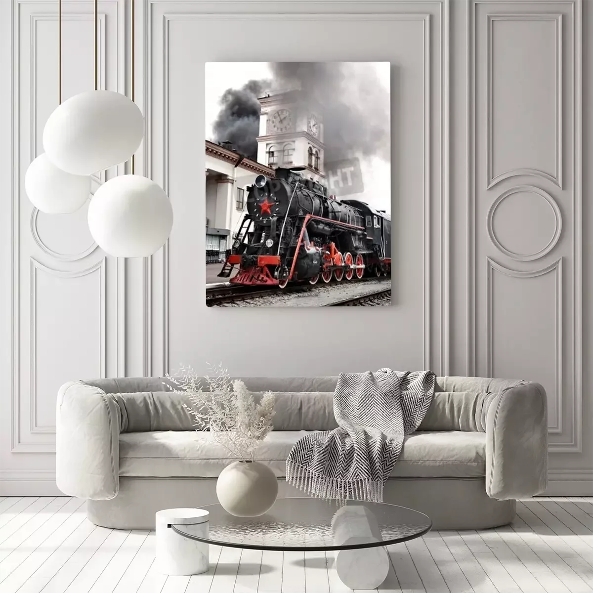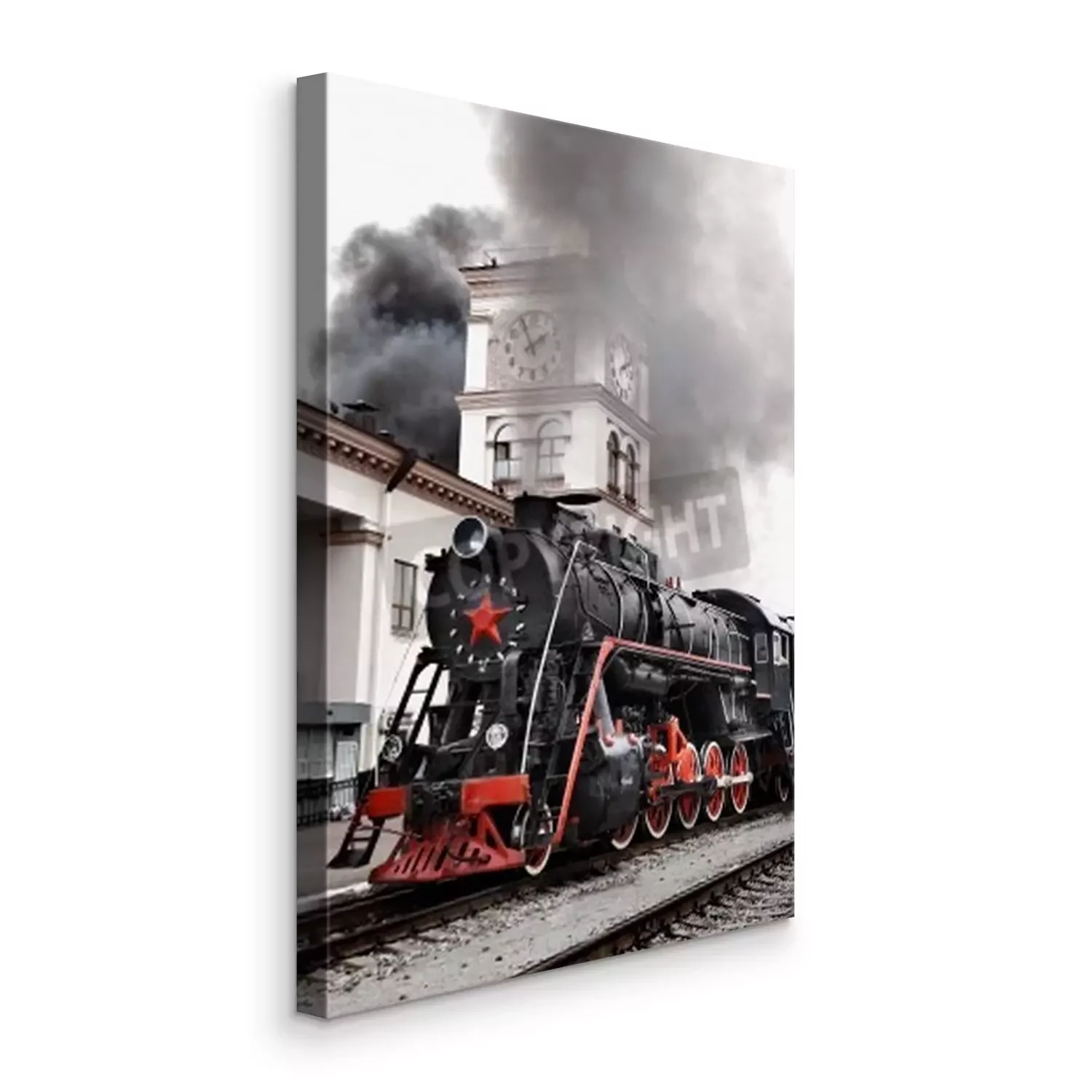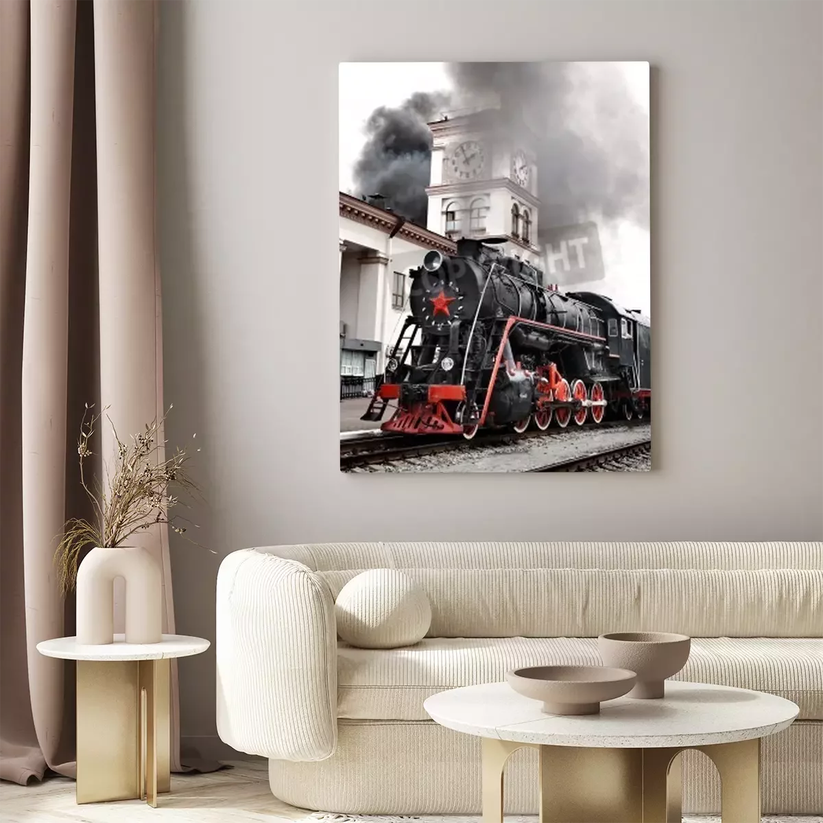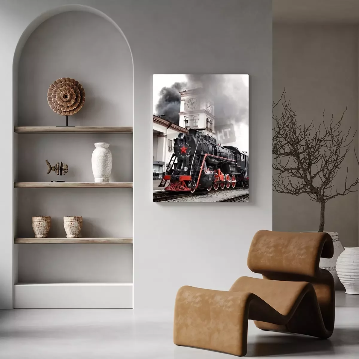 Tableau  Vieux train à vapeur quitte une station. Vintage moteur de train à vapeur de la locomotive se déplaçant vers le bas voie ferrée vers la caméra.