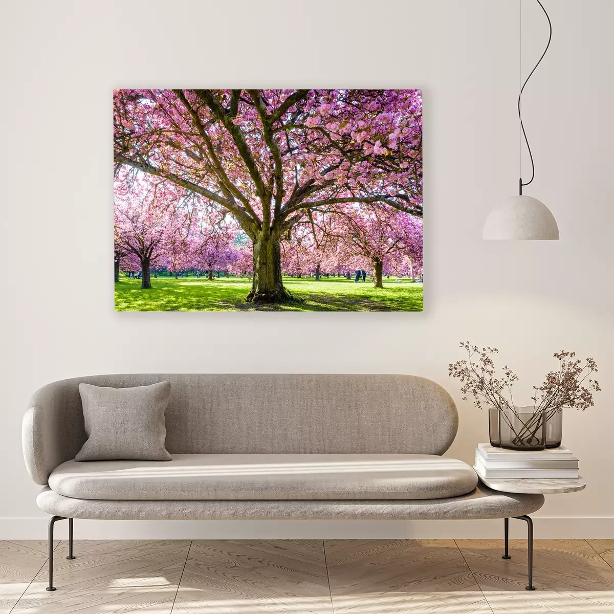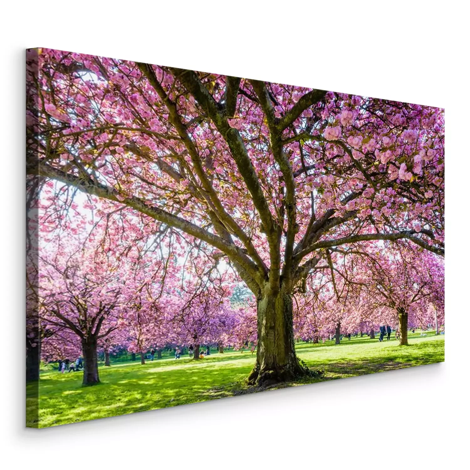 Tableau  View from below of a blossoming Japanese cherry tree in a grassy meadow by a sunny spring afternoon, with branches laden with clusters of pink flowers.
