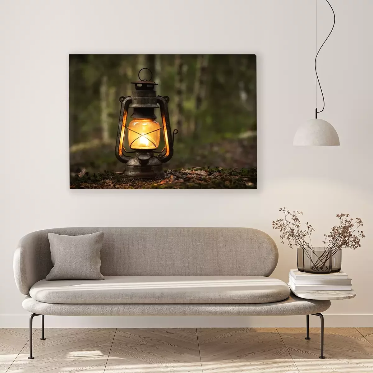 Tableau  Vintage old lantern lighting in the dark forest. Travel camping concept. Burning lantern on a moss at forest in the night.