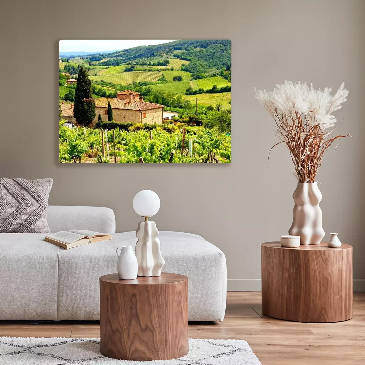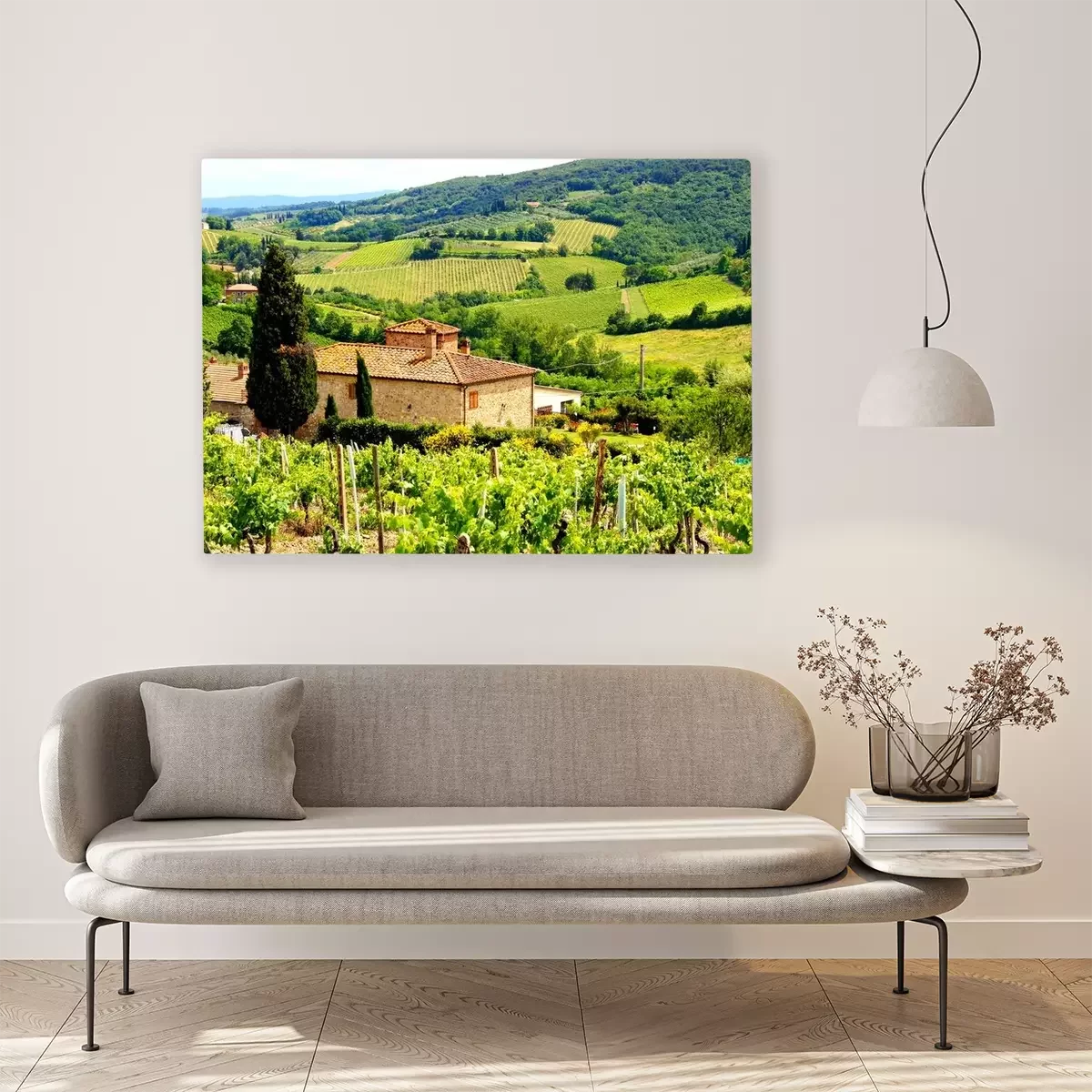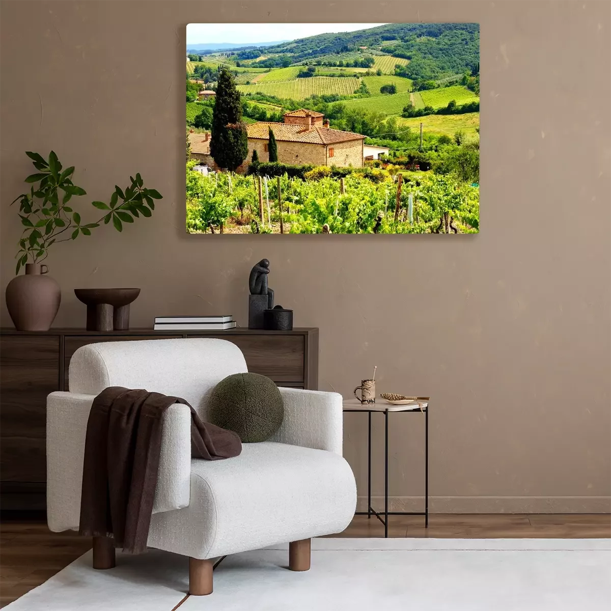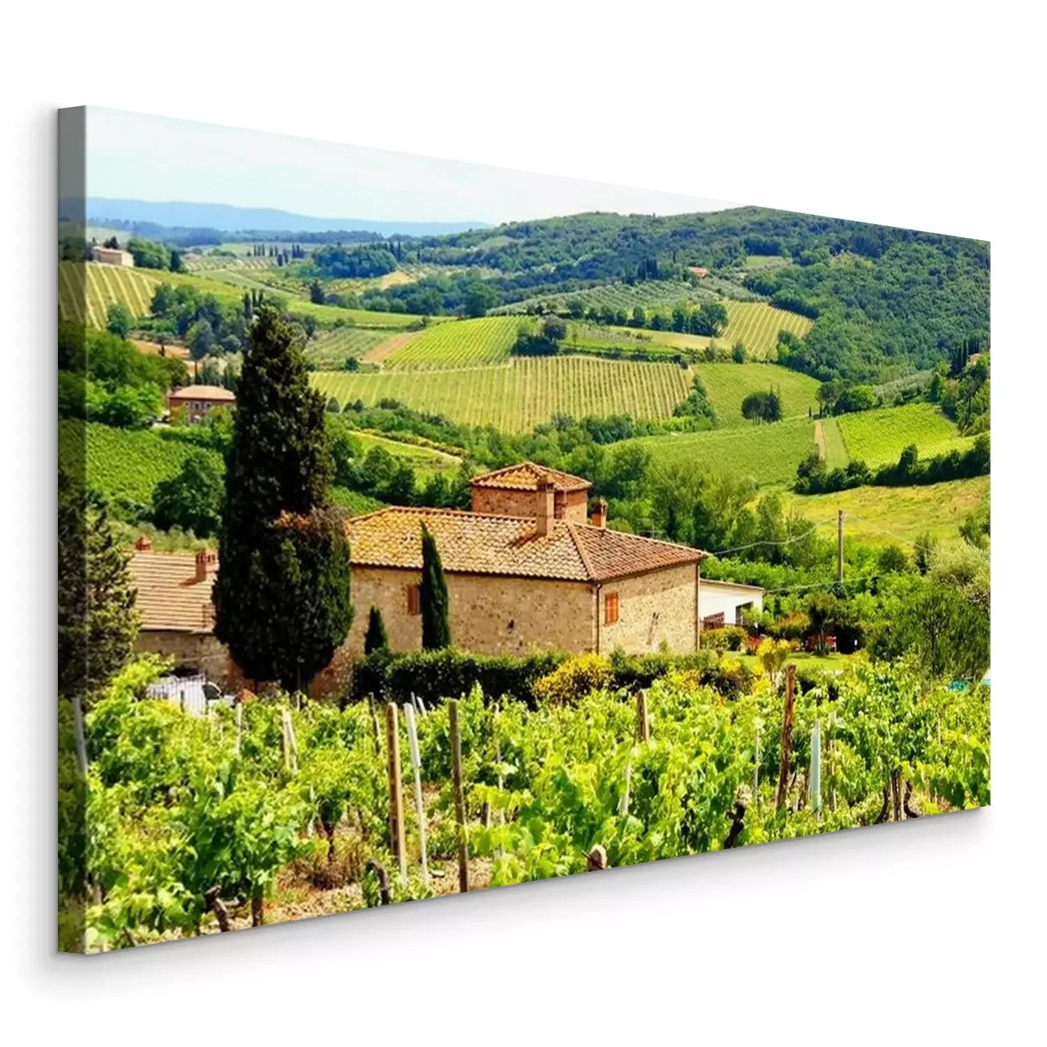 Tableau : Voir à travers les vignobles avec maison en pierre, Toscane, Italie