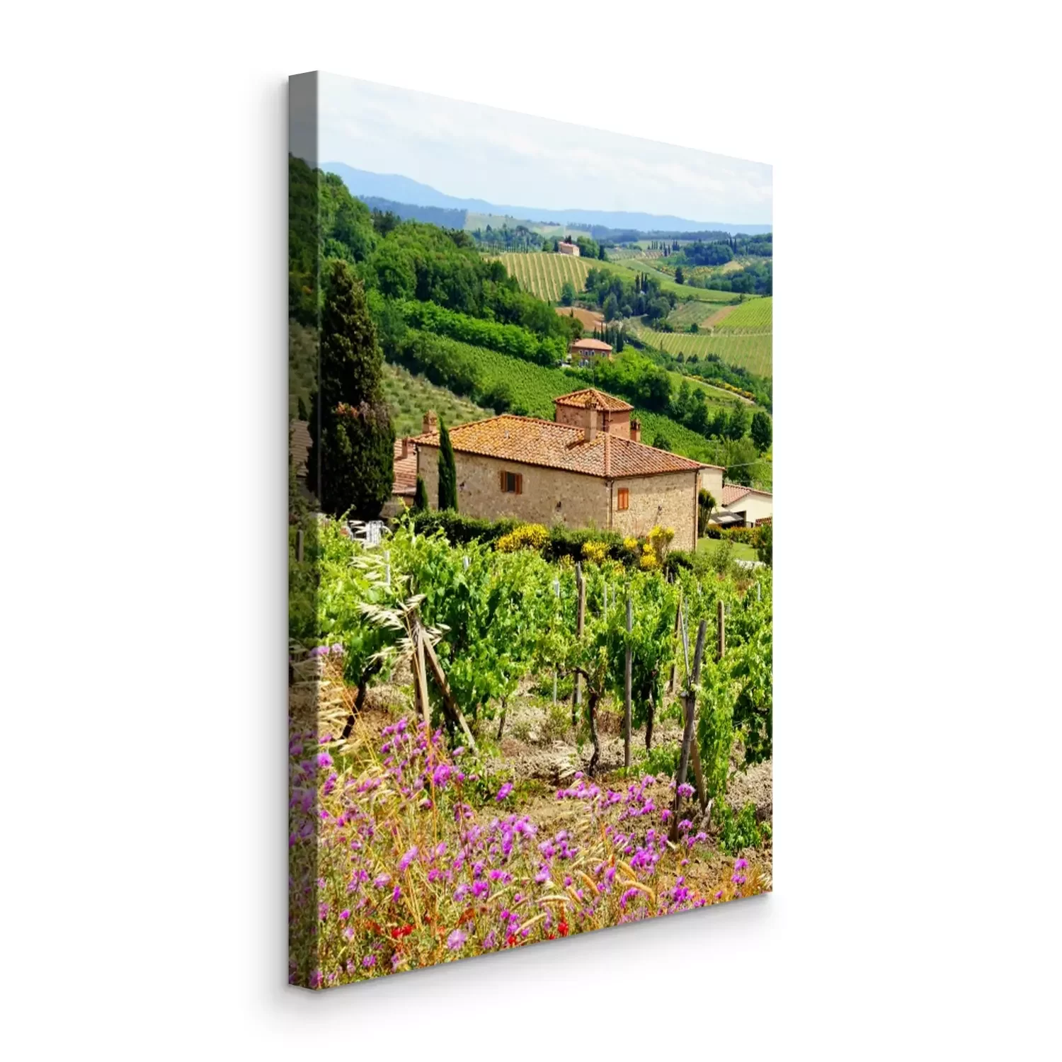 Tableau : Voir à travers les vignobles avec maison en pierre, Toscane, Italie