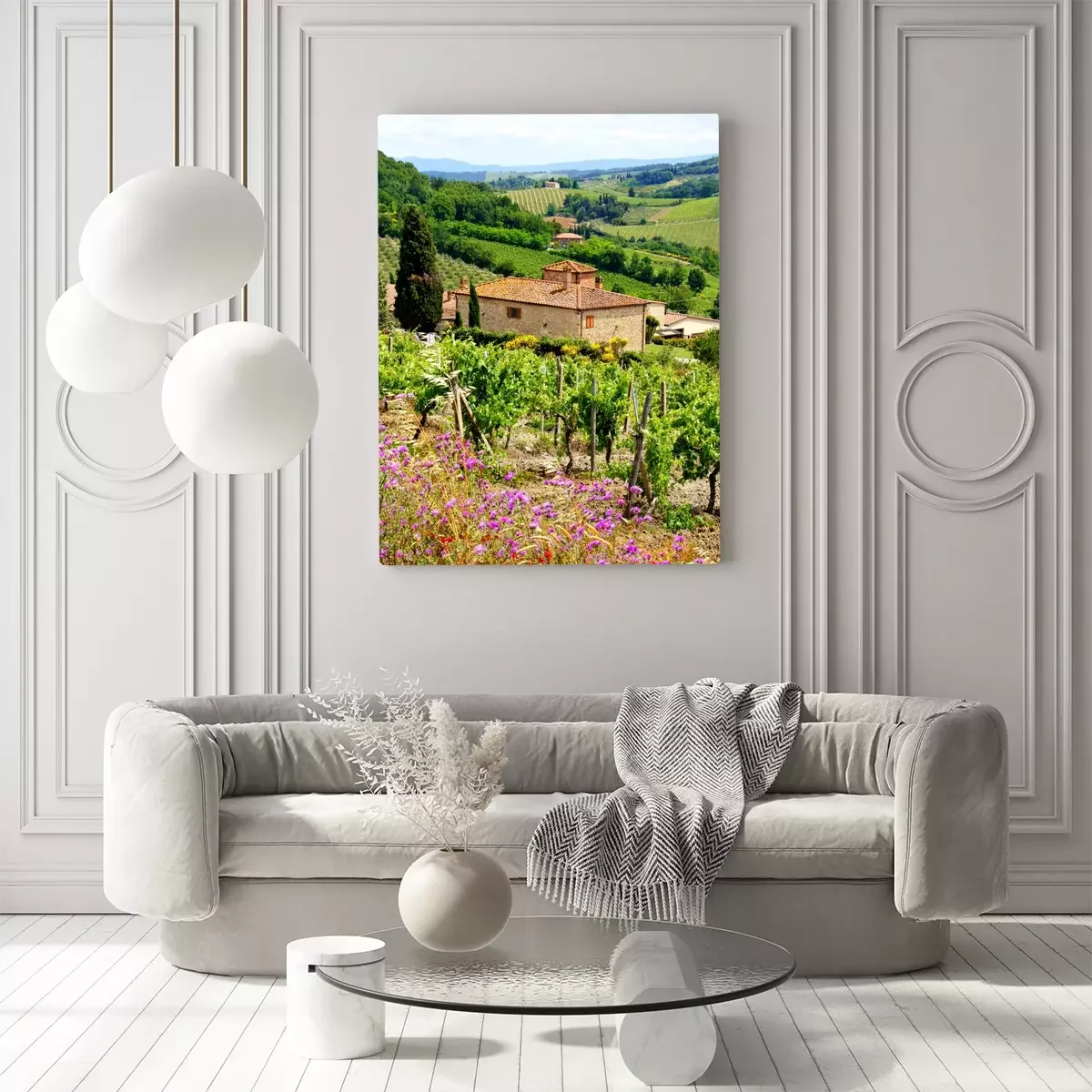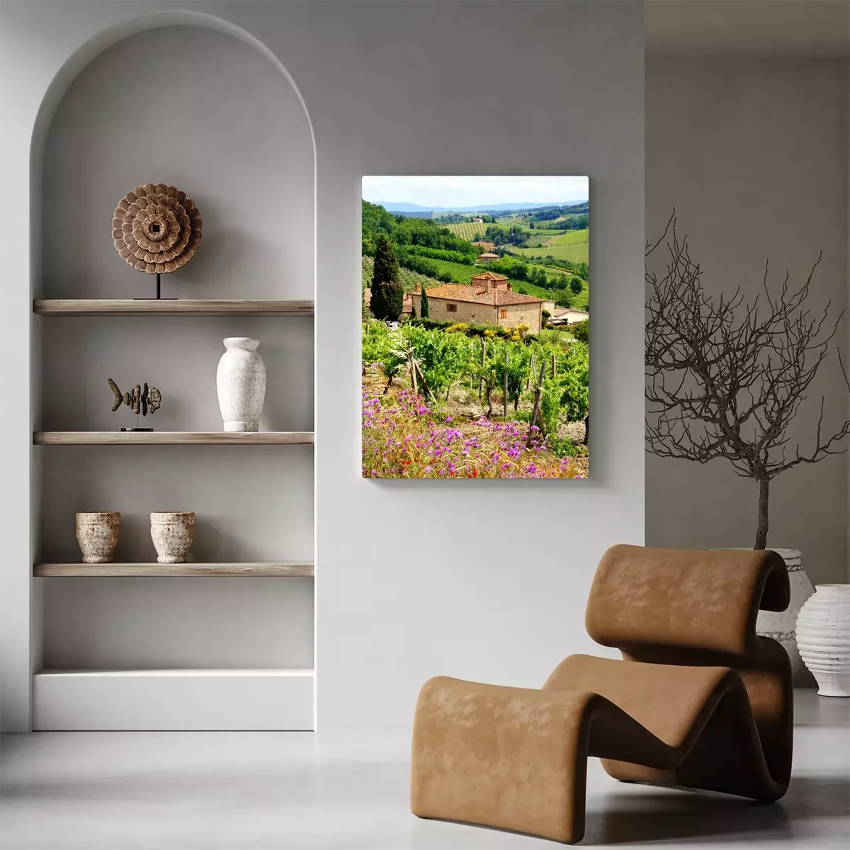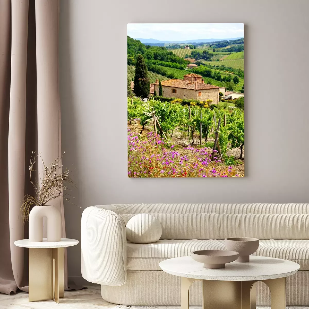 Tableau  Voir à travers les vignobles avec maison en pierre, Toscane, Italie