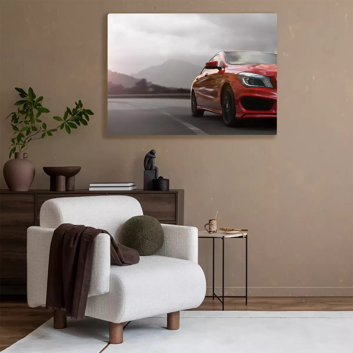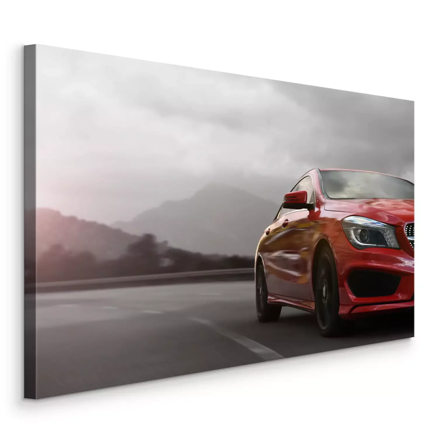Tableau  voiture d'affaires rouge, excès de vitesse sur une route de montagne avec le flou de mouvement