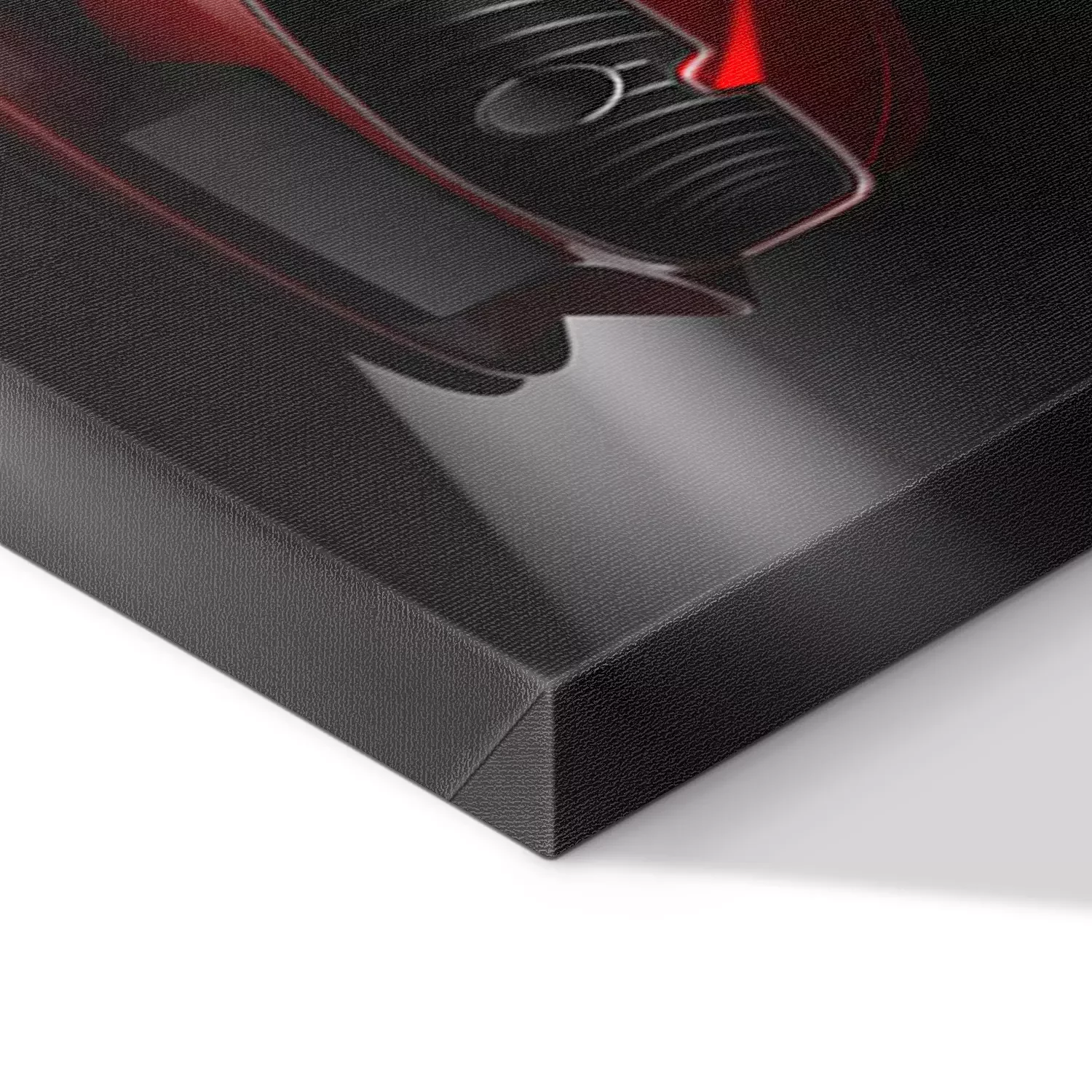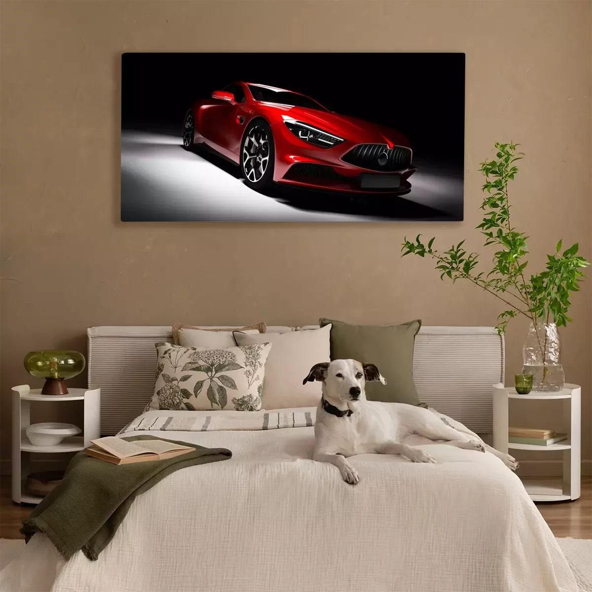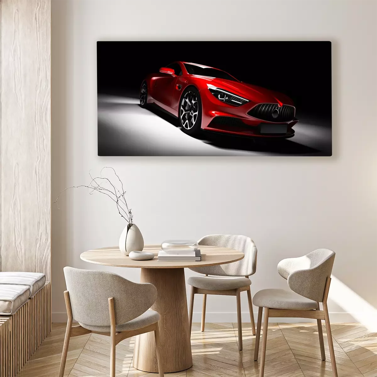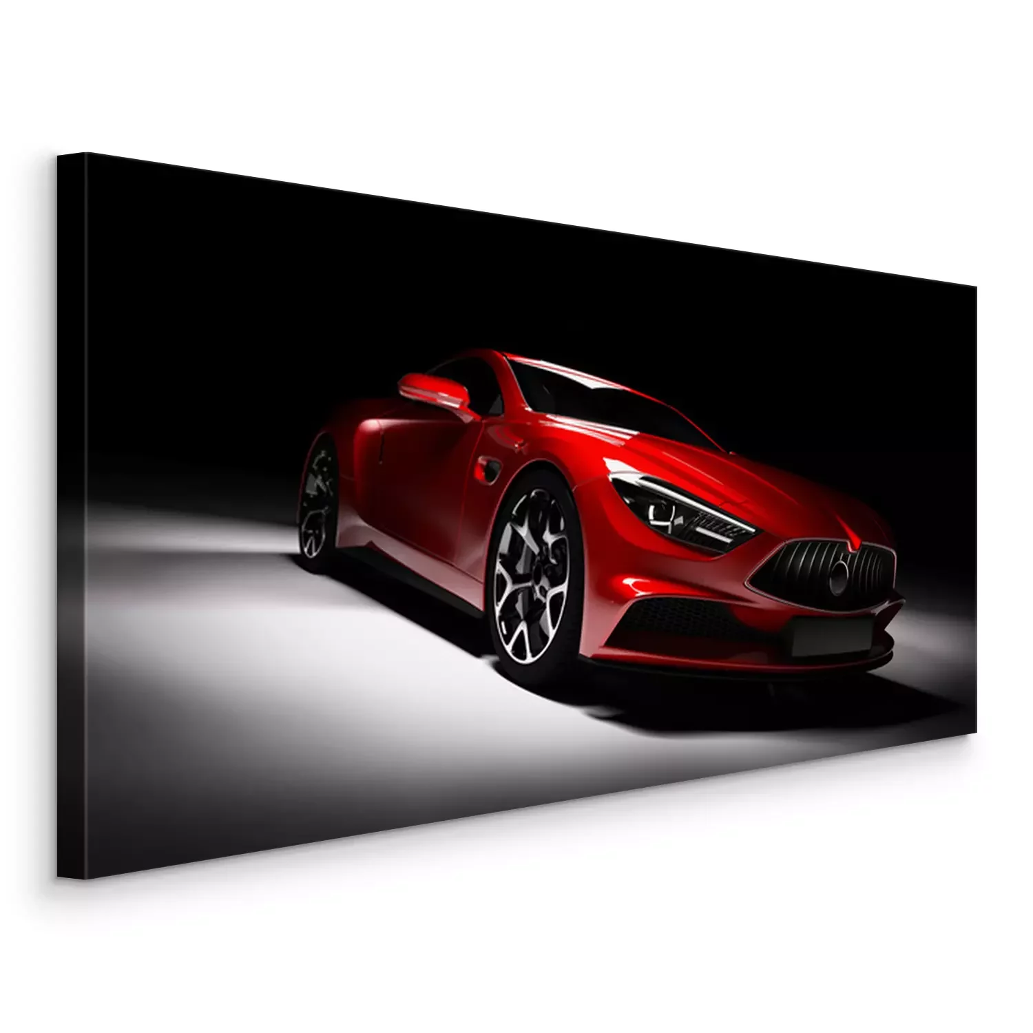 Tableau : Voiture de sport rouge moderne à l'honneur sur un fond noir.