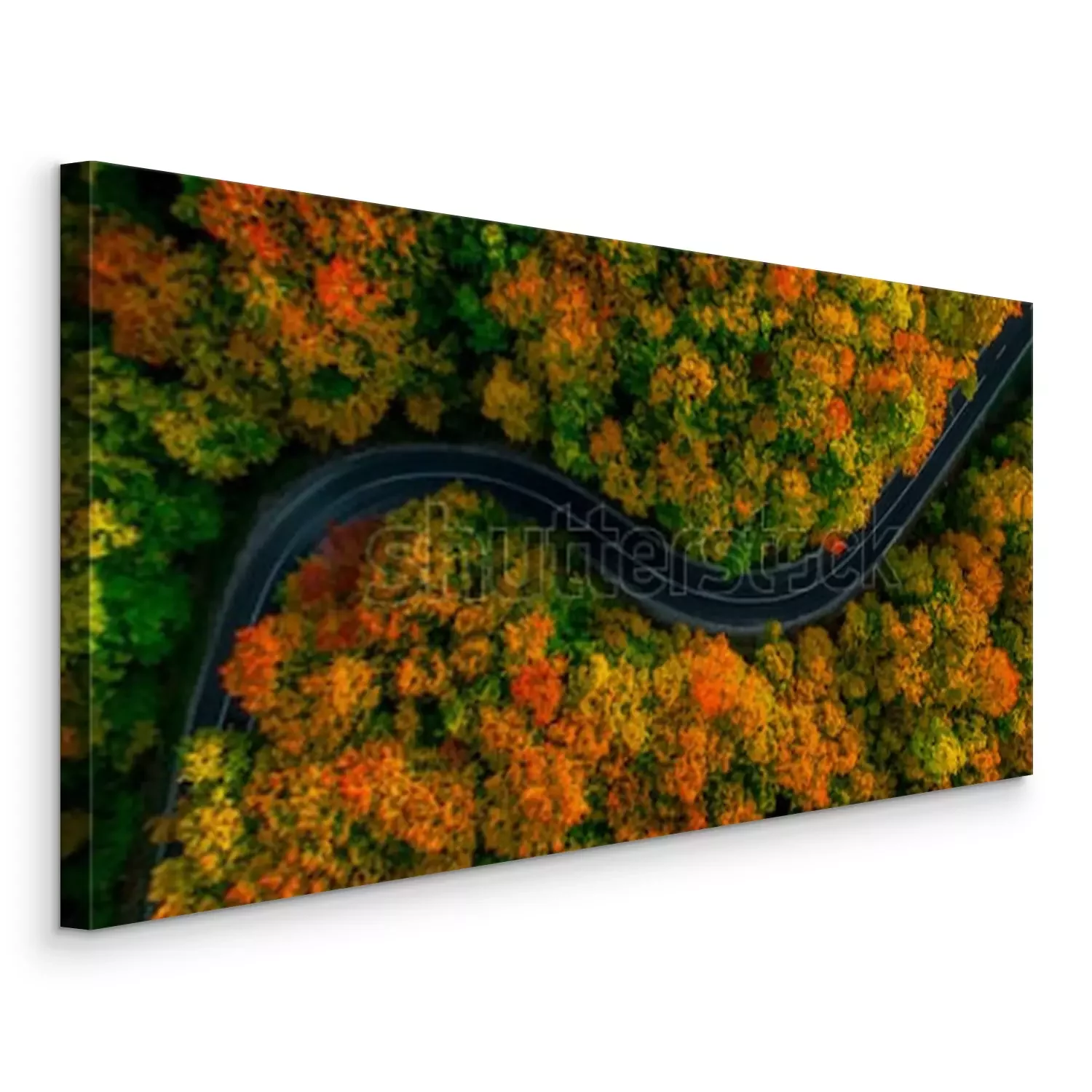 Tableau  Vue aérienne de la forêt épaisse en automne avec une route qui traverse