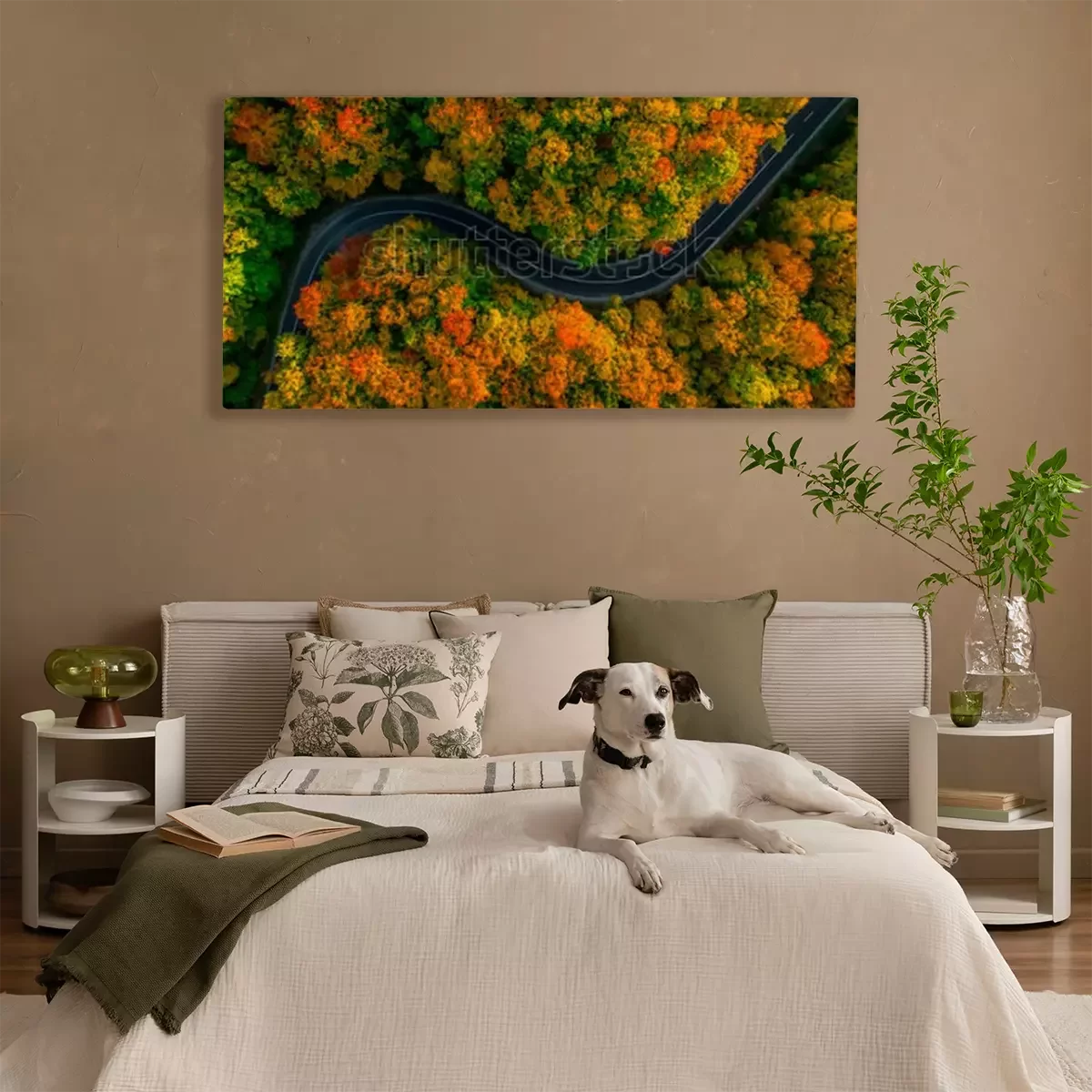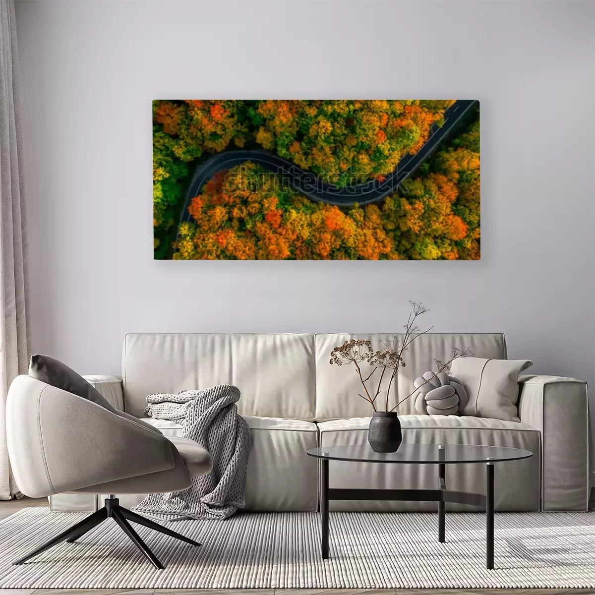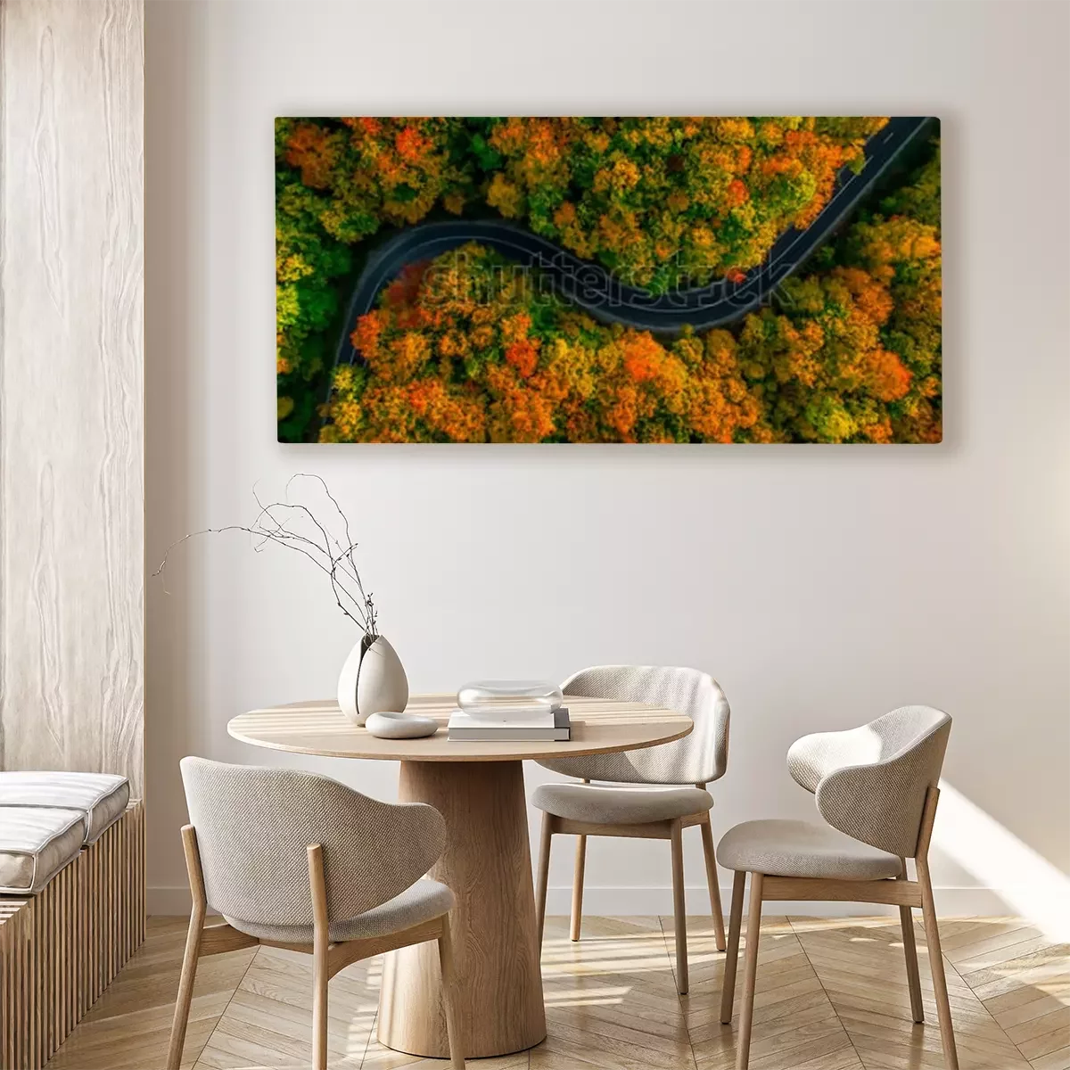 Tableau : Vue aérienne de la forêt épaisse en automne avec une route qui traverse