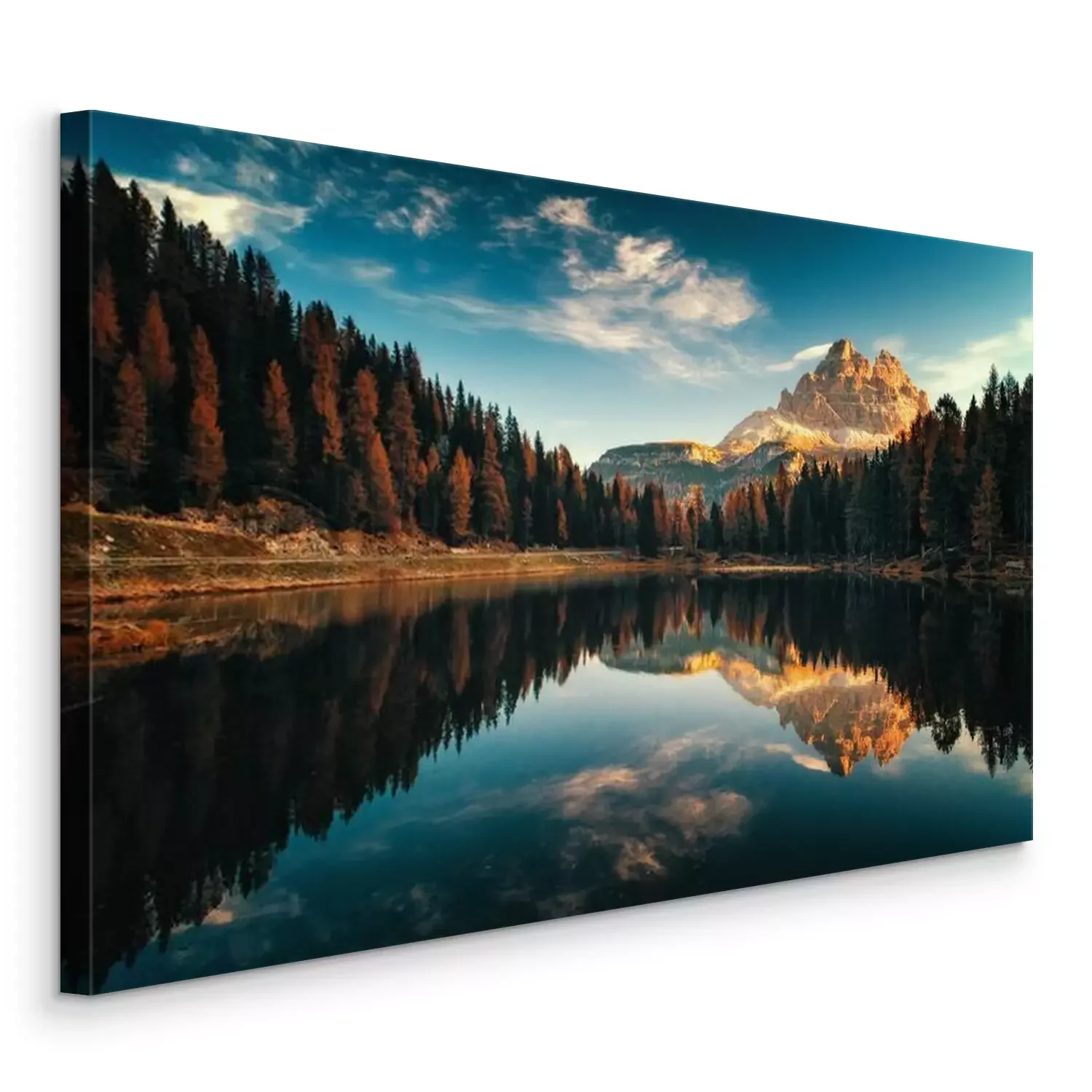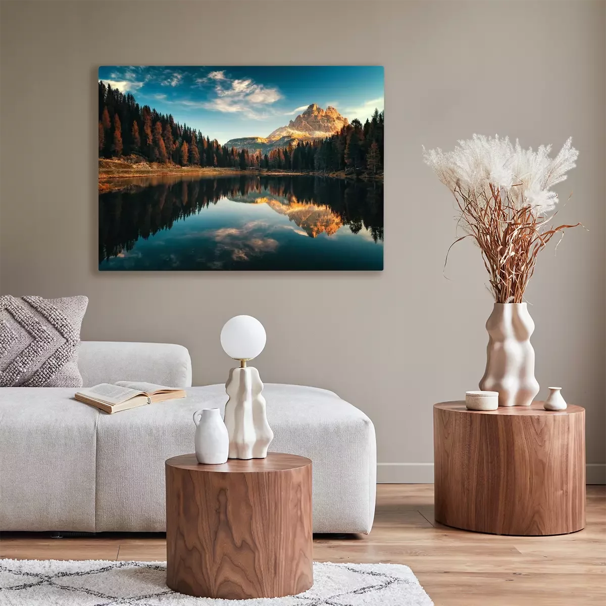 Tableau  Vue aérienne de Lago Antorno, Dolomites, paysage de montagne du lac avec pic des Alpes, Misurina, Cortina d'Ampezzo, Italie