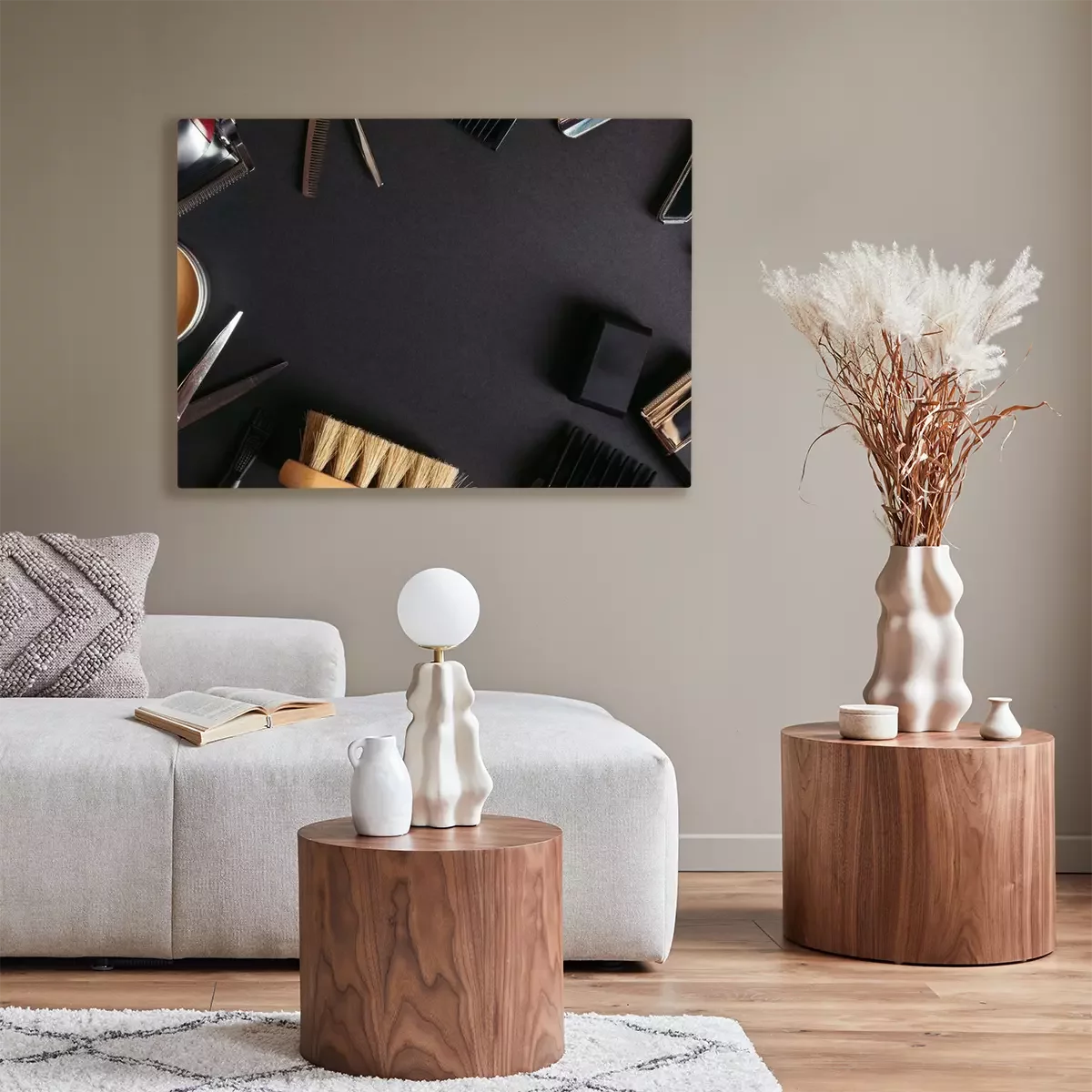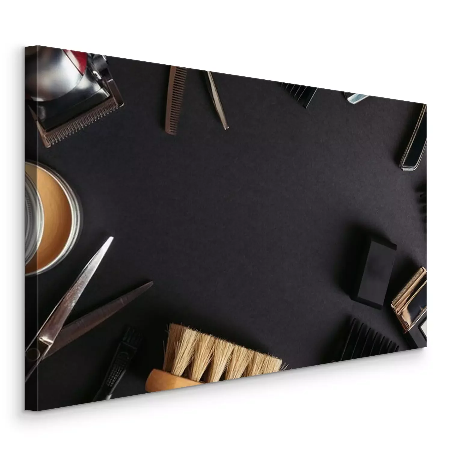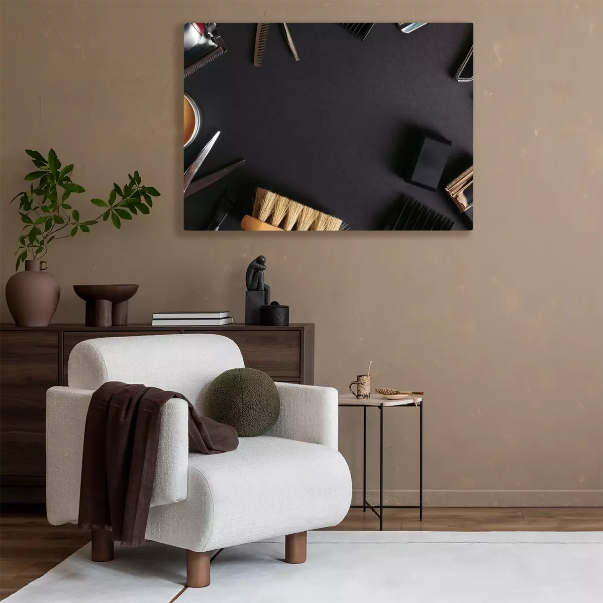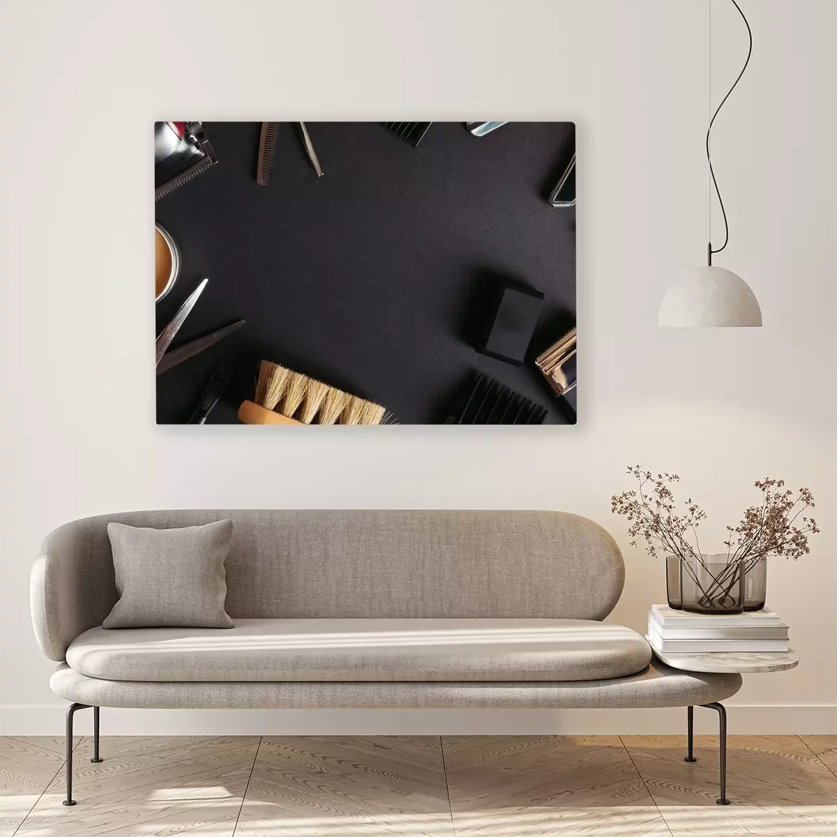 Tableau  vue de dessus de divers outils de coiffeur professionnel sur fond noir