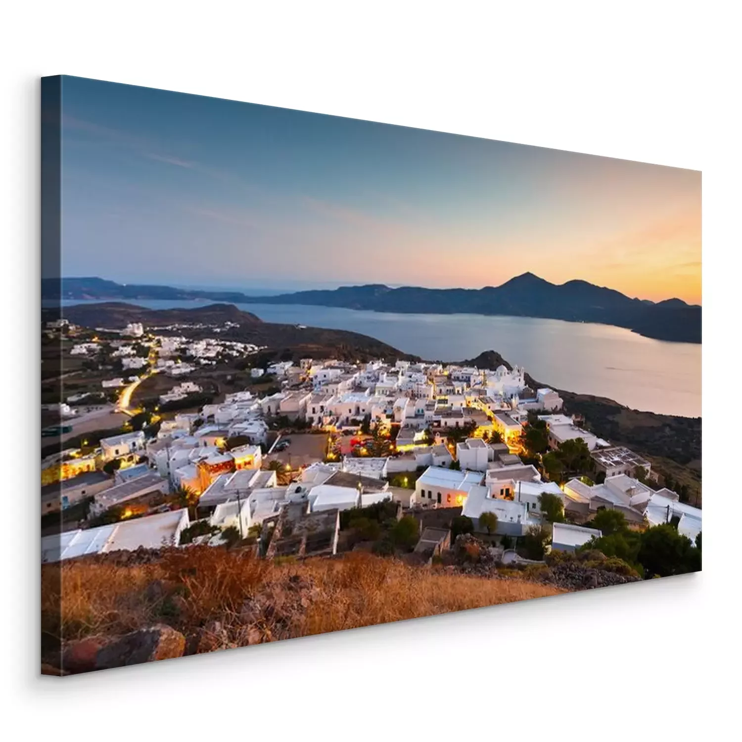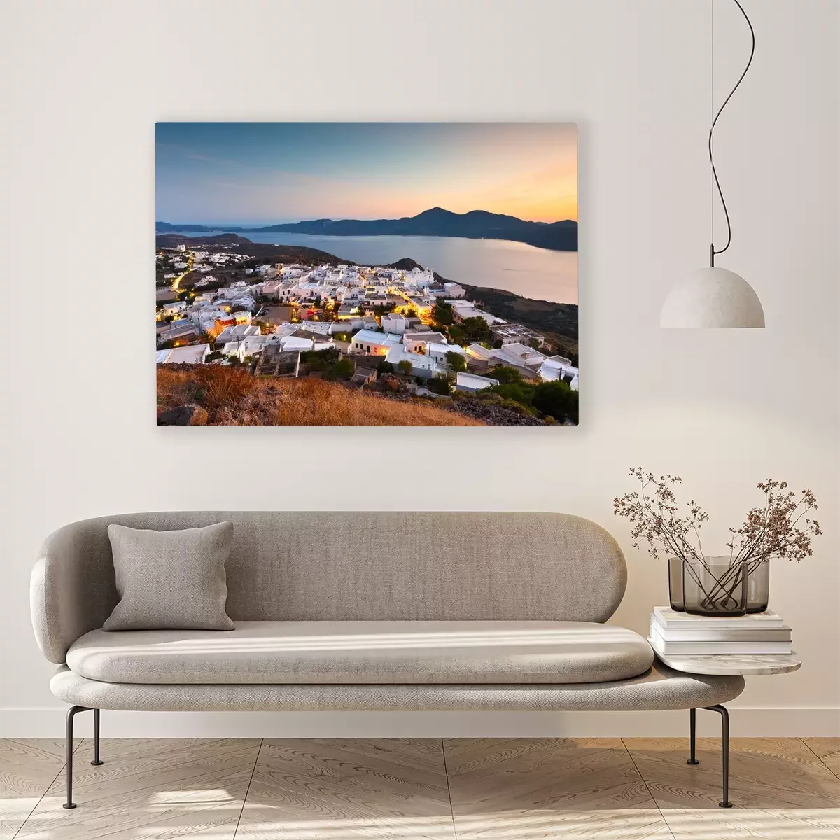 Tableau  Vue de la baie de Milos et du village de Plaka, la capitale de l'île de Milos, Grèce.