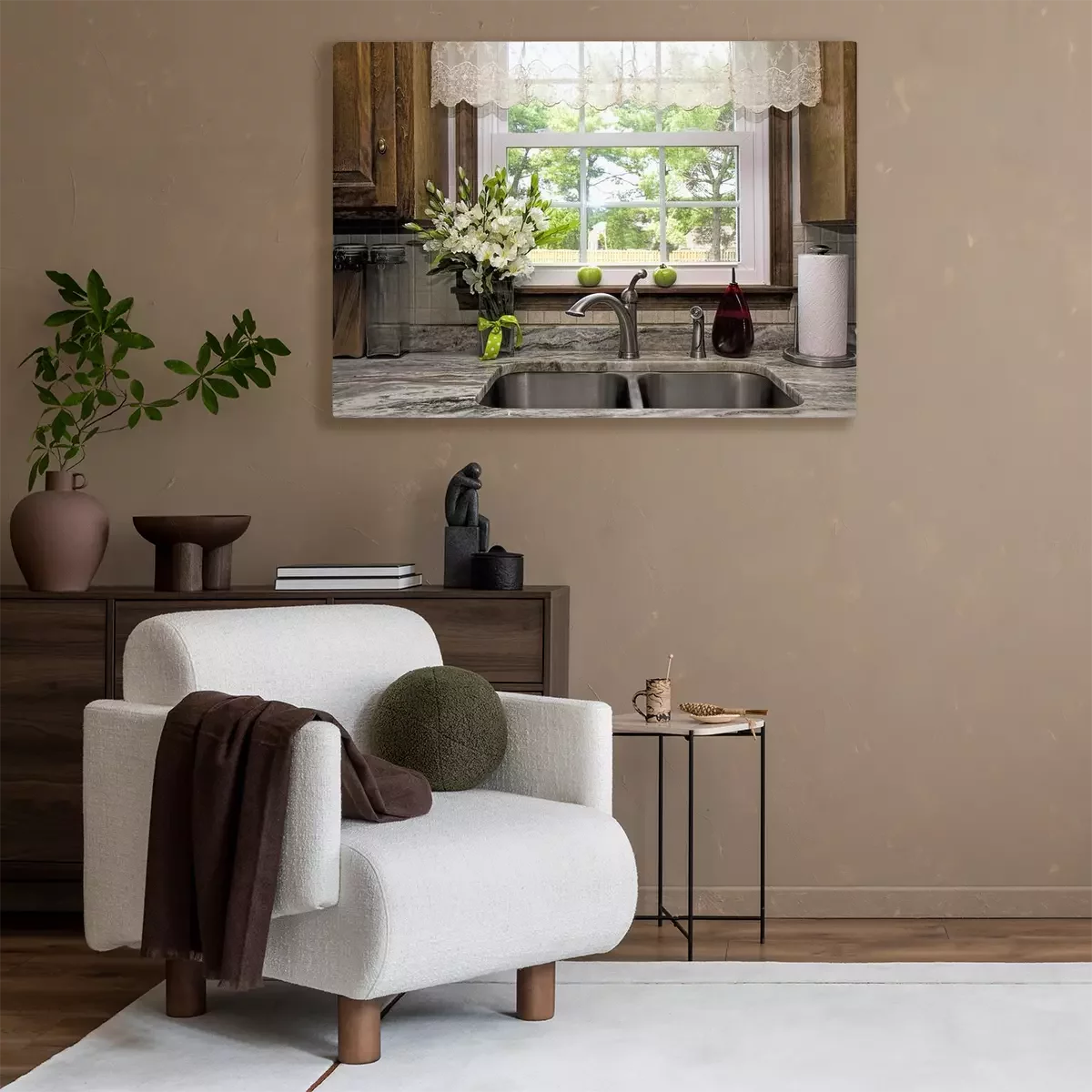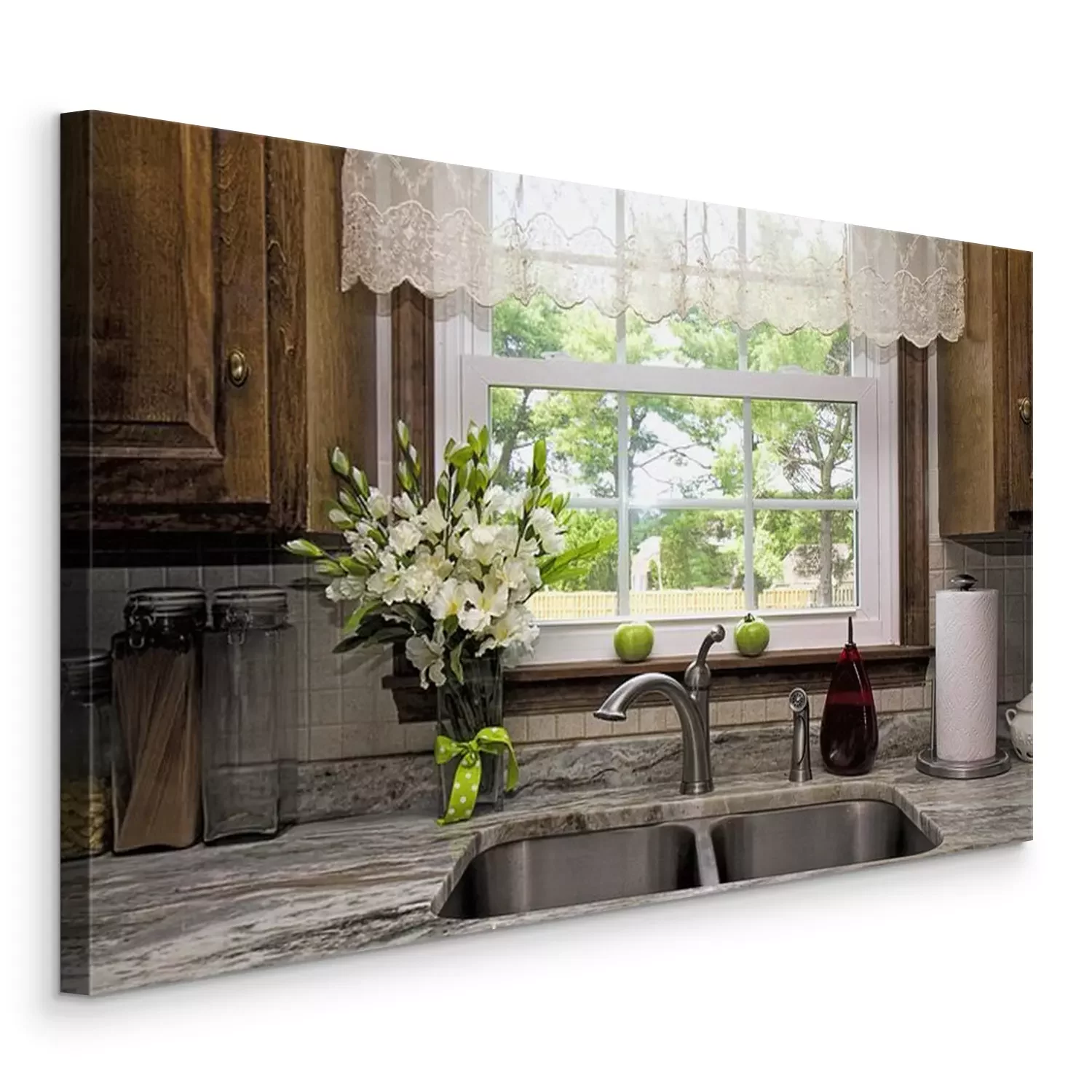 Tableau  Vue de la cuisine de la fenêtre et vue de la cour. Sheer Valance au-dessus d'un évier double en acier inoxydable et d'un comptoir en granit. Joint de fenêtre a deux tomates vertes en attente de mûrir