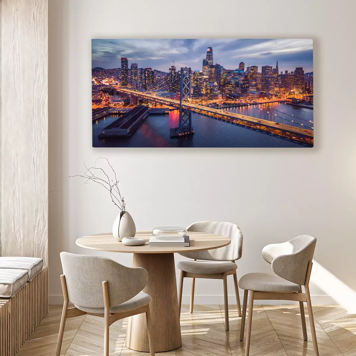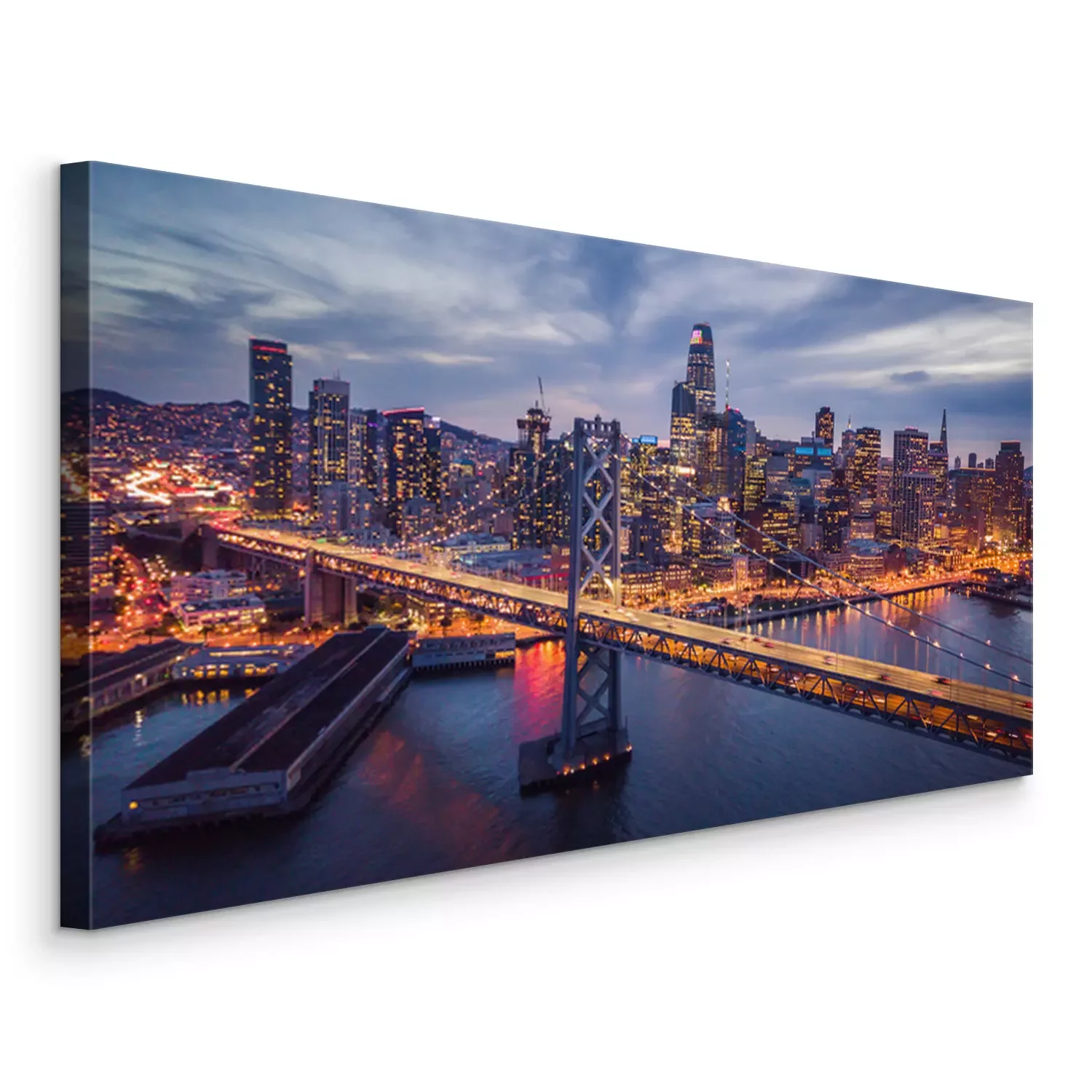 Horizon de San Francisco et Bay Bridge au coucher du soleil, en Californie