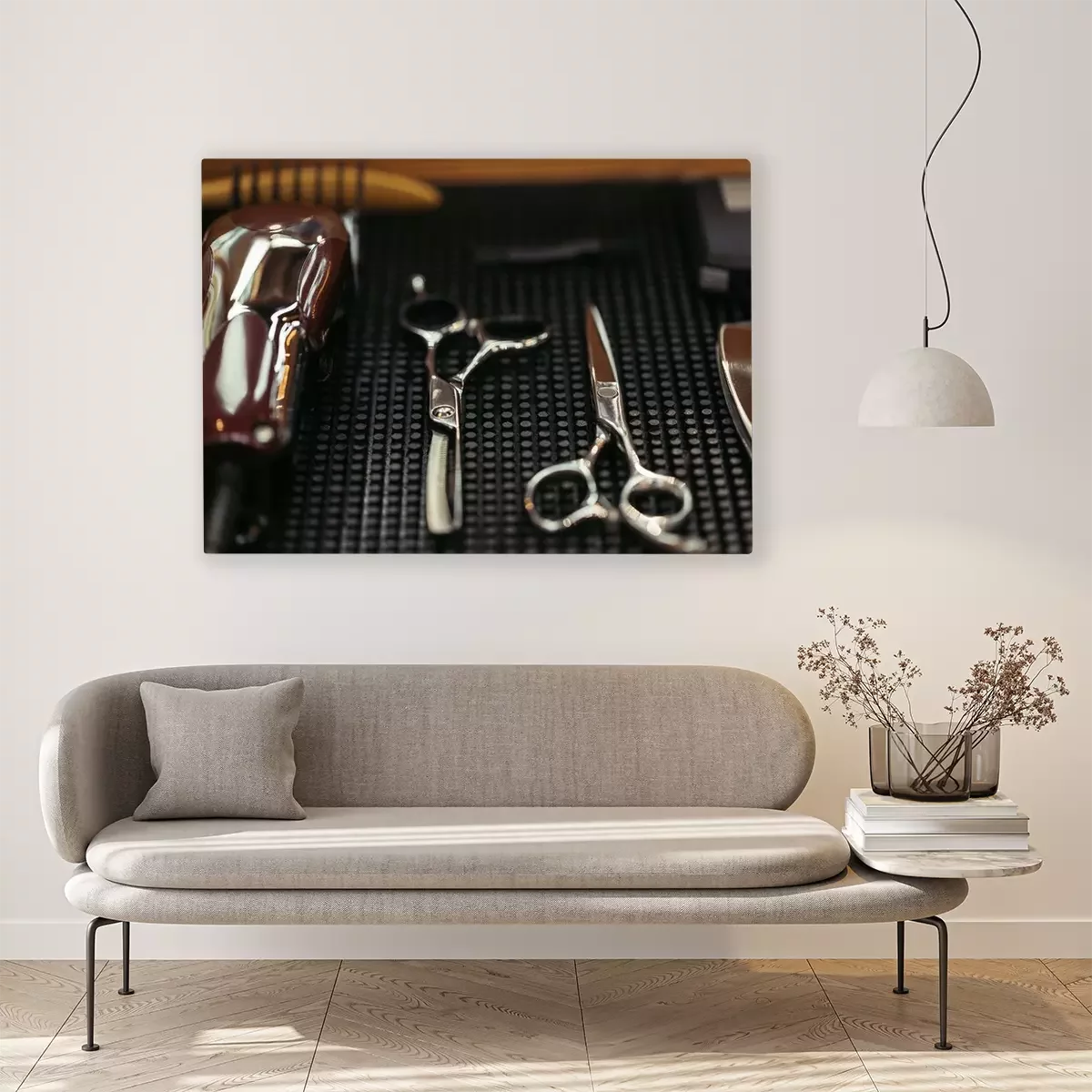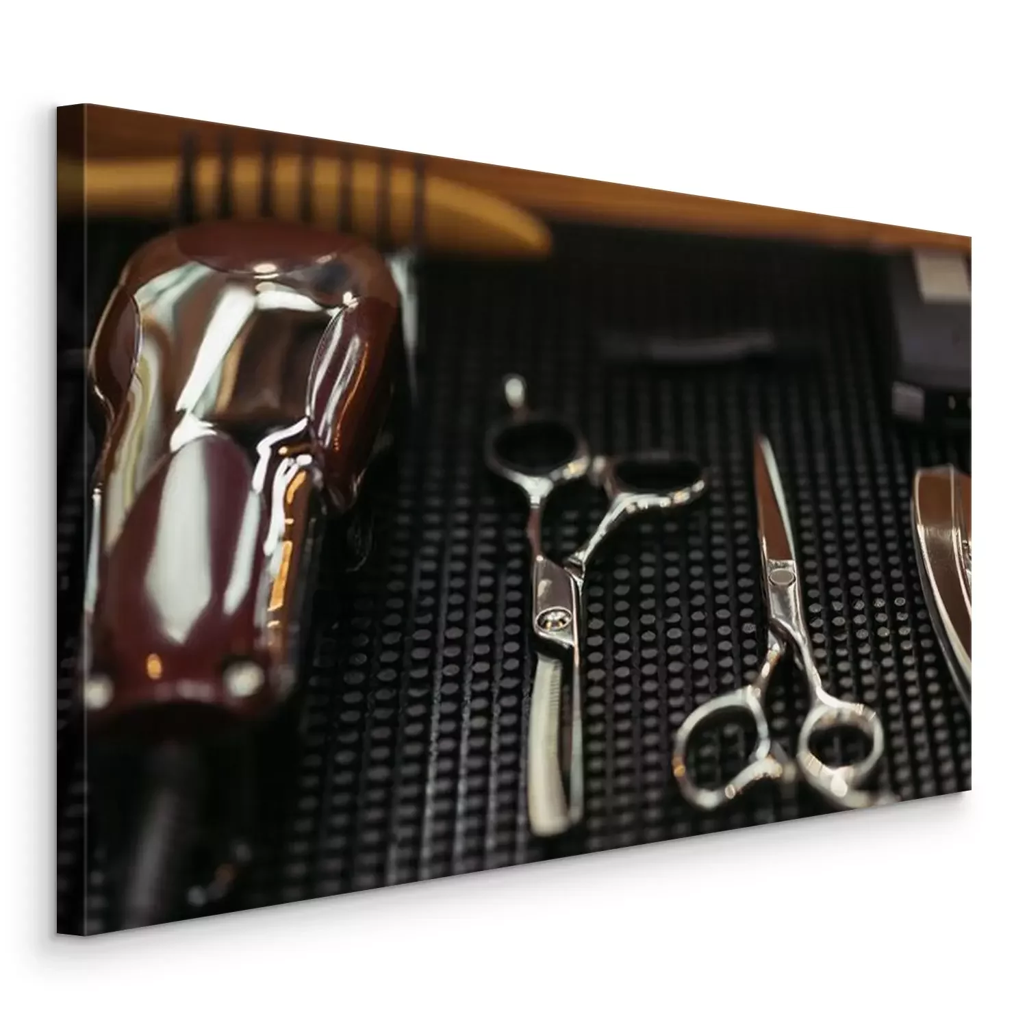 Tableau  vue rapprochée de ciseaux professionnels et tondeuse électrique dans le salon de coiffure