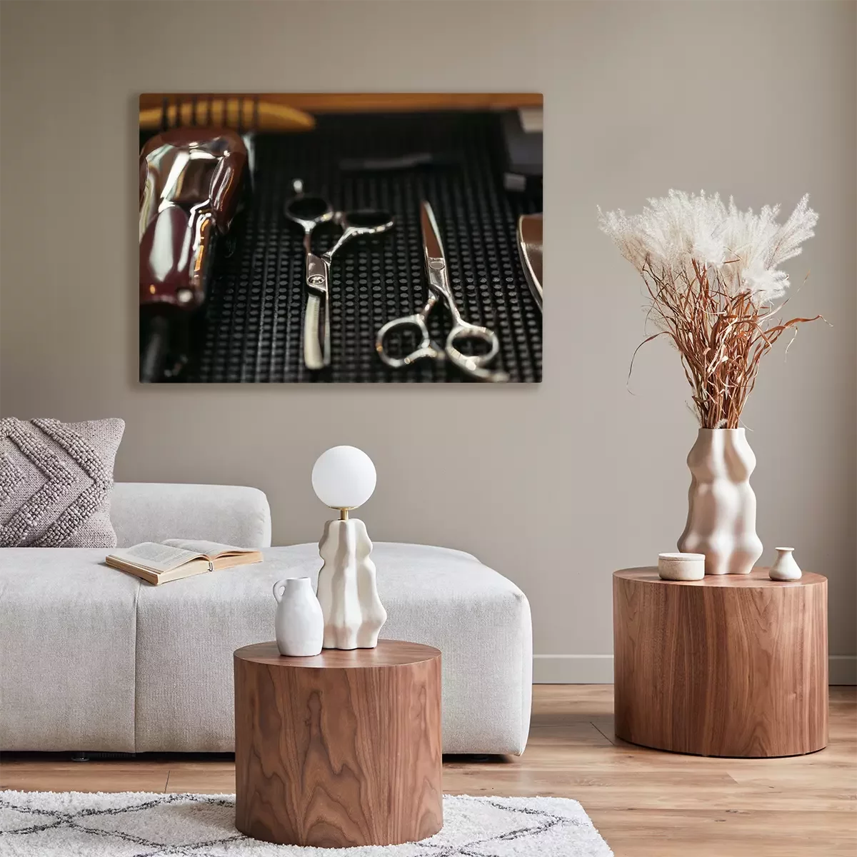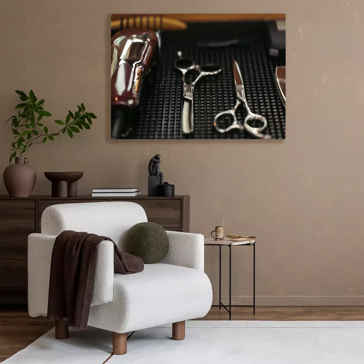 Tableau : vue rapprochée de ciseaux professionnels et tondeuse électrique dans le salon de coiffure