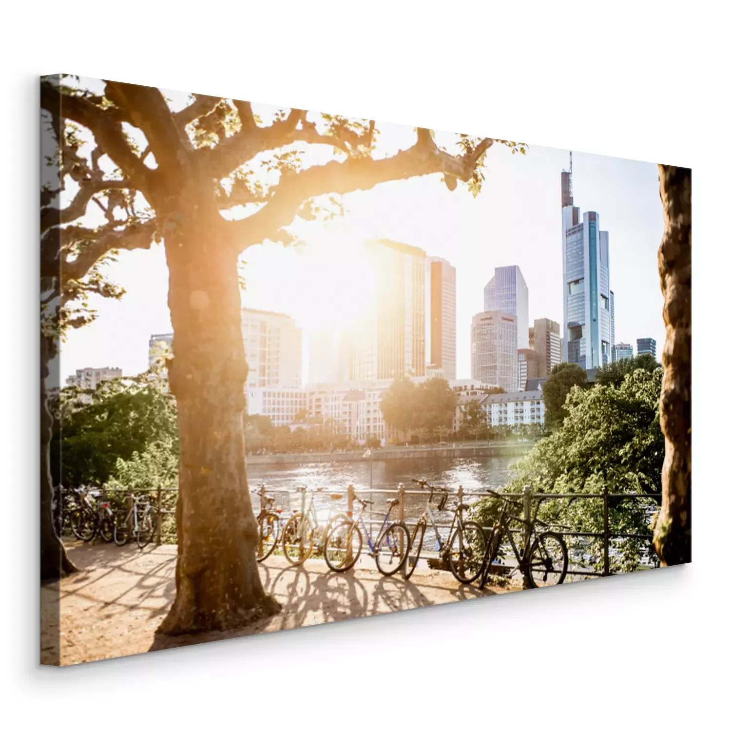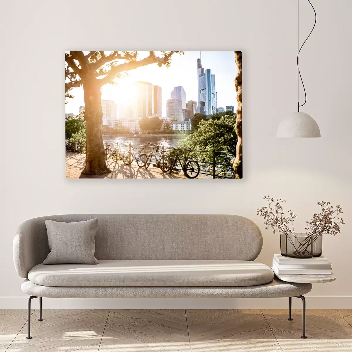Tableau  Vue sur le quartier financier avec la rivière Main et parc pendant le coucher de soleil dans la ville de Francfort, en Allemagne