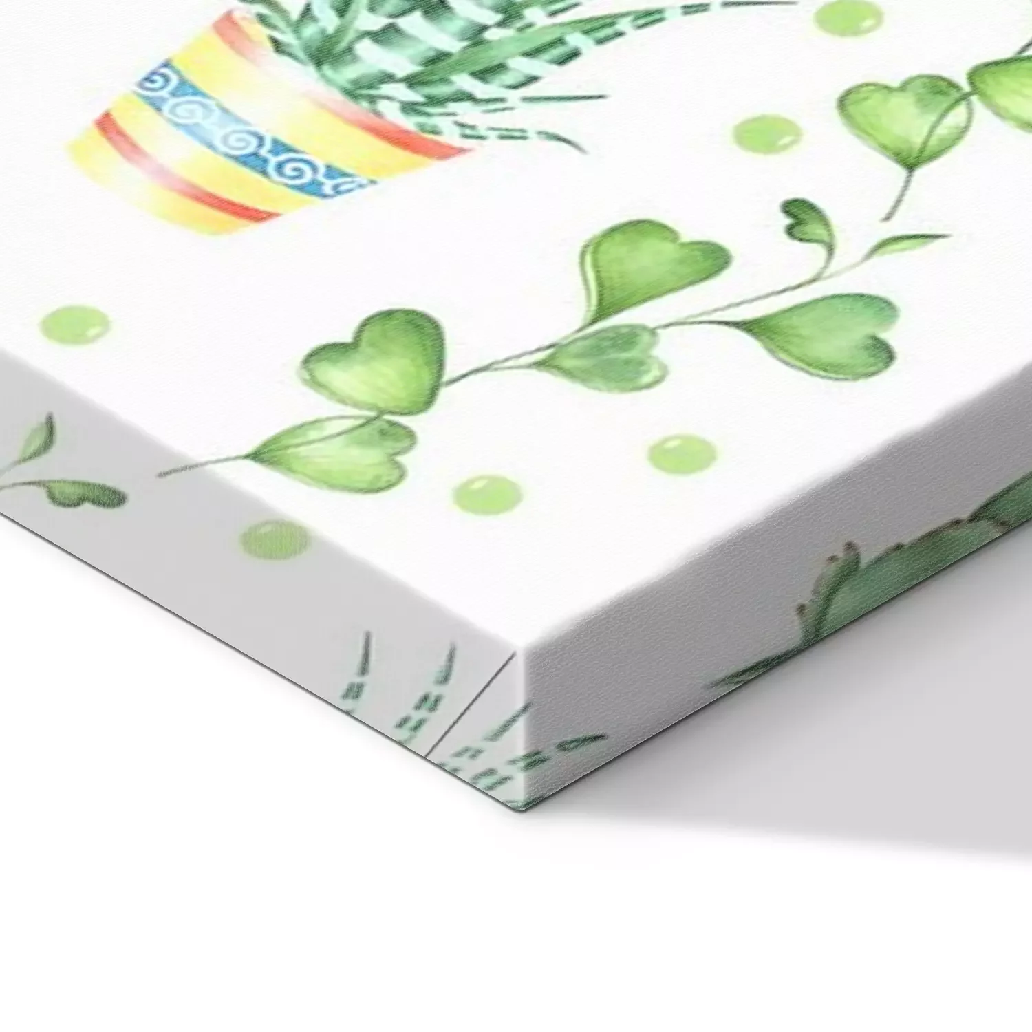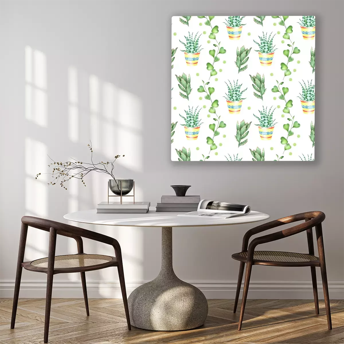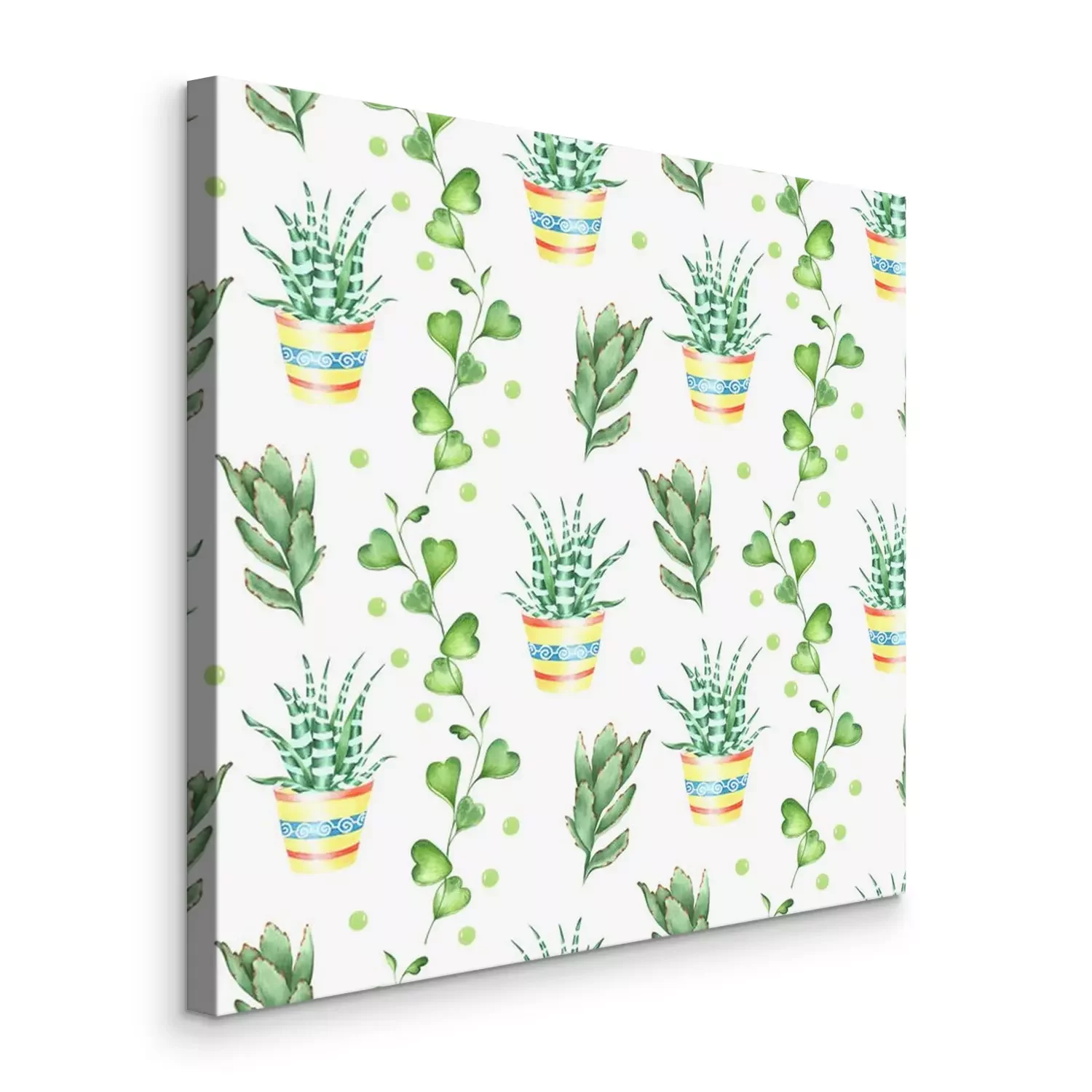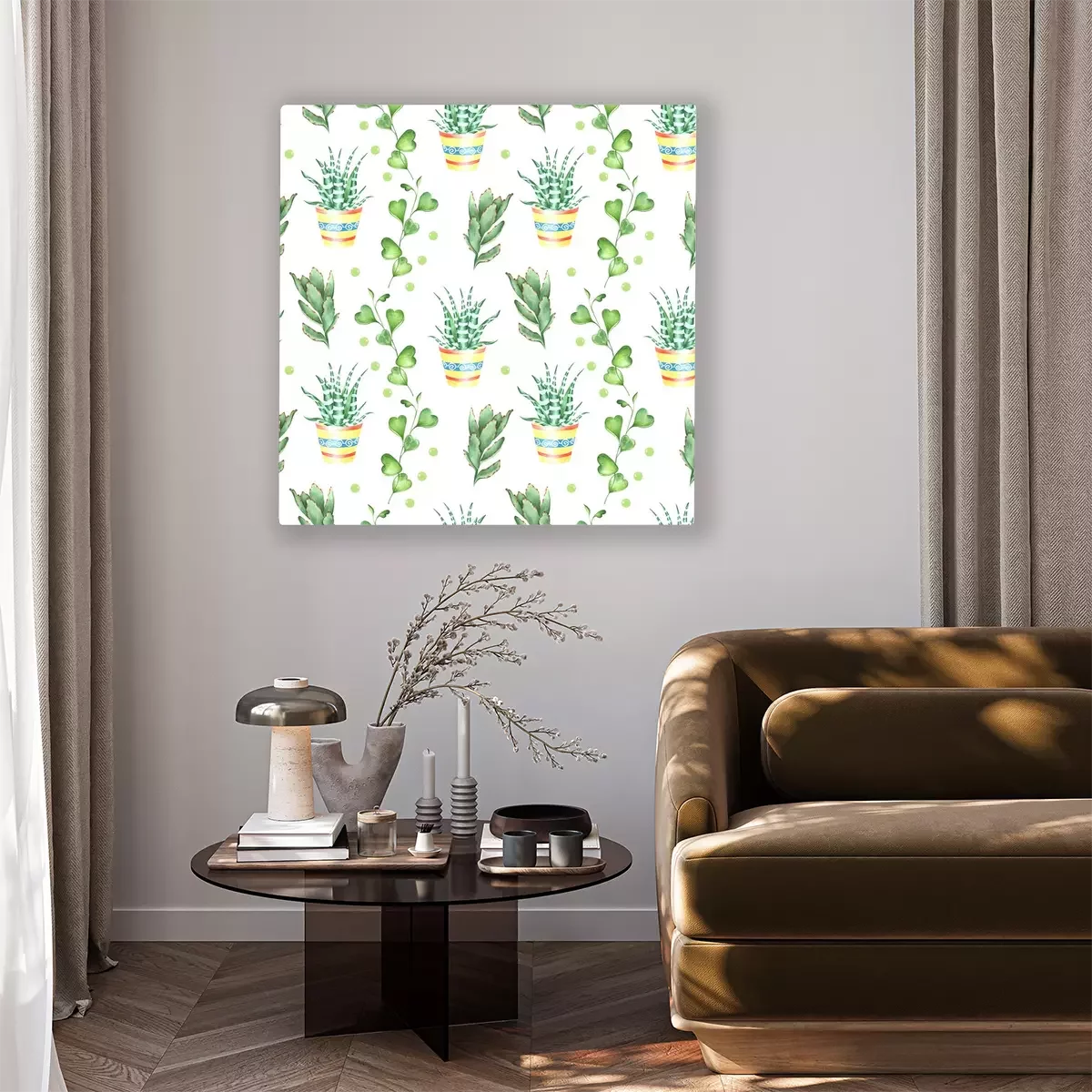 Tableau  Watercolor botanical seamless pattern in retro style with succulents, kalanchoe and zebra plant in a pot. Decorative floral background for wedding or fabric design in green, turquoise and red colors