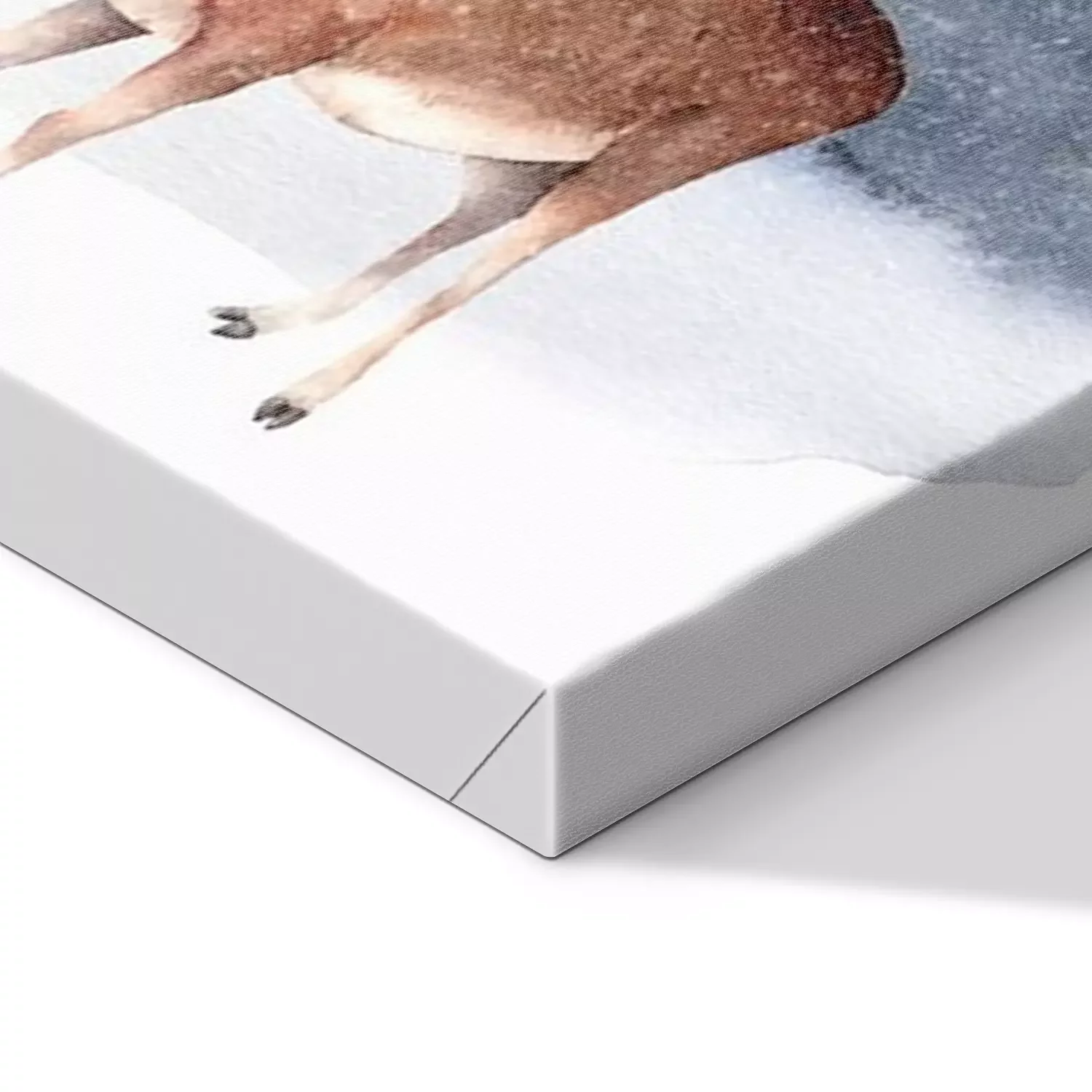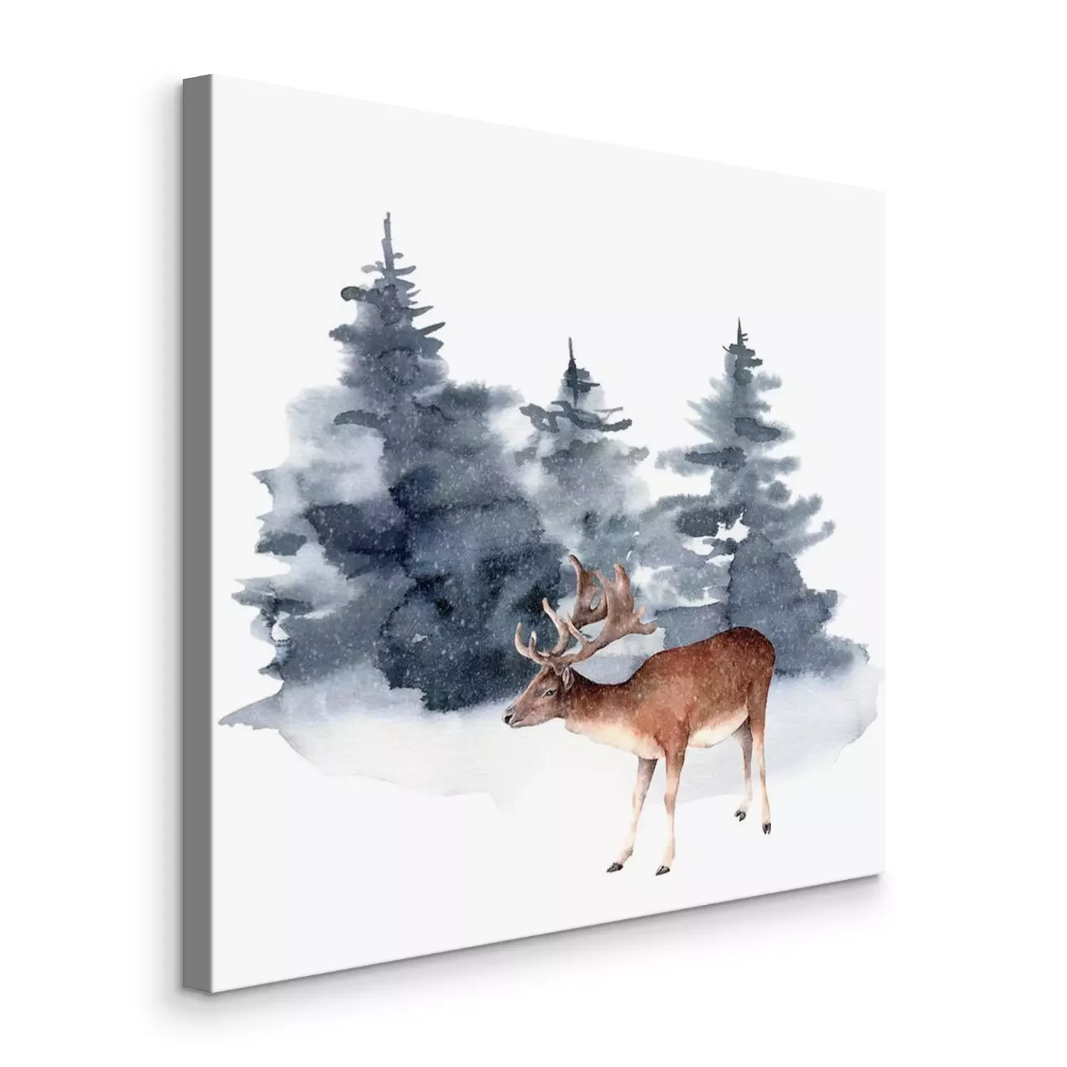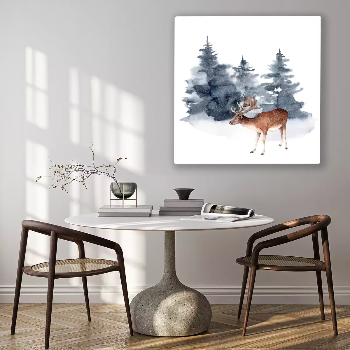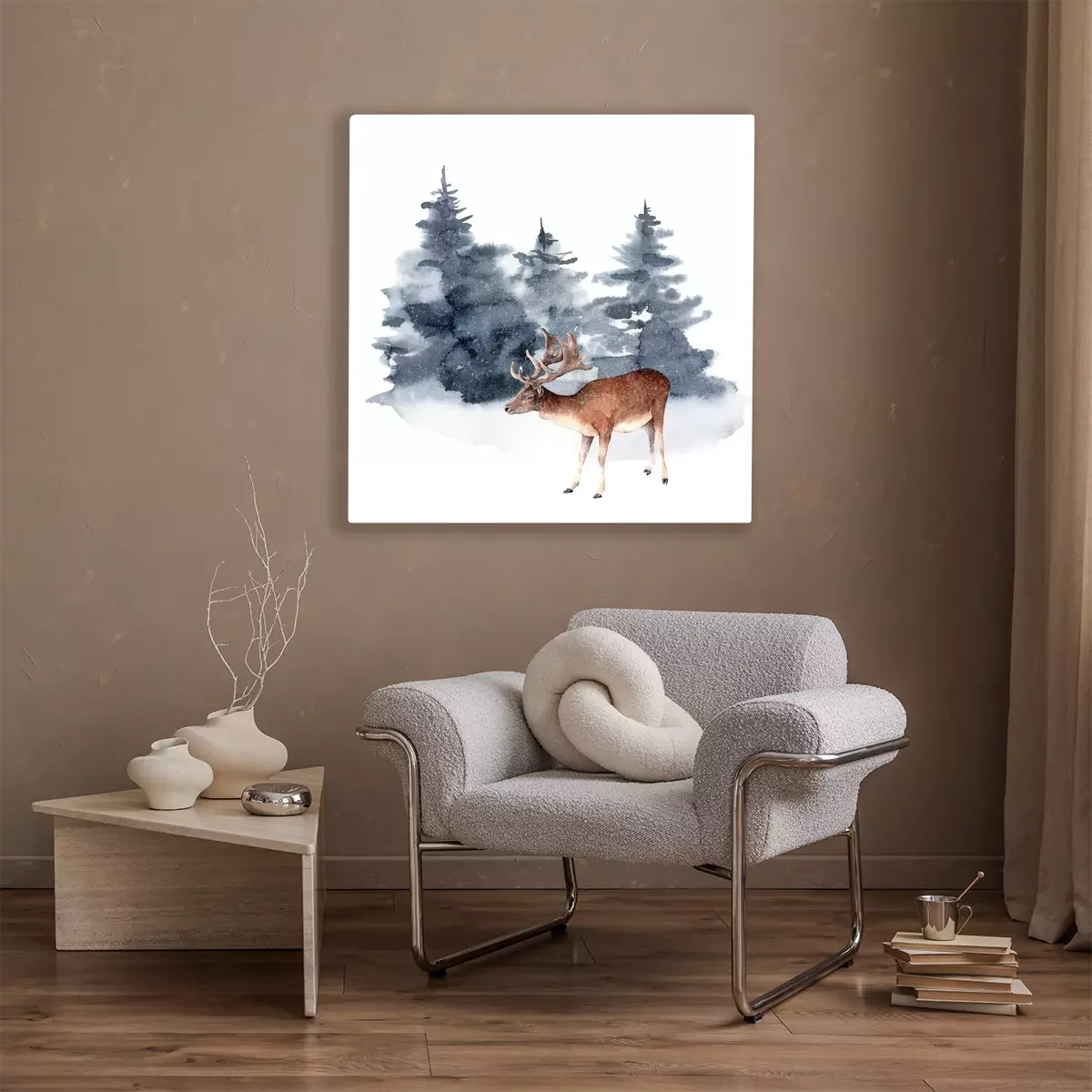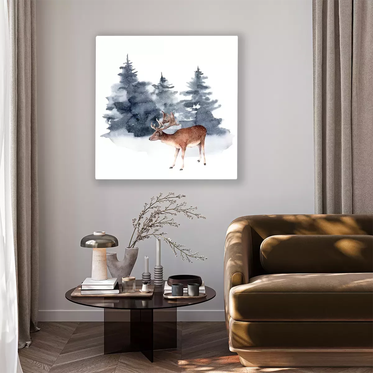 Tableau  Watercolor deer in winter forest. Hand painted Christmas illustration with animal and fir trees isolated on white background. Holiday card for design, print, fabric or background. Wildlife and foggy.