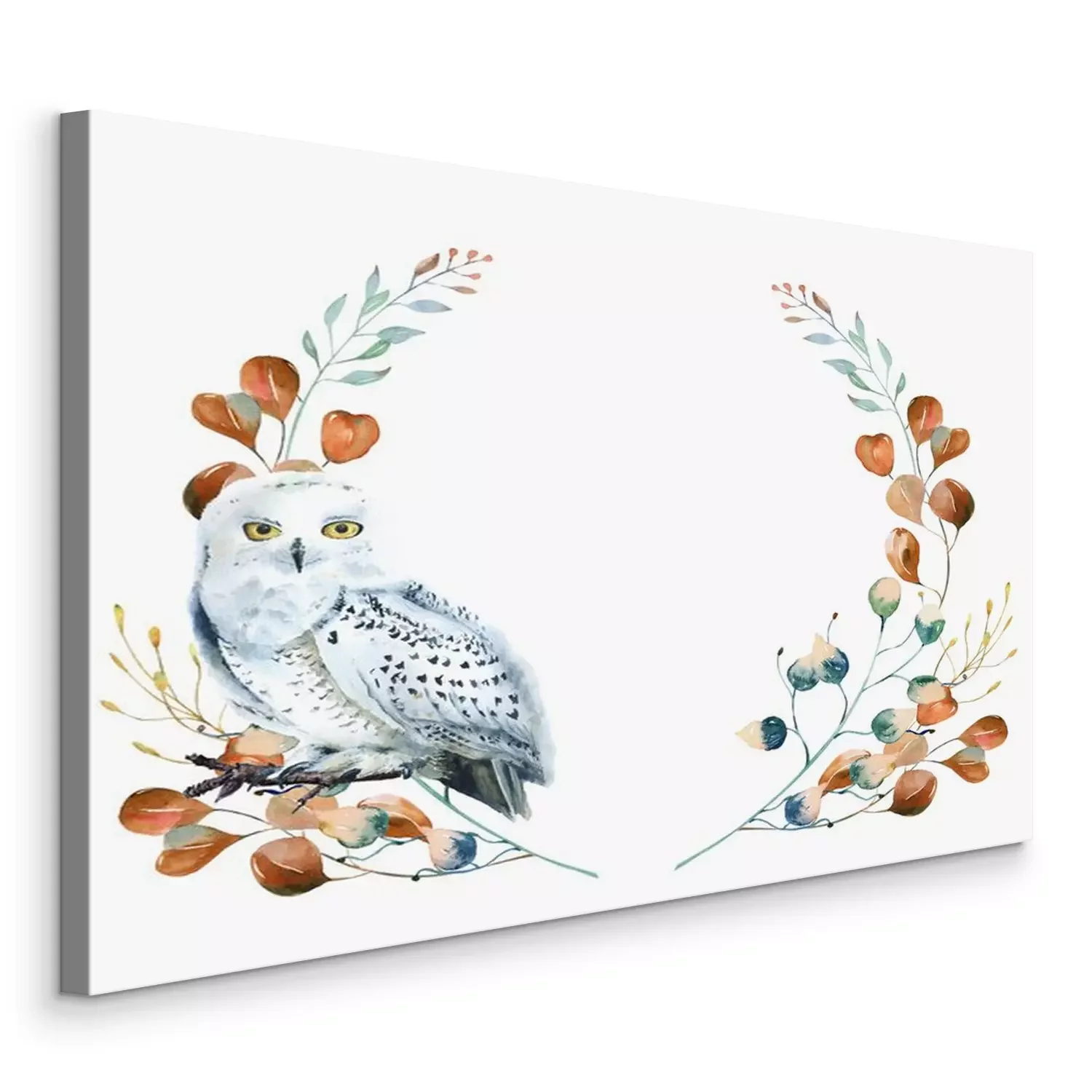 Tableau : Watercolor floral wreath with polar owl and leaves. Hand painted christmas frame with bird and leaves of silver dollar eucalyptus isolated on white background.