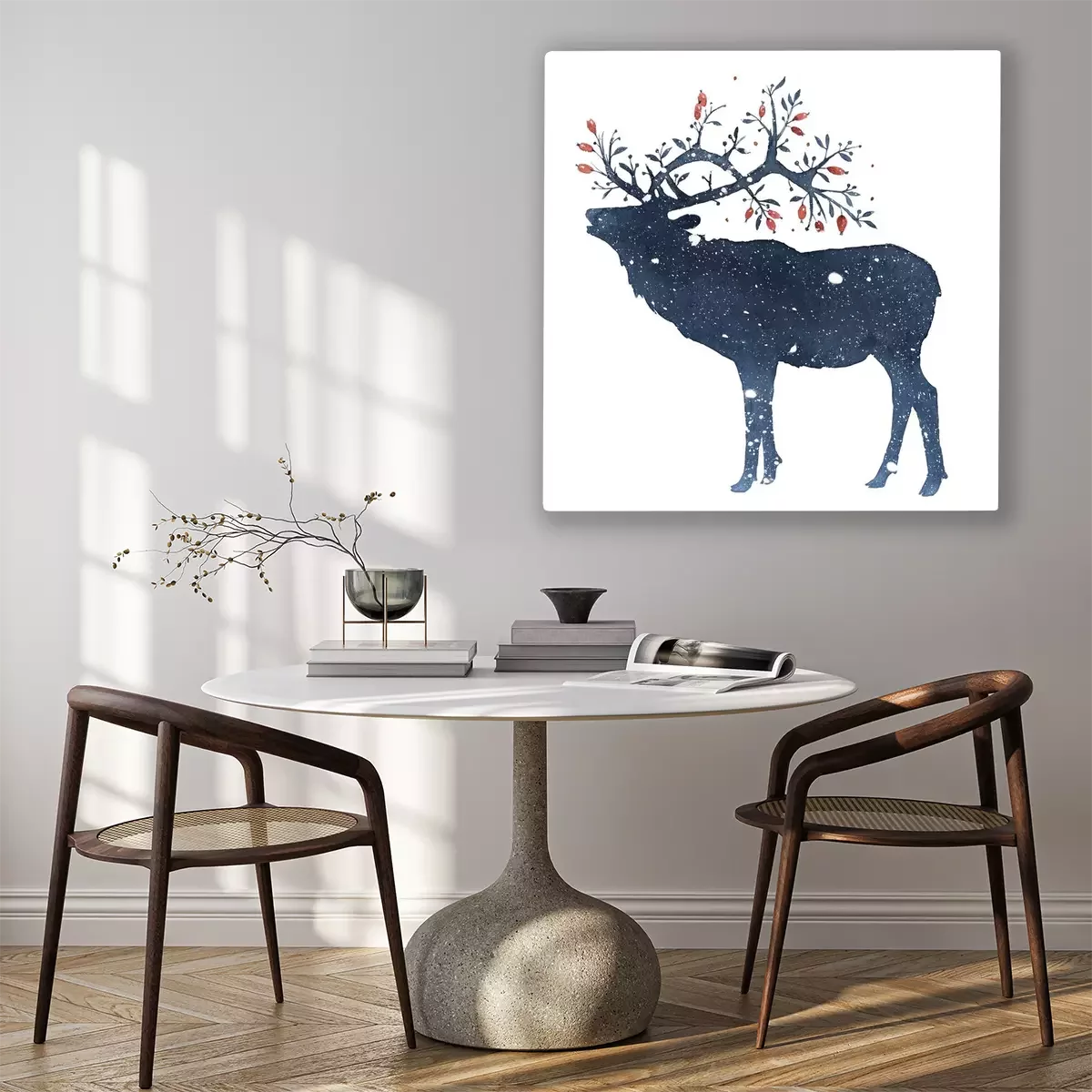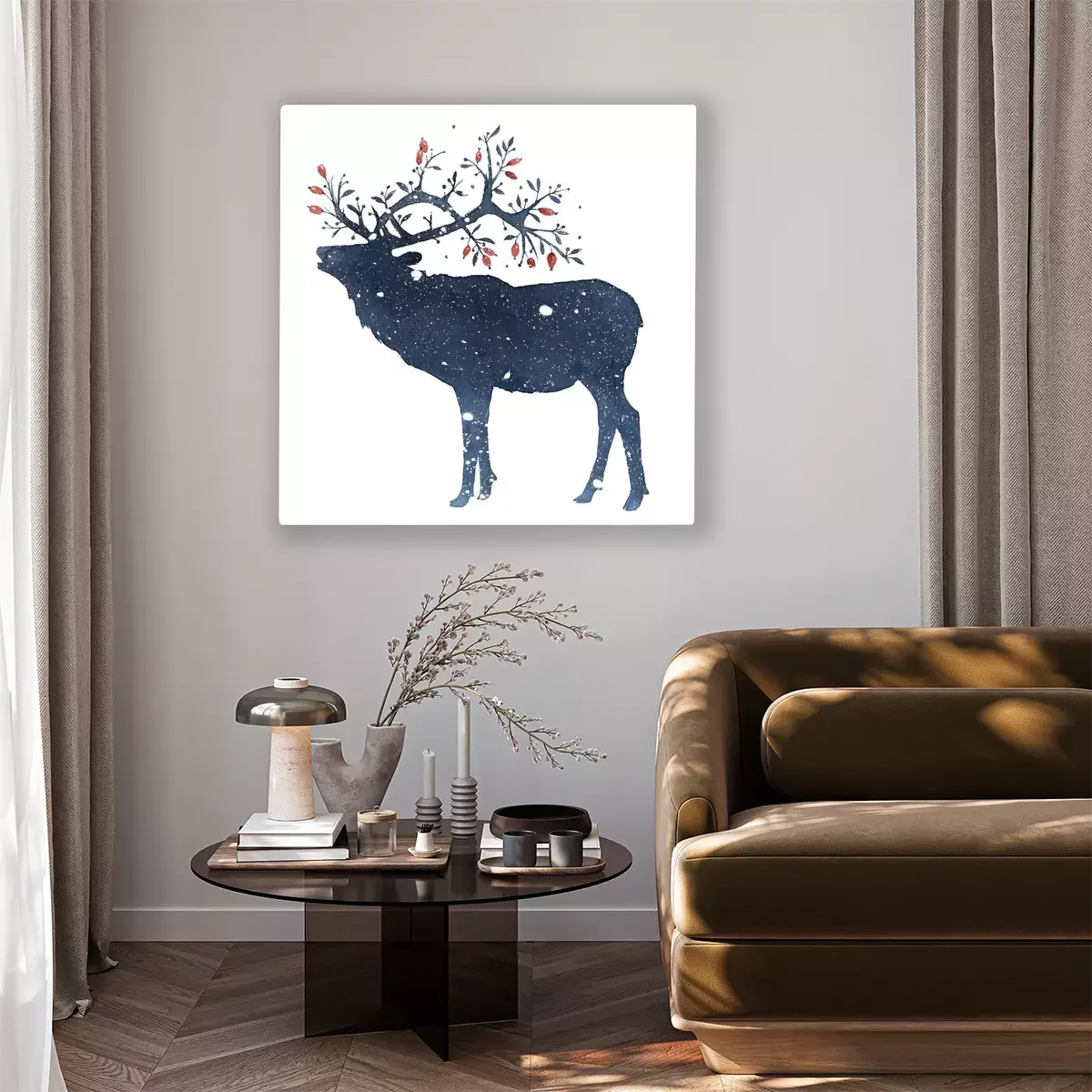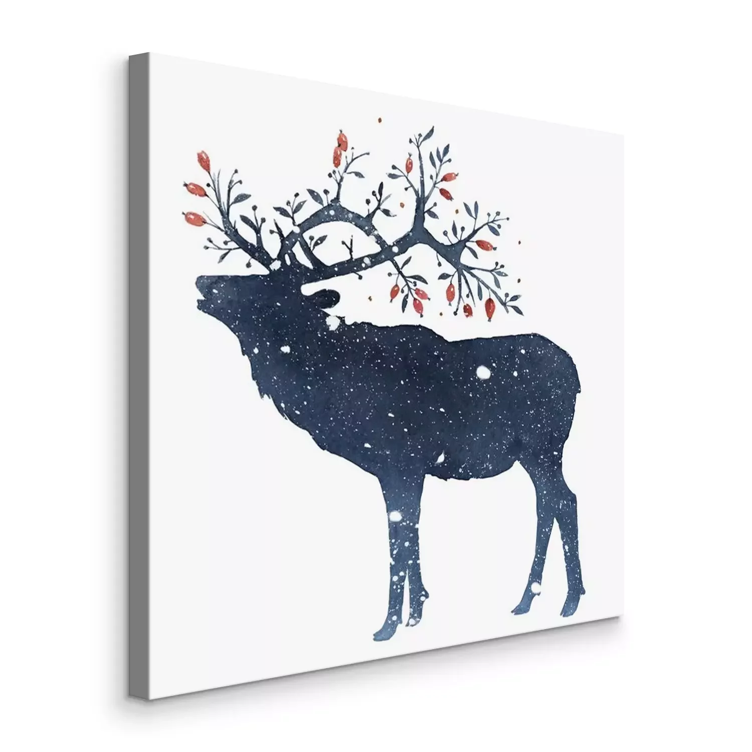 Tableau  Watercolor illustration of deer with magic horns in the snow isolated on white background