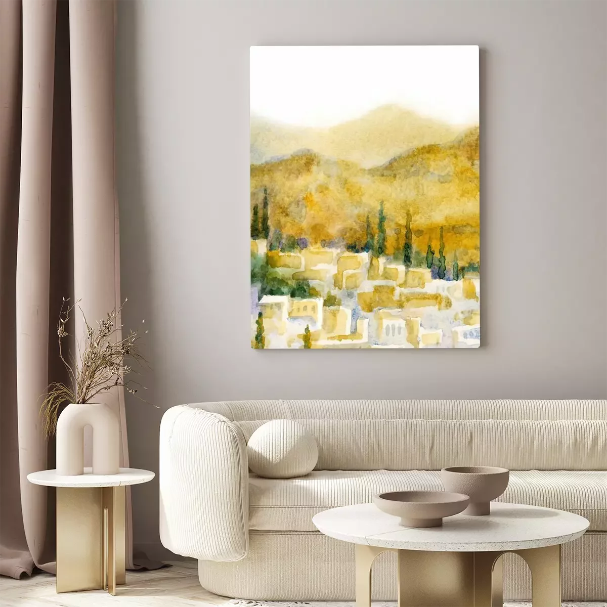 Tableau : Watercolor landscape. Old city in a valley between the mountains