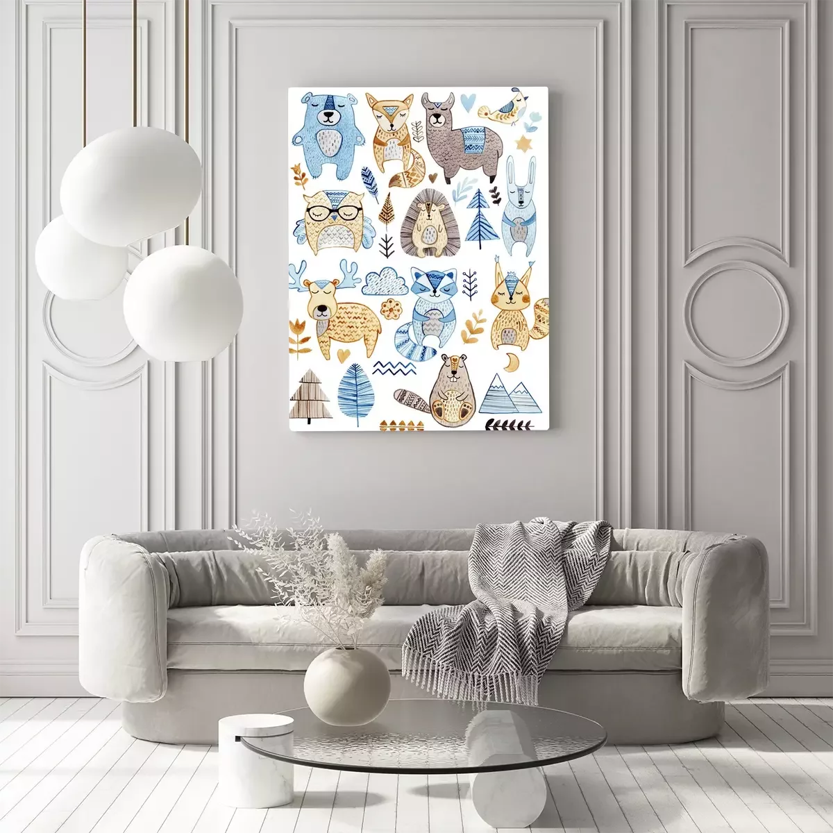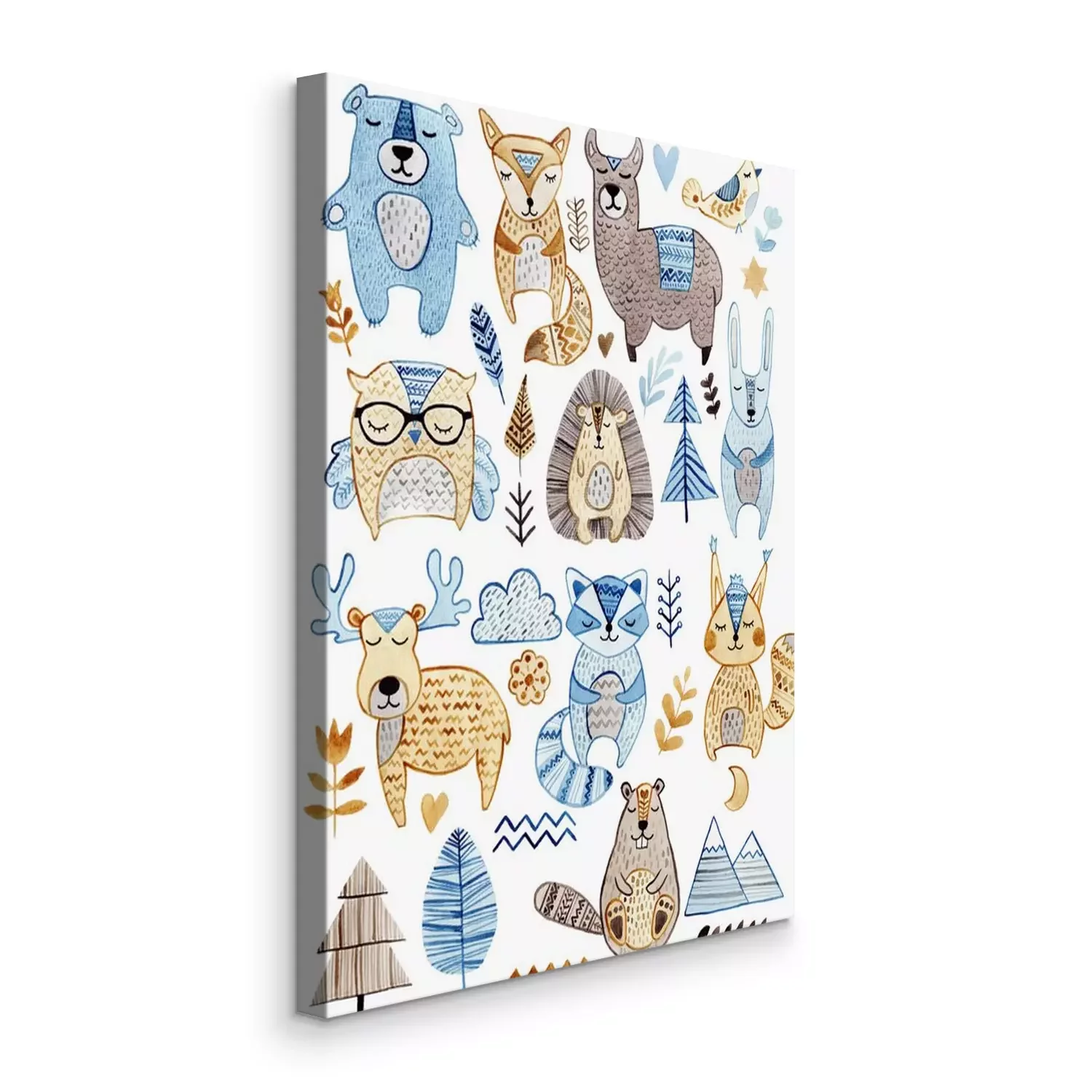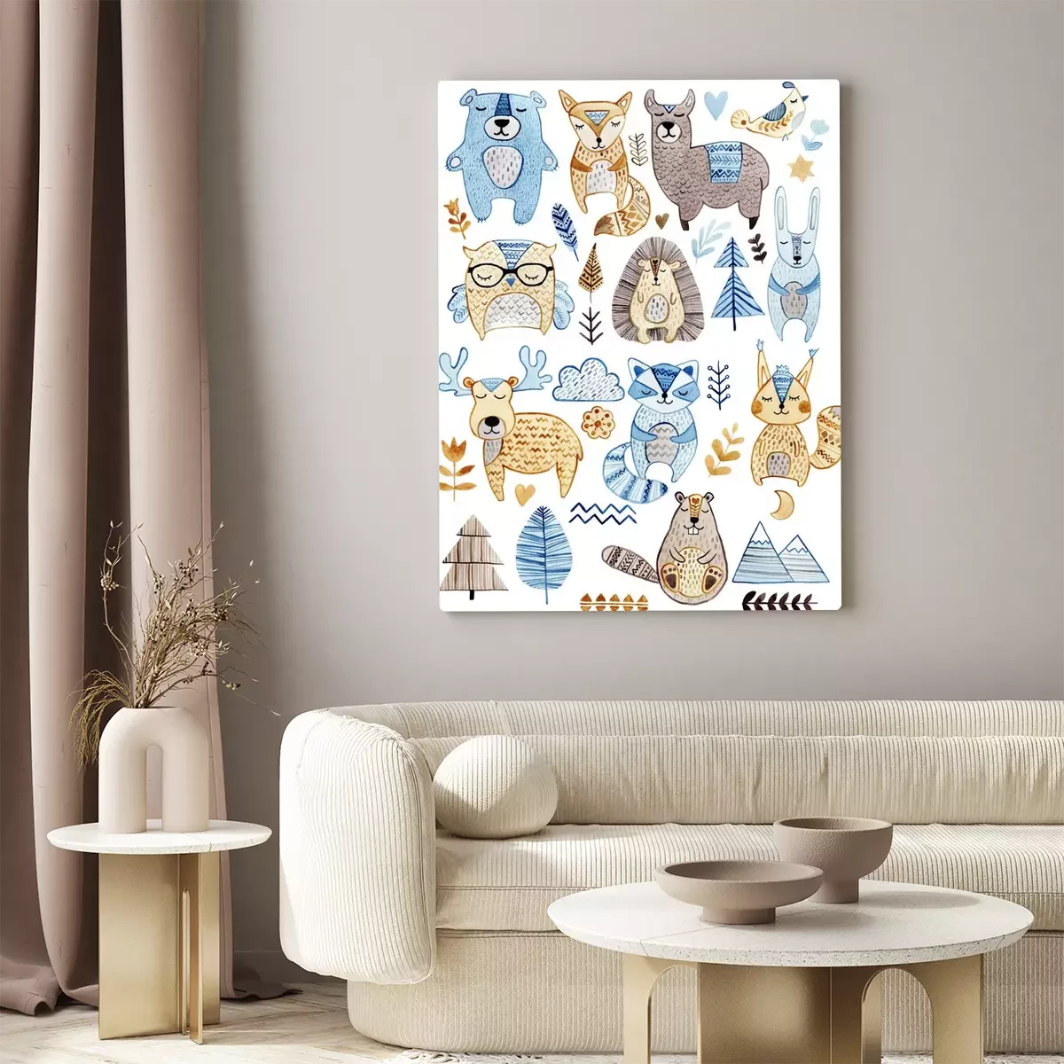 Tableau  Watercolor set with forest wildlife animals and herbs. Cute cartoon characters in scandinavian style. Best for textile, wallpaper, decoration, fabric, children design, wrapping paper