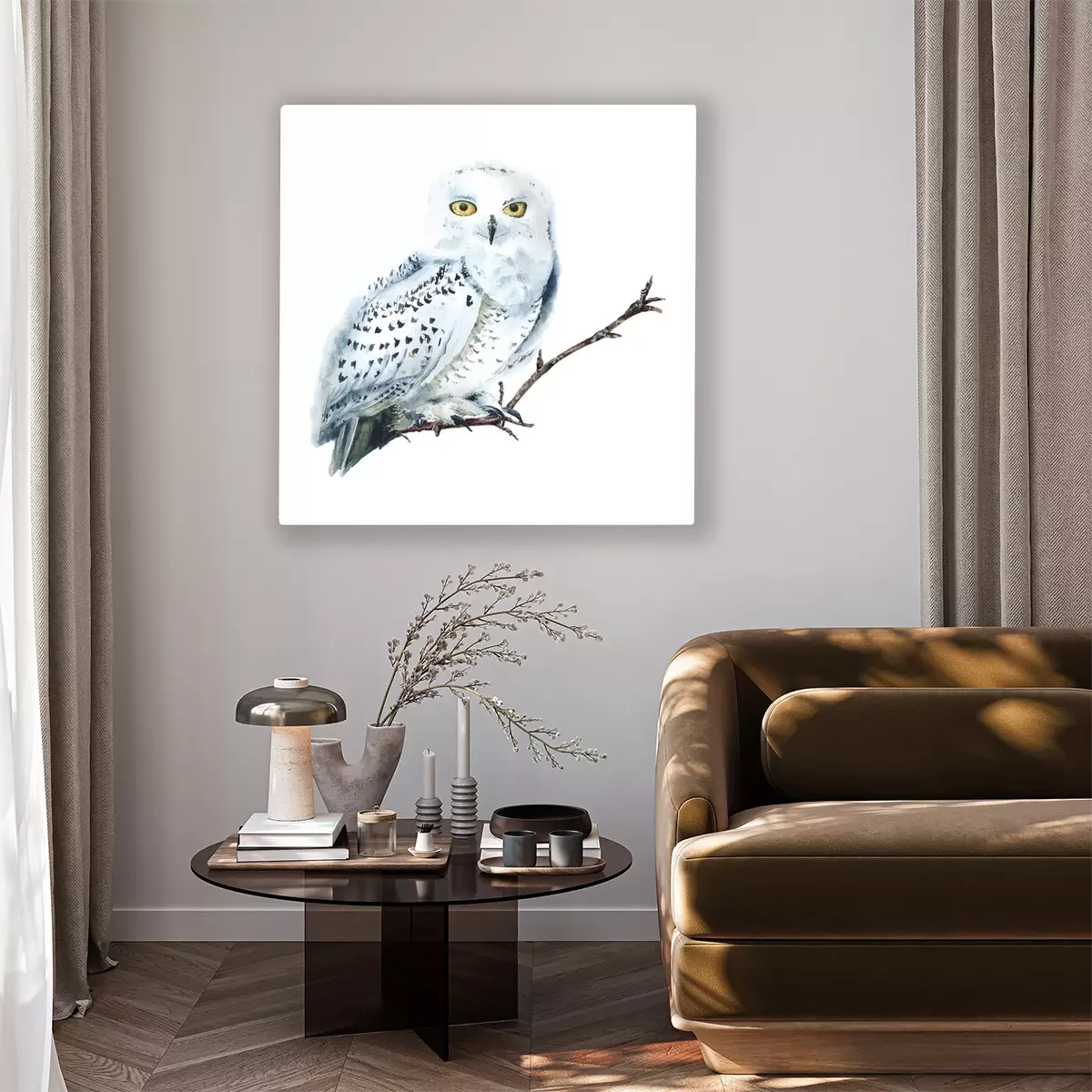 Tableau  Watercolor white polar owl isolated, Arctic bird. North fauna Illustration. Poster, wall-art. Scandinavian style. Winter prints.
